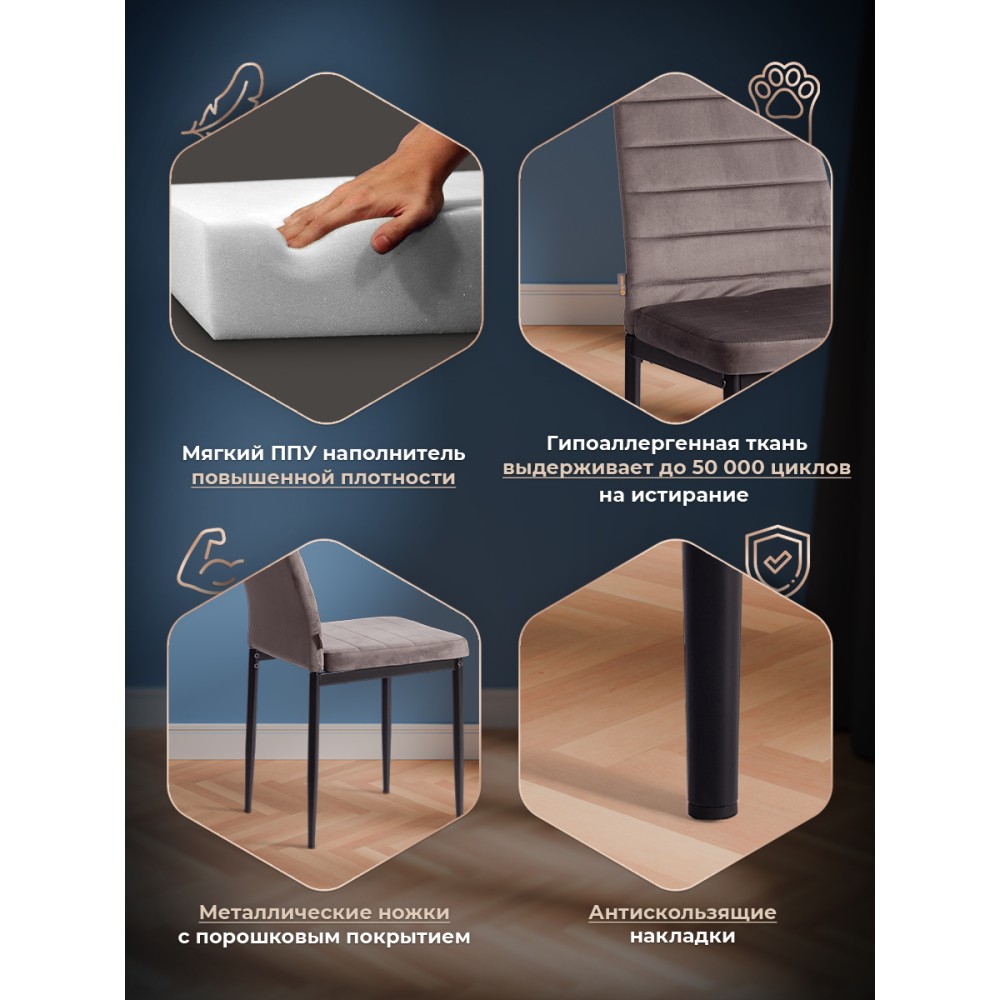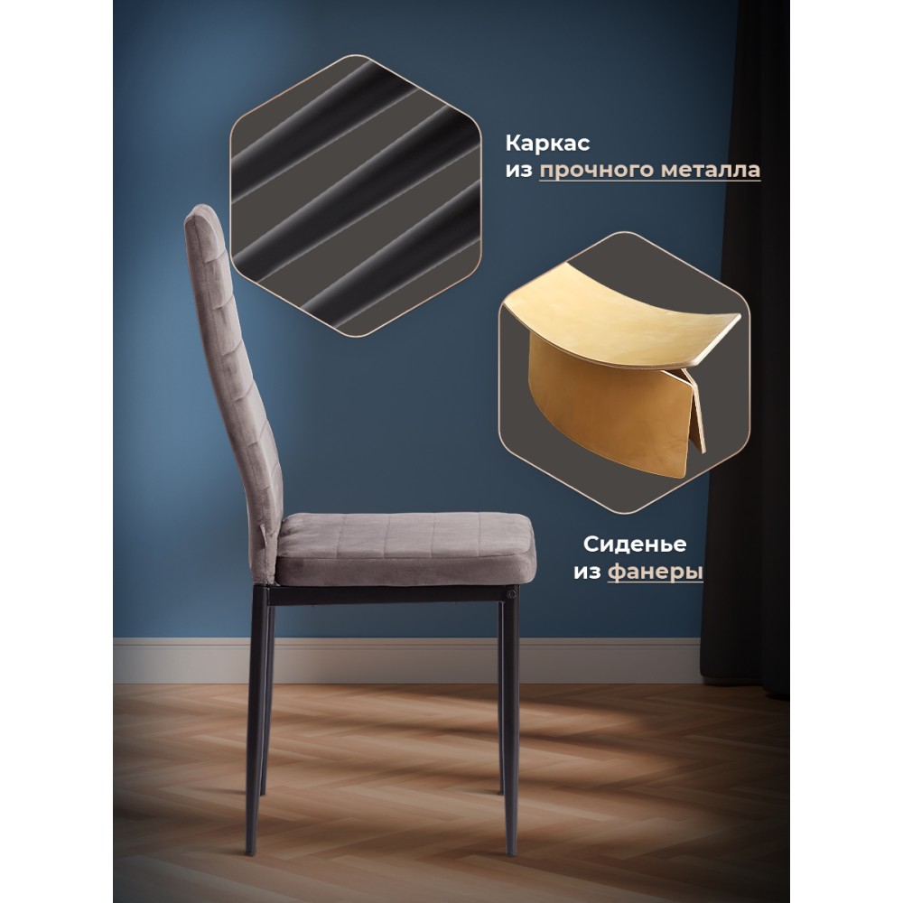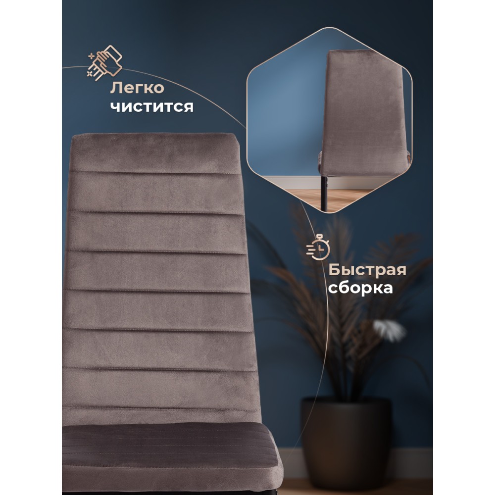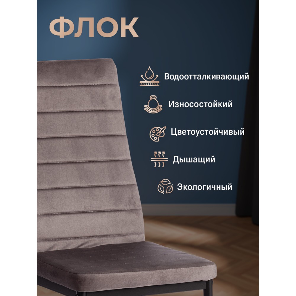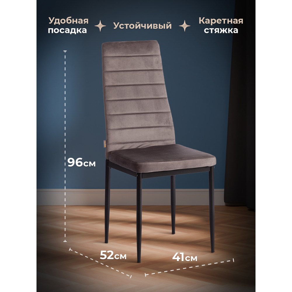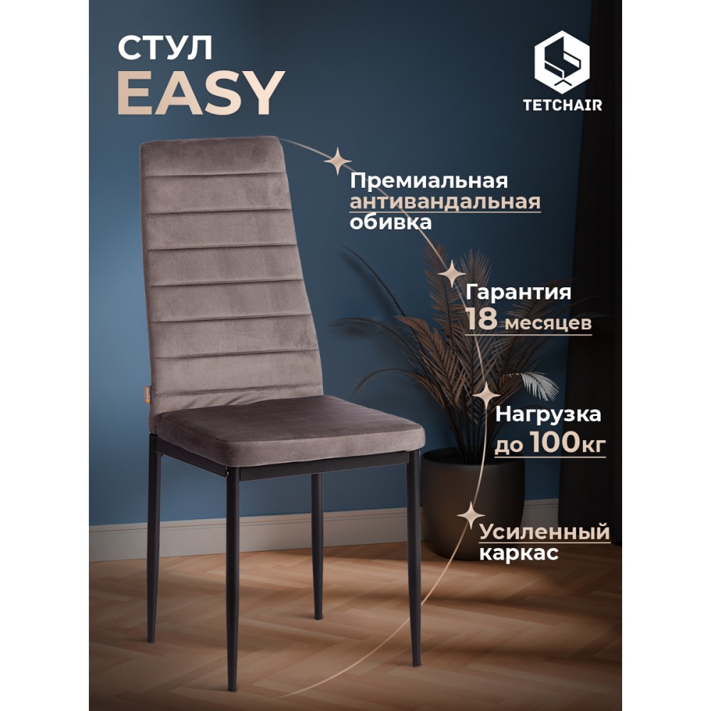Стильный стул Easy из коллекции Modern подчеркнет индивидуальность вашего интерьера, не перегружая его лишними деталями. Удобство, практичность и простота выгодно выделяют стул среди привычной мебели. Обивка из флока с горизонтальной прошивкой и тонкие металлические ножки, покрашенные порошковой краской, выглядят стильно и привлекательно. Удобное сиденье и высокая спинка позволяют комфортно расположиться на длительное время. Широко поставленные прочные ножки, делают модель крепкой и основательной. Стул может стать украшением загородного дома или городской квартиры. Обивка из флока темно - серого цвета – красивая, надежная, не требующая сложного ухода. Материал сочетает в себе мягкость и эластичность. Стул будет радовать вас своим первоначальным видом долгие годы. Стул подойдёт для гостиной, для кухни, для спальни, для кабинета, для офиса, для ресторана или для кафе. Стул очень прост в сборке, инструкция по сборке прилагается .Нагрузка 100 кг.