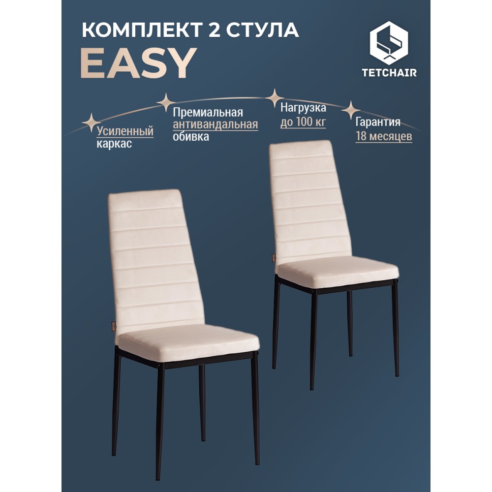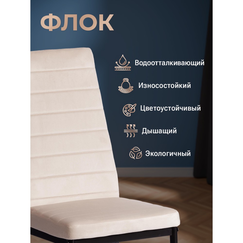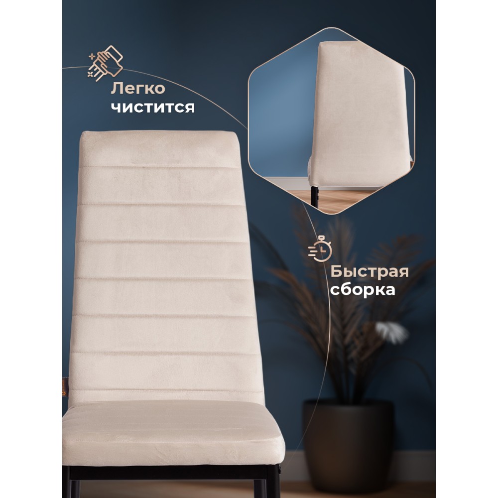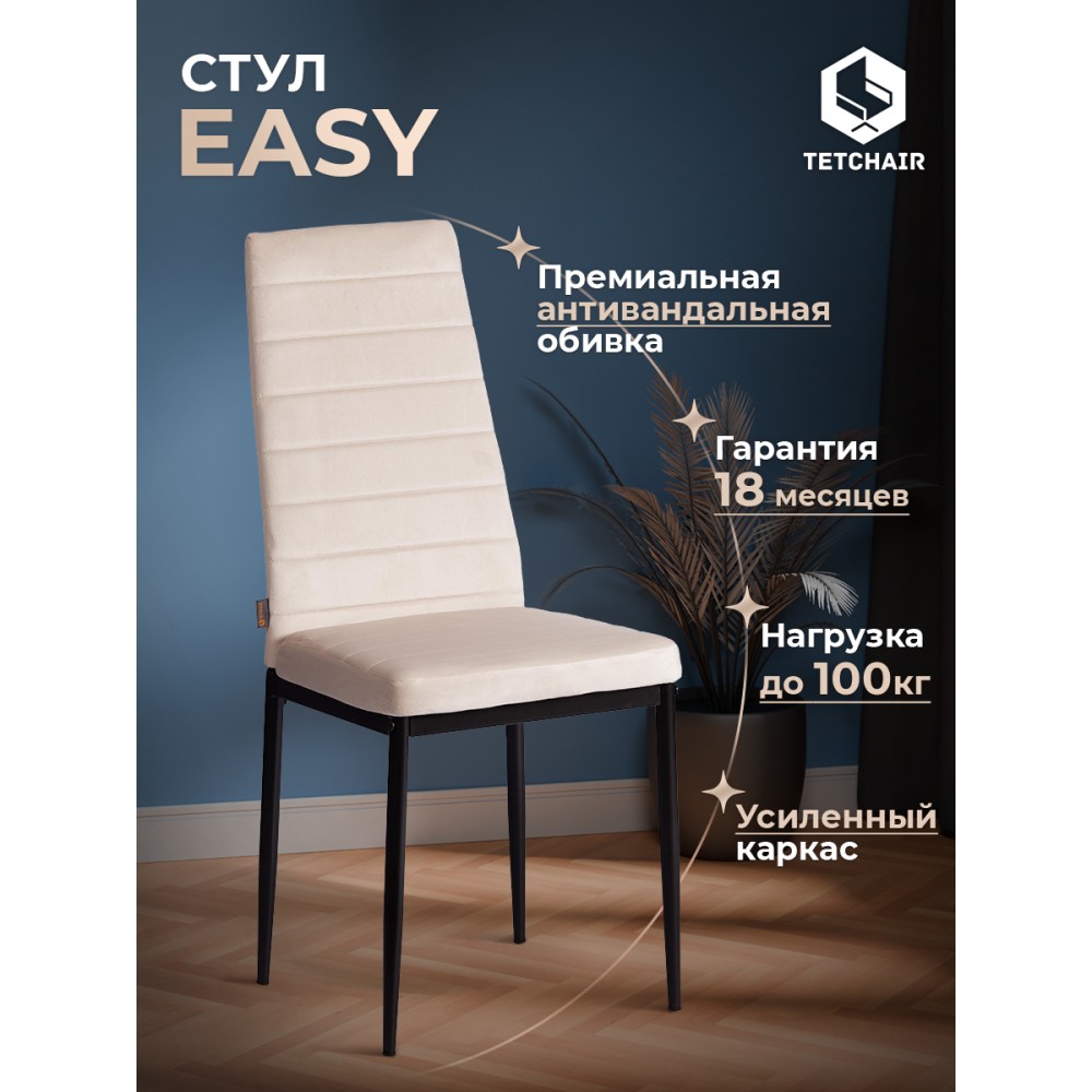 Стильный стул Easy из коллекции Modern подчеркнет индивидуальность вашего интерьера, не перегружая его лишними деталями. Удобство, практичность и простота выгодно выделяют стул среди привычной мебели. Обивка из флока с горизонтальной прошивкой и тонкие металлические ножки, покрашенные порошковой краской, выглядят стильно и привлекательно. Удобное сиденье и высокая спинка позволяют комфортно расположиться на длительное время. Широко поставленные прочные ножки, делают модель крепкой и основательной. Стул может стать украшением загородного дома или городской квартиры. Обивка из флока бежевого цвета – красивая, надежная, не требующая сложного ухода. Материал сочетает в себе мягкость и эластичность. Стул будет радовать вас своим первоначальным видом долгие годы. Стул подойдёт для гостиной, для кухни, для спальни, для кабинета, для офиса, для ресторана или для кафе. Стул очень прост в сборке, инструкция по сборке прилагается .Нагрузка 100 кг.