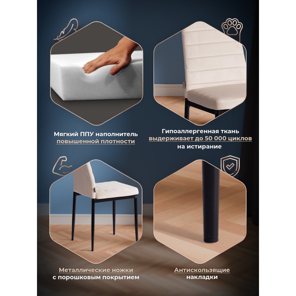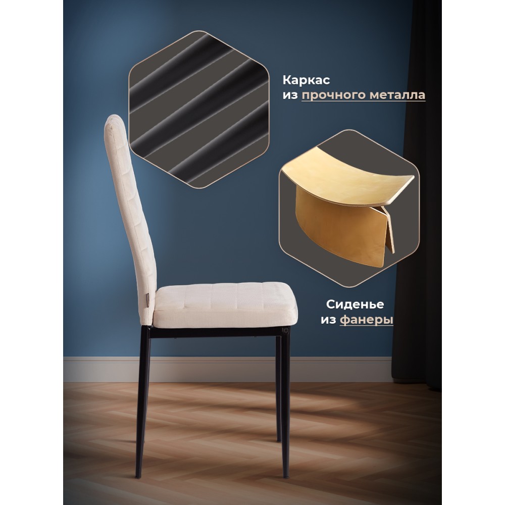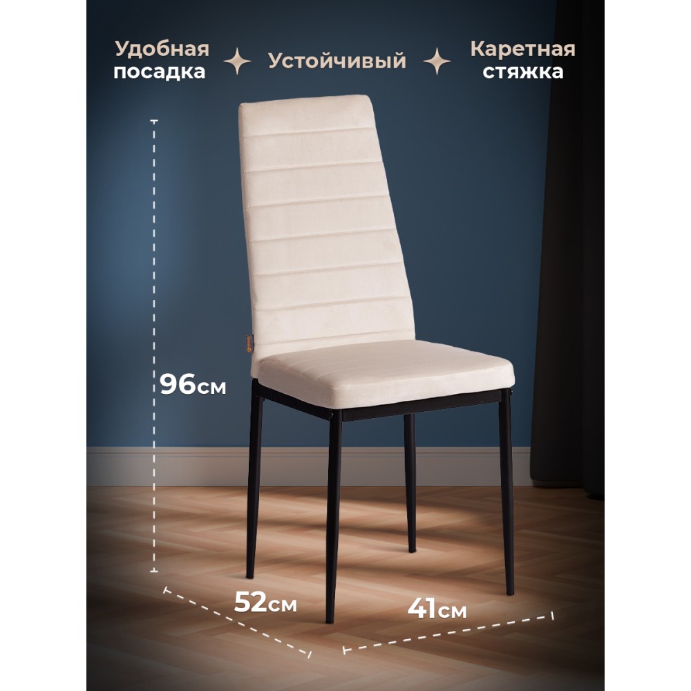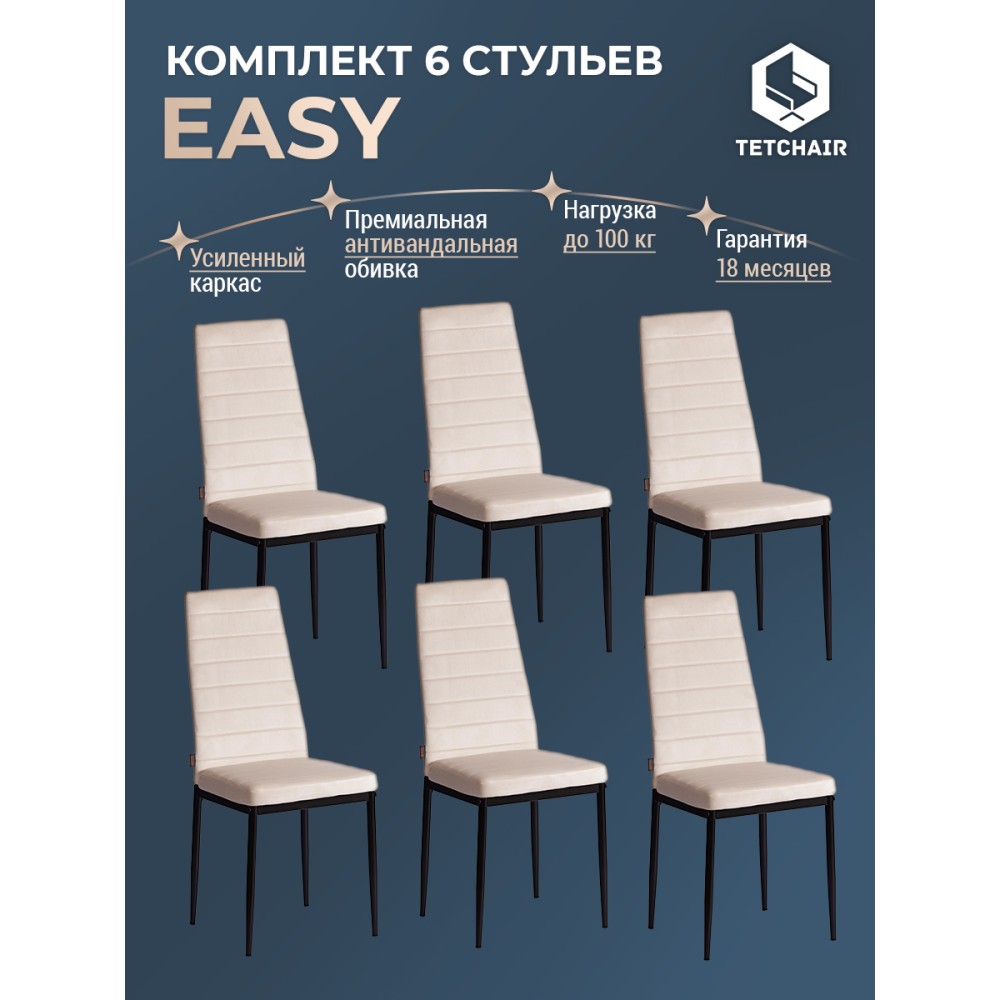 Стильный стул Easy из коллекции Modern подчеркнет индивидуальность вашего интерьера, не перегружая его лишними деталями. Удобство, практичность и простота выгодно выделяют стул среди привычной мебели. Обивка из флока с горизонтальной прошивкой и тонкие металлические ножки, покрашенные порошковой краской, выглядят стильно и привлекательно. Удобное сиденье и высокая спинка позволяют комфортно расположиться на длительное время. Широко поставленные прочные ножки, делают модель крепкой и основательной. Стул может стать украшением загородного дома или городской квартиры. Обивка из флока бежевого цвета – красивая, надежная, не требующая сложного ухода. Материал сочетает в себе мягкость и эластичность. Стул будет радовать вас своим первоначальным видом долгие годы. Стул подойдёт для гостиной, для кухни, для спальни, для кабинета, для офиса, для ресторана или для кафе. Стул очень прост в сборке, инструкция по сборке прилагается .Нагрузка 100 кг.