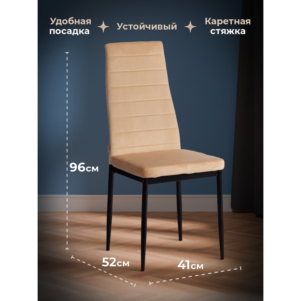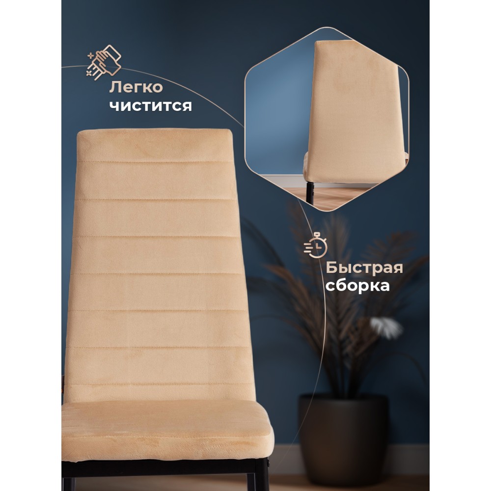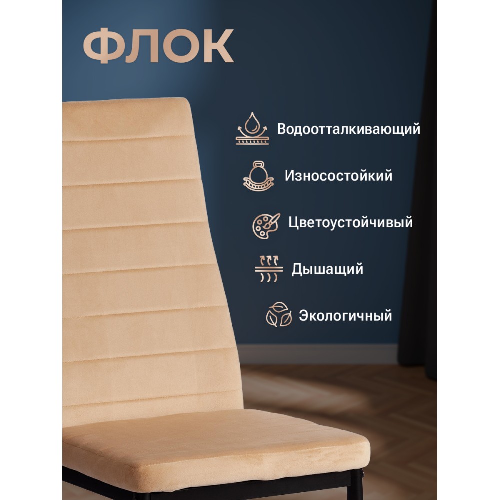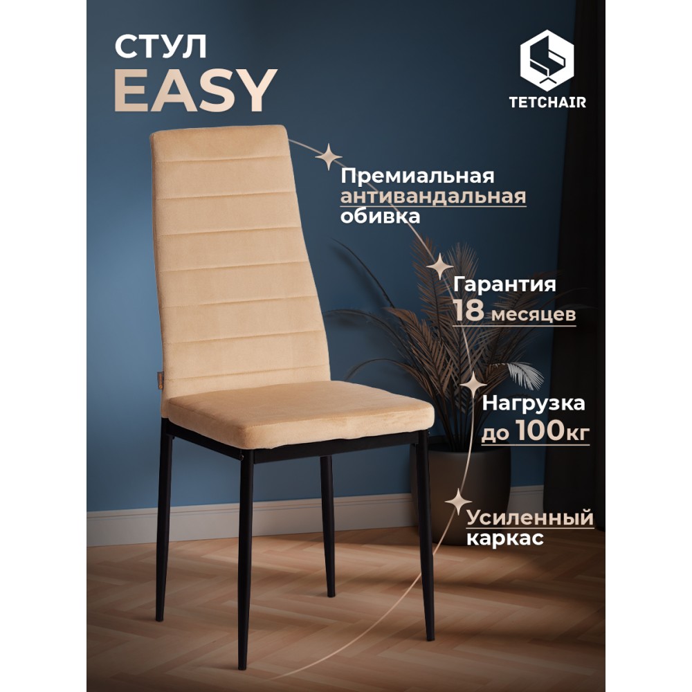 Стильный стул Easy из коллекции Modern подчеркнет индивидуальность вашего интерьера, не перегружая его лишними деталями. Удобство, практичность и простота выгодно выделяют стул среди привычной мебели. Обивка из флока с горизонтальной прошивкой и тонкие металлические ножки, покрашенные порошковой краской, выглядят стильно и привлекательно. Удобное сиденье и высокая спинка позволяют комфортно расположиться на длительное время. Широко поставленные прочные ножки, делают модель крепкой и основательной. Стул может стать украшением загородного дома или городской квартиры. Обивка из флока песочного цвета – красивая, надежная, не требующая сложного ухода. Материал сочетает в себе мягкость и эластичность. Стул будет радовать вас своим первоначальным видом долгие годы. Стул подойдёт для гостиной, для кухни, для спальни, для кабинета, для офиса, для ресторана или для кафе. Стул очень прост в сборке, инструкция по сборке прилагается. Нагрузка 100 кг.