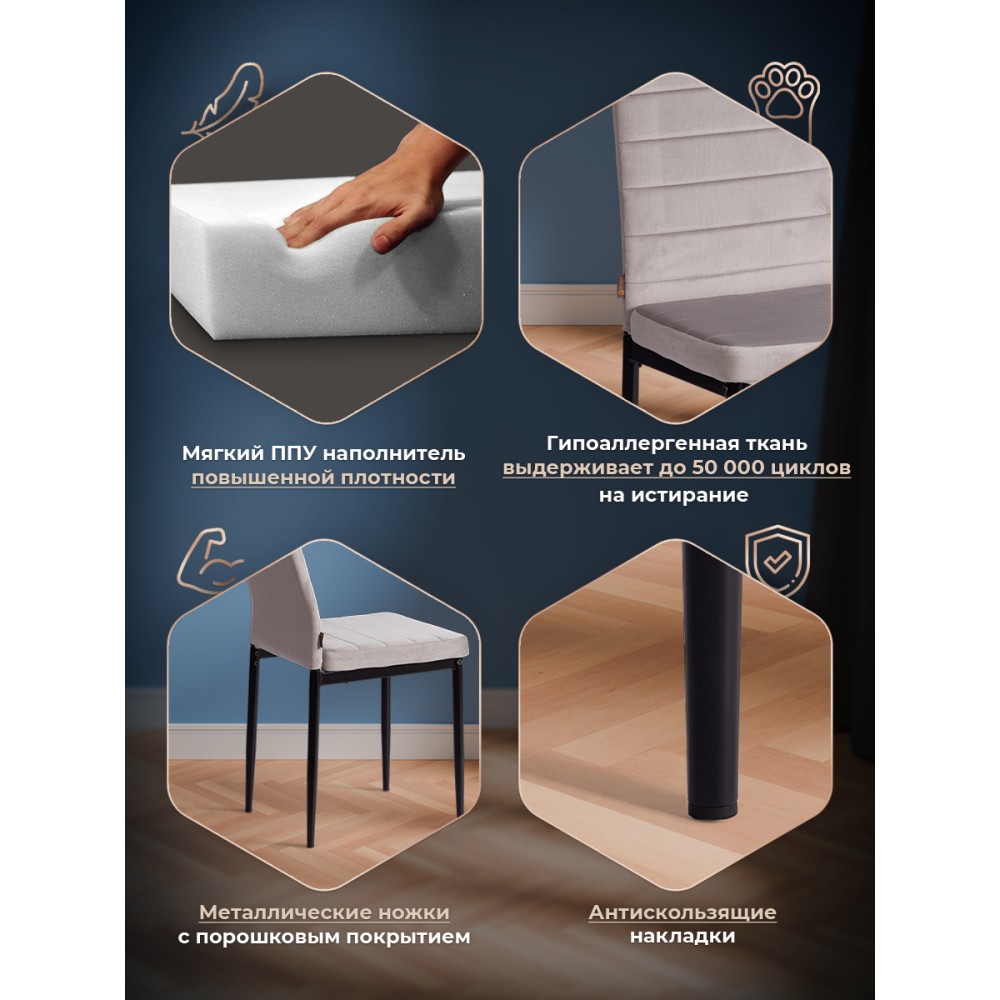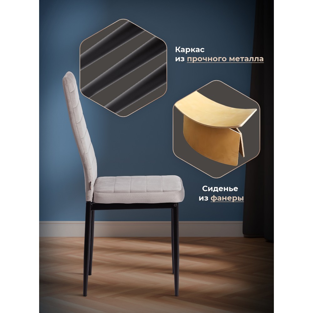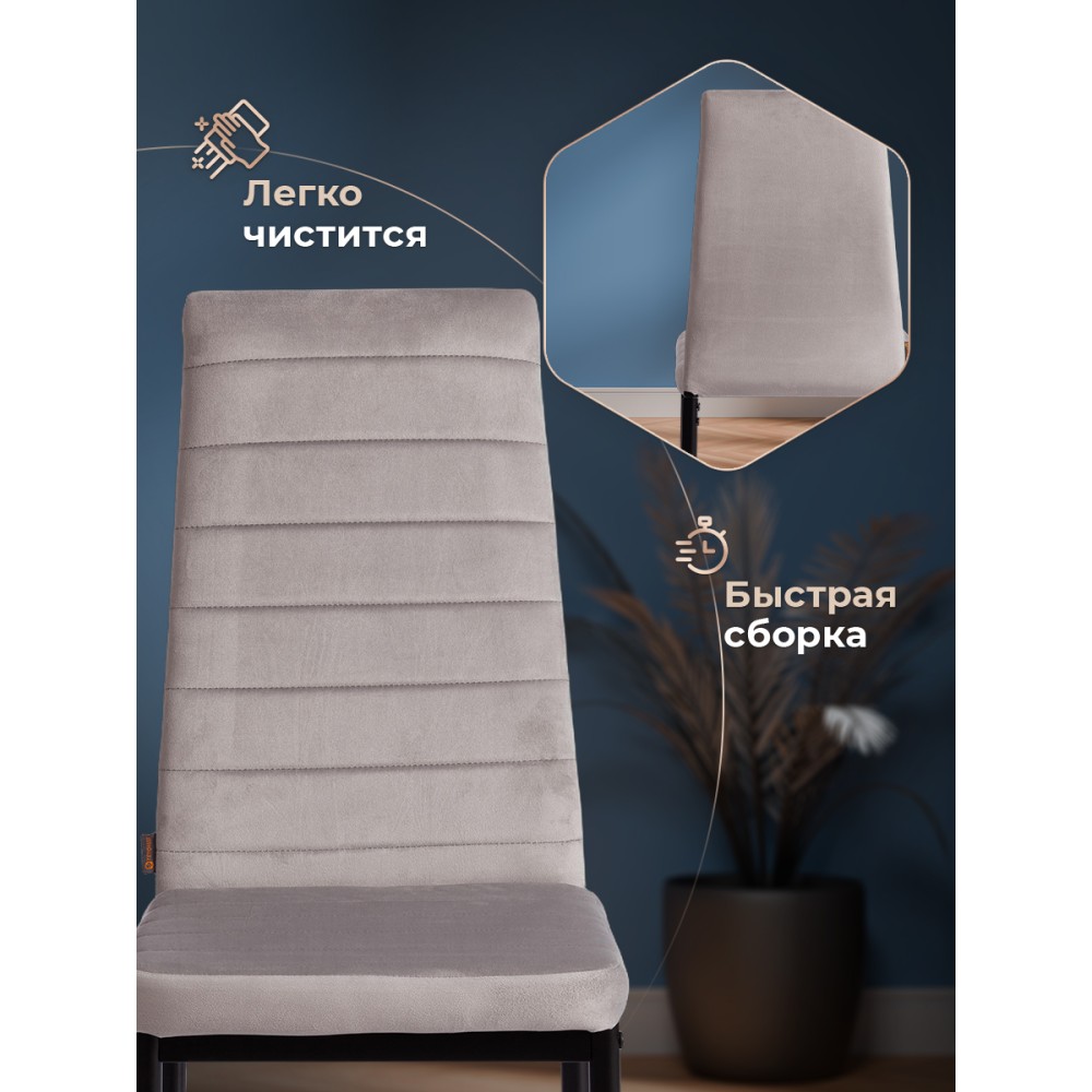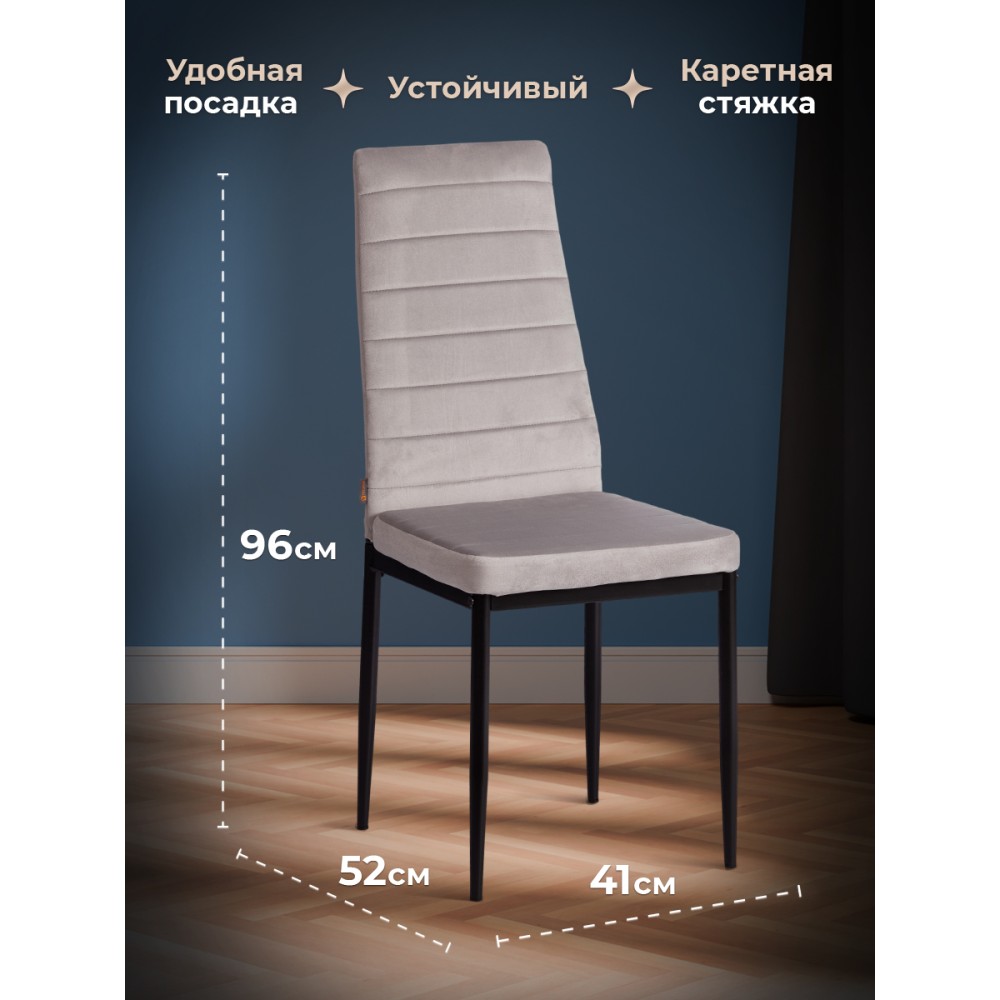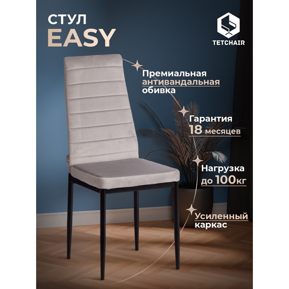 Стильный стул Easy из коллекции Modern подчеркнет индивидуальность вашего интерьера, не перегружая его лишними деталями. Удобство, практичность и простота выгодно выделяют стул среди привычной мебели. Обивка из флока с горизонтальной прошивкой и тонкие металлические ножки, покрашенные порошковой краской, выглядят стильно и привлекательно. Удобное сиденье и высокая спинка позволяют комфортно расположиться на длительное время. Широко поставленные прочные ножки, делают модель крепкой и основательной. Стул может стать украшением загородного дома или городской квартиры. Обивка из флока светло - серого цвета – красивая, надежная, не требующая сложного ухода. Материал сочетает в себе мягкость и эластичность. Стул будет радовать вас своим первоначальным видом долгие годы. Стул подойдёт для гостиной, для кухни, для спальни, для кабинета, для офиса, для ресторана или для кафе. Стул очень прост в сборке, инструкция по сборке прилагается. Нагрузка 100 кг.