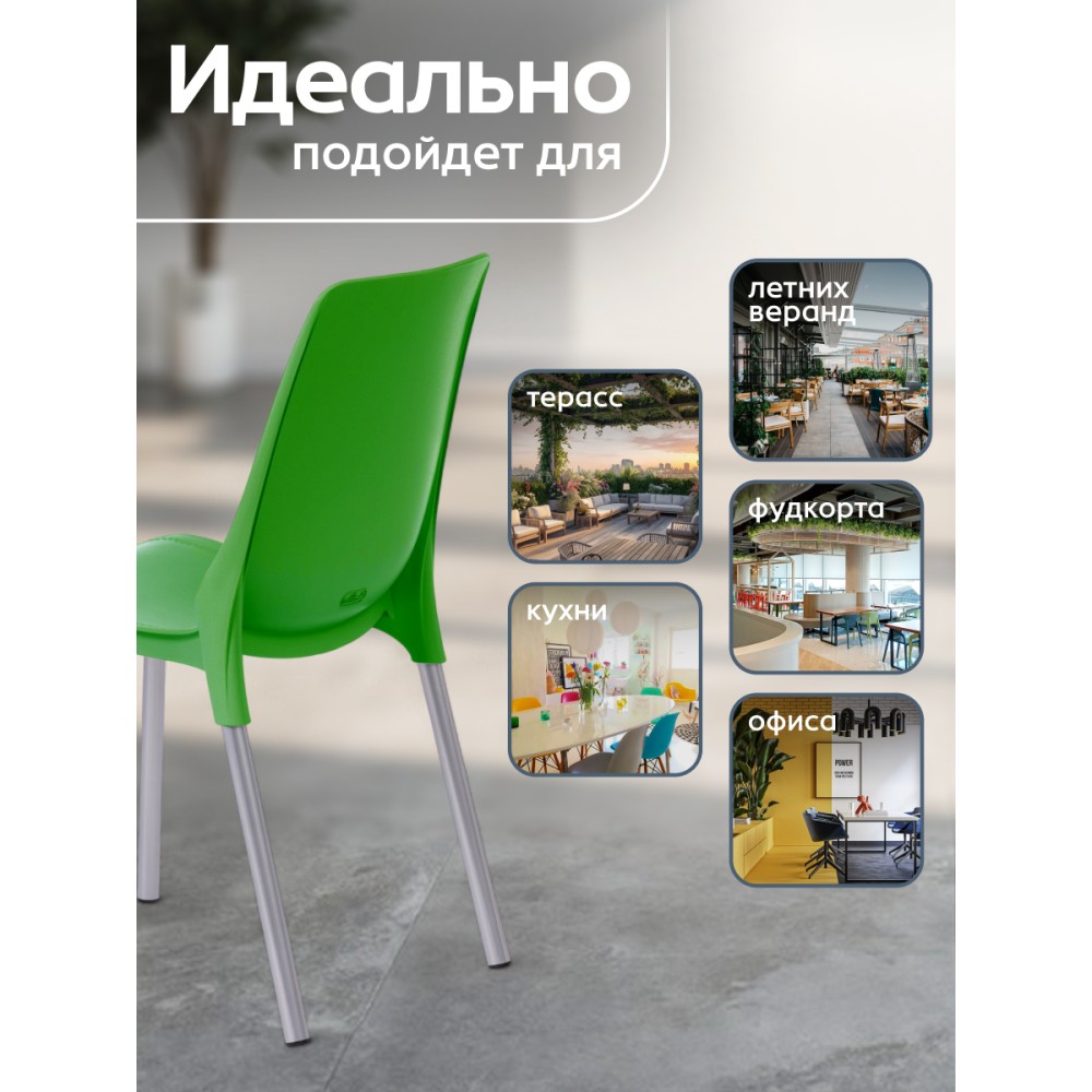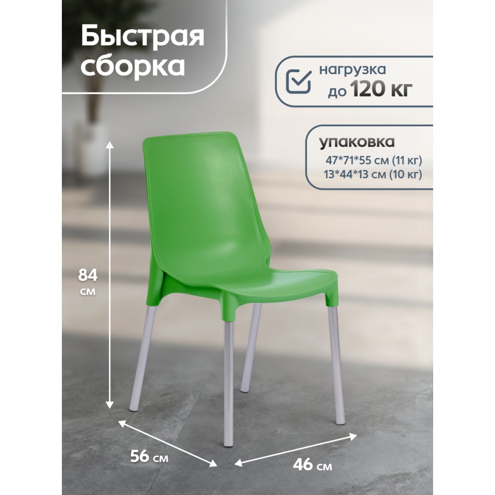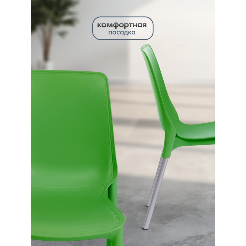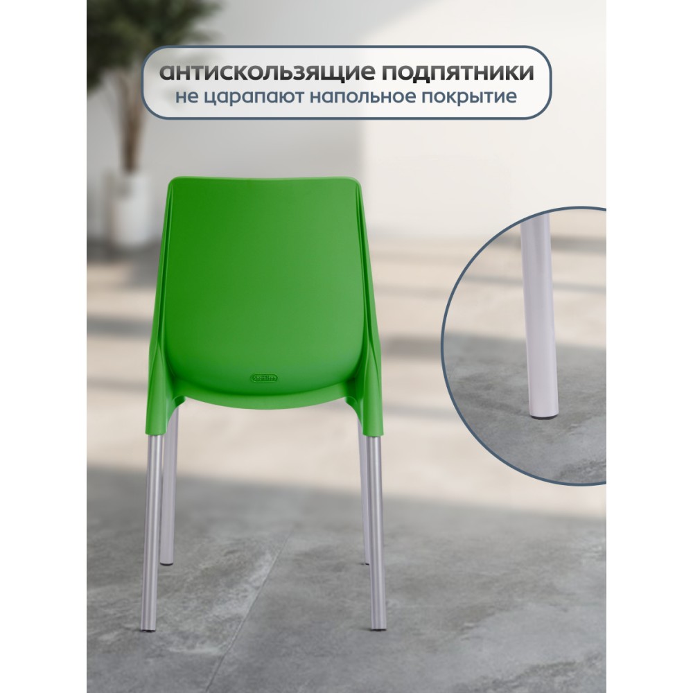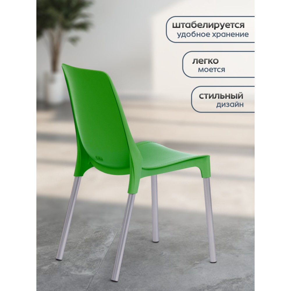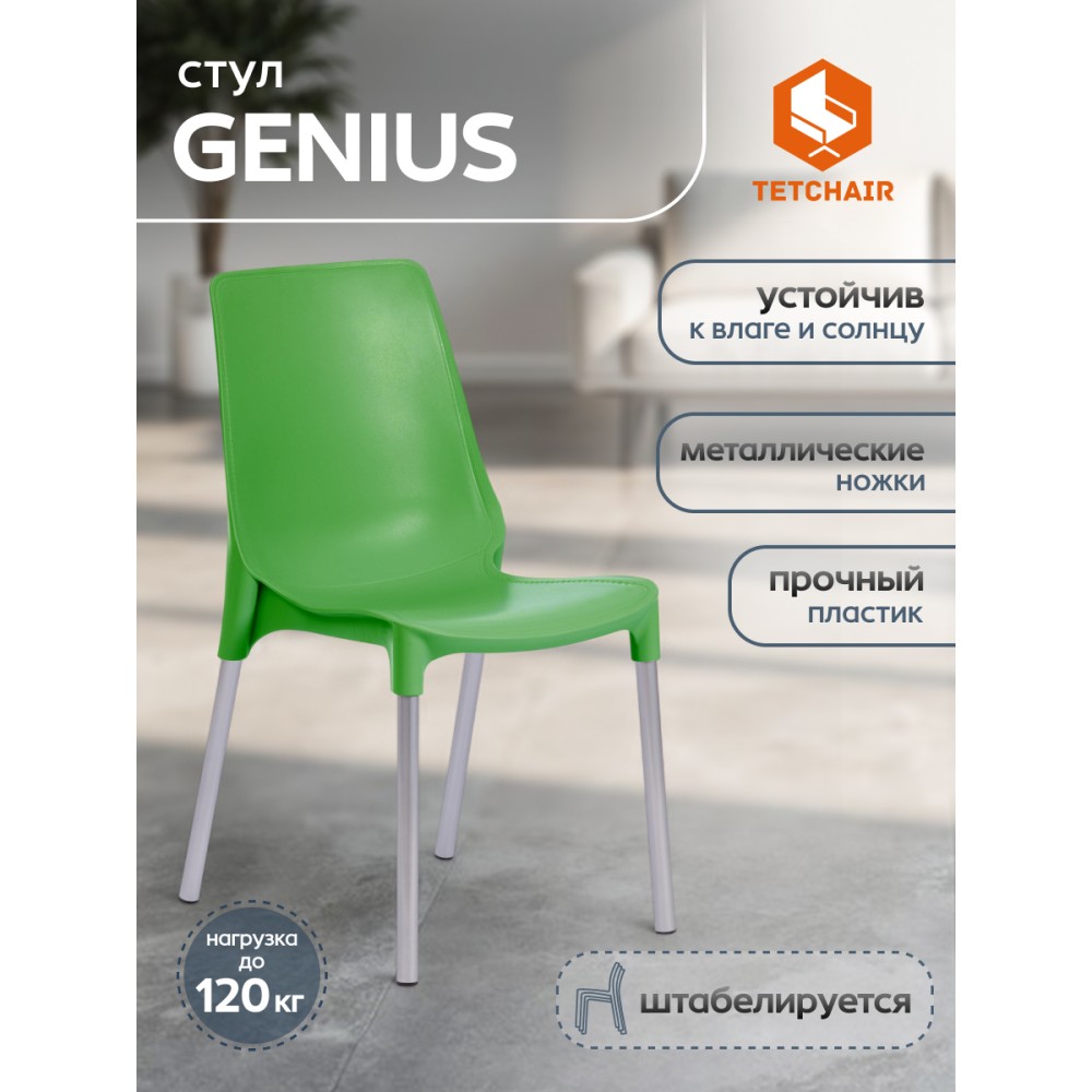 Простой и комфортный стул GENIUS из коллекции Modern станет незаменимым предметом интерьера в городской квартире, на загородной веранде или приусадебном участке. Стул может украсить любое пространство, изменить обстановку в лучшую сторону, наполнить интерьер легкостью и уютом. Декоративная отделка сиденья и спинки, имитирующая простроченную кожу, и металлические ножки, оцинкованные и окрашенные порошковой краской, выгодно выделяют стул среди привычной мебели. Удобное сиденье и спинка позволяют комфортно сидеть в течение длительного времени. Стулья GENIUS можно штабелировать по 5 штук, что позволяет экономить место при хранении. Сиденье стула выполнено из полипропилена зеленого цвета с армирующими добавками. Благодаря чему модель практична, надежна, способна выдерживать большие нагрузки, устойчива к воздействию влаги, температурным перепадам и проста в уходе. Стул подойдёт для гостиной, для кухни, для дачи, для веранды, для ресторана или для кафе. Стул очень прост в сборке, инструкция по сборке прилагается.