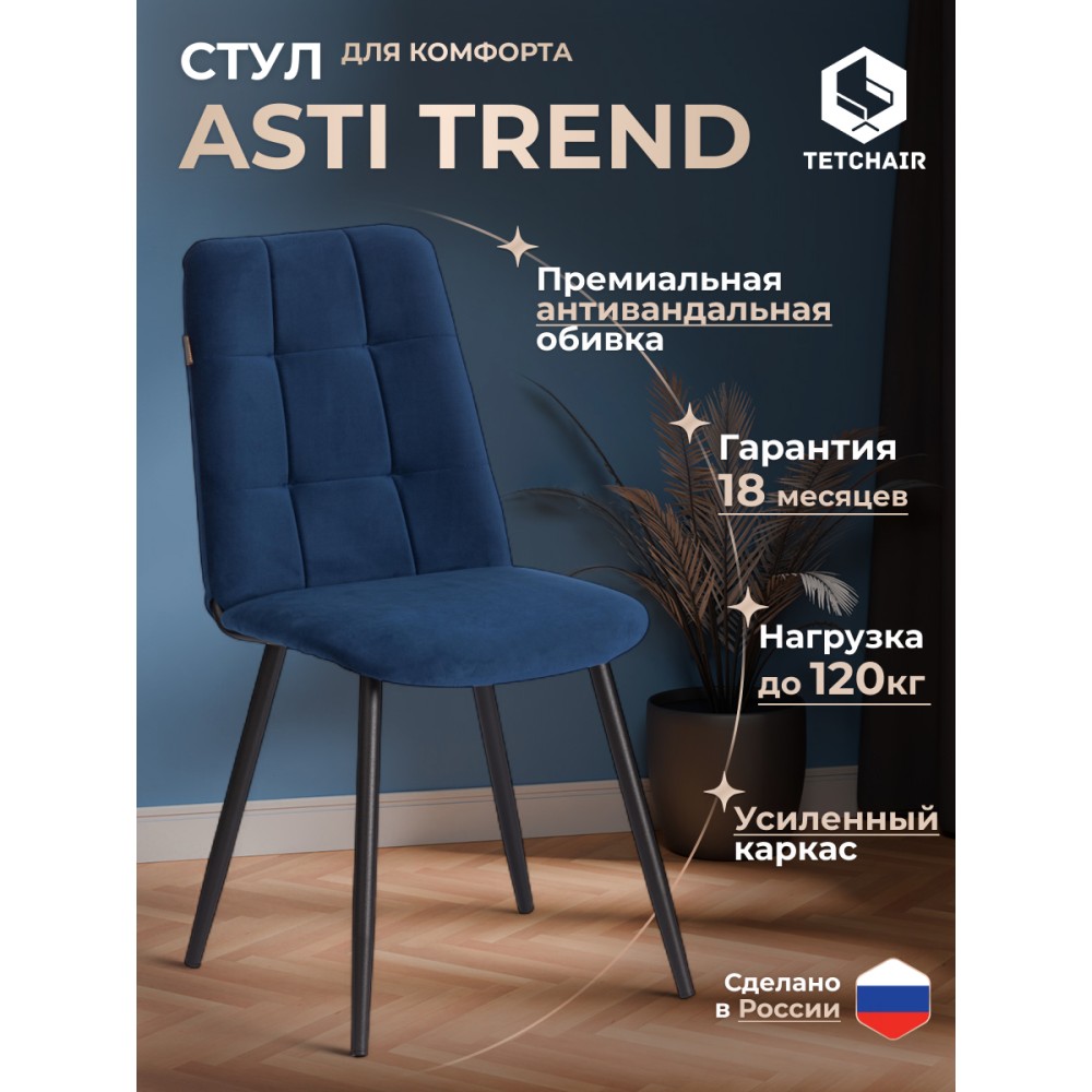 Стул Asti/Асти Trend/Тренд - не просто предмет мебели, а истинный элемент стиля, способный преобразить любое пространство. Его современный и лаконичный дизайн подойдет как для загородного дома, так и для городской квартиры, ресторана или кафе. Каркас спинки выполнен из металлического профиля, что делает модель отличным решением для частого использования. Сиденье с основанием из гнутоклееного шпона толщиной 10 мм и наполнителя из пенополиуретана (ППУ) плотностью 22-30 кг/м³ не деформируется со временем, износостойко и долговечно. Прочные конусообразные опоры диаметром 26/16 мм с толщиной металла 1,2 мм надежны и устойчивы к усиленной эксплуатации. Обивка из велюра придает стулу безупречный внешний вид, позволяя ему гармонировать с различными стилями интерьера. Такой материал не требует сложного ухода, хорошо пропускает воздух, обладает приятными тактильными свойствами. Оригинальный стул Asti/Асти добавит индивидуальности в любое помещение, прослужит владельцу долгие годы, не теряя своего первоначального внешнего вида. Модель поставляется в разобранном виде, необходима простая сборка по прилагаемой инструкции. Максимальная нагрузка 120 кг.