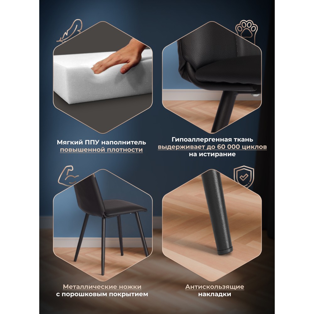 Стул Asti/Асти Trend/Тренд - не просто предмет мебели, а истинный элемент стиля, способный преобразить любое пространство. Его современный и лаконичный дизайн подойдет как для загородного дома, так и для городской квартиры, ресторана или кафе. Каркас спинки выполнен из металлического профиля, что делает модель отличным решением для частого использования. Сиденье с основанием из гнутоклееного шпона толщиной 10 мм и наполнителя из пенополиуретана (ППУ) плотностью 22-30 кг/м³ не деформируется со временем, износостойко и долговечно. Прочные конусообразные опоры диаметром 26/16 мм с толщиной металла 1,2 мм надежны и устойчивы к усиленной эксплуатации. Обивка из экокожи придает стулу безупречный внешний вид, позволяя ему гармонировать с различными стилями интерьера. Такой материал не требует сложного ухода, хорошо пропускает воздух, обладает приятными тактильными свойствами. Оригинальный стул Asti/Асти добавит индивидуальности в любое помещение, прослужит владельцу долгие годы, не теряя своего первоначального внешнего вида.Продаётся стул в разобранном виде, что делает транспортировку удобной. Сборка стула проста и понятна благодаря прилагаемой инструкции. - Нагрузка: Стул рассчитан на статичную нагрузку до 120 кг.