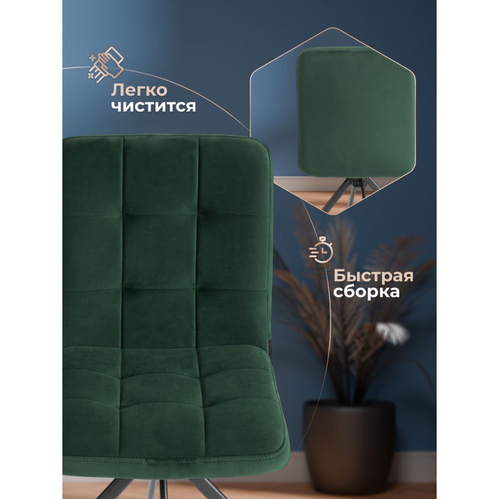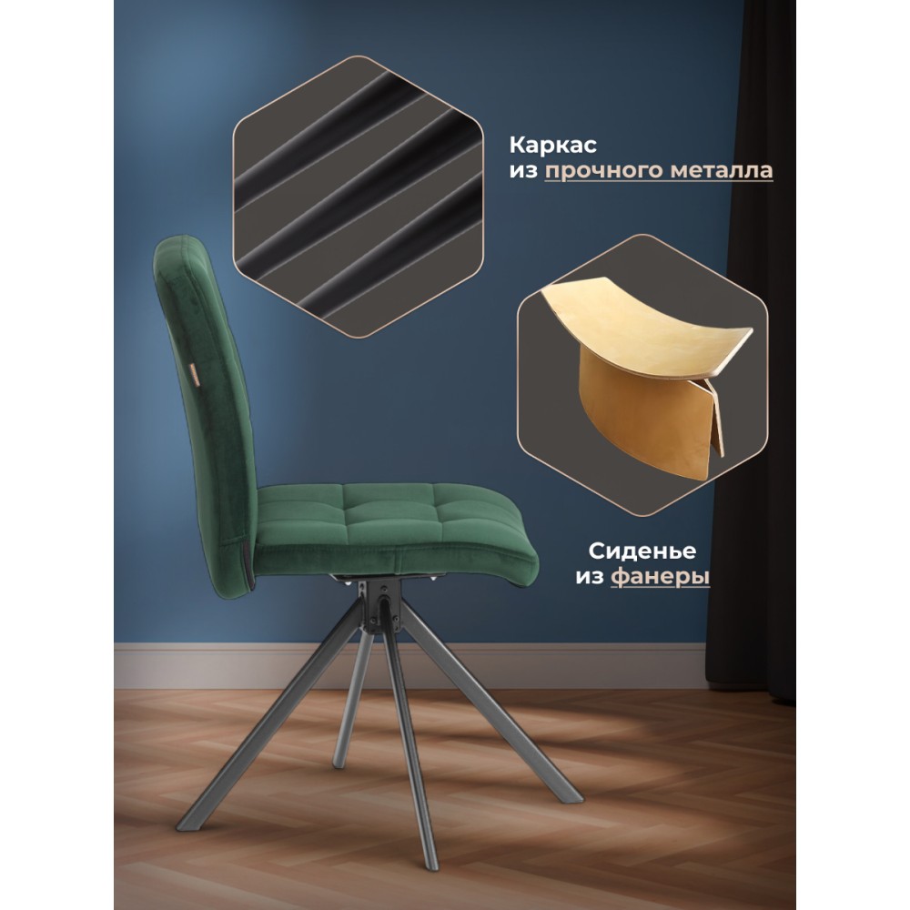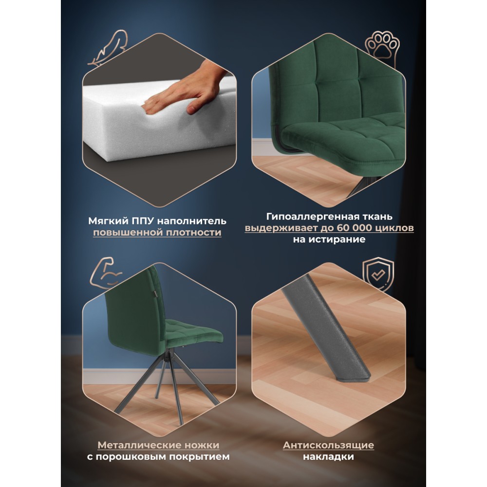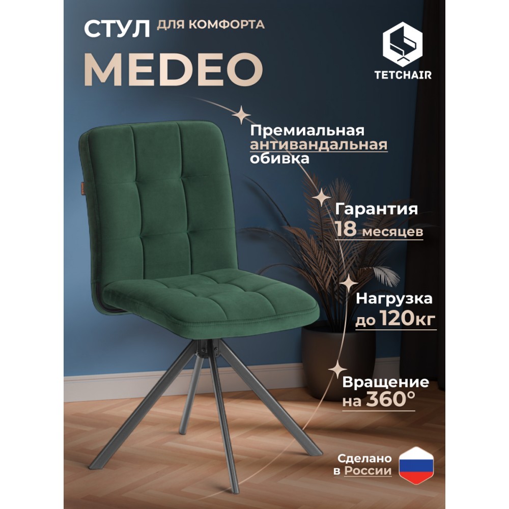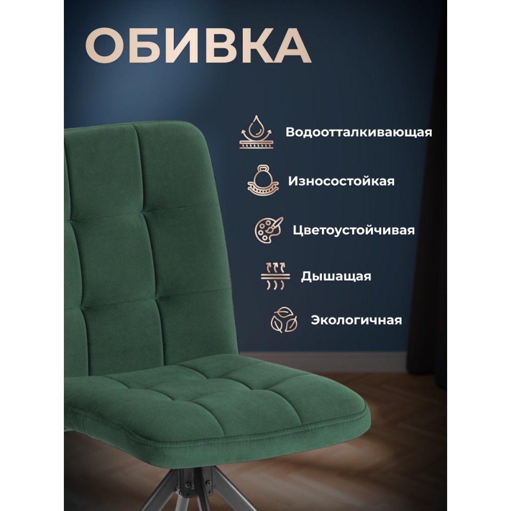 Стул Medeo станет отличным решением для любого помещения в доме или квартире, сочетая в себе функциональность, комфорт и привлекательный внешний вид. Особенностью уютного стула считается опора на 360 градусов. Модель с наполнителем из пенополиуретана (ППУ) плотностью 35-45 кг/м³ гарантирует высокий уровень удобства, что делает его подходящим для длительного использования. Основание сиденья выполнено из гнутоклееного шпона толщиной 10 мм. Металлический каркас спинки придает стулу прочность и основательность, обеспечивает оптимальную поддержку спины и поясницы. Металлические опоры долговечны и устойчивы к усиленной эксплуатации. Поворотный механизм в стульях — это инновационное решение, которое позволяет пользователям легко вращаться вокруг оси без необходимости передвигать сам стул. Модель обита износостойким велюром. Такой материал практичен, прост в уходе, приятен на ощупь. Стул Medeo обладает привлекательным внешним видом, способен украсить любое помещение, поможет создать в доме атмосферу уюта и комфорта. Модель поставляется в разобранном виде, необходима простая сборка по прилагаемой инструкции. Максимальная нагрузка 120 кг.