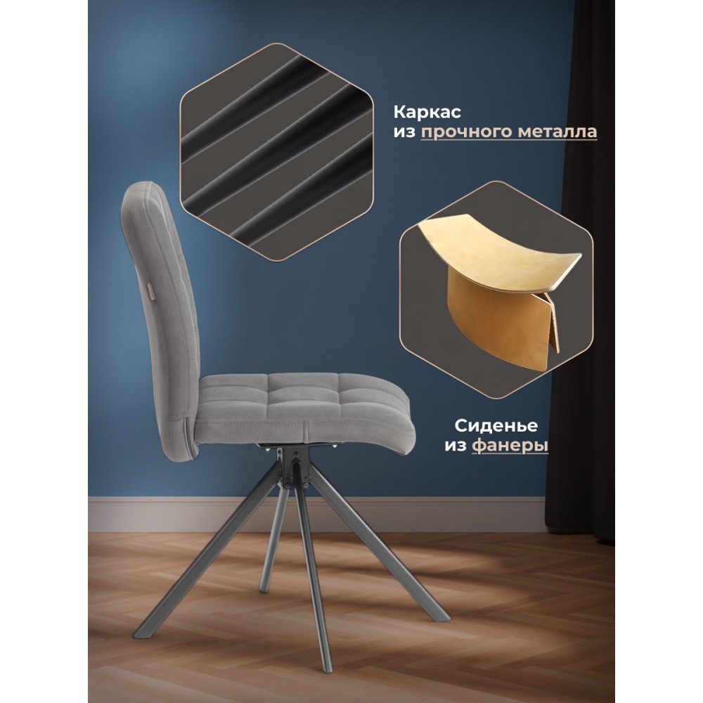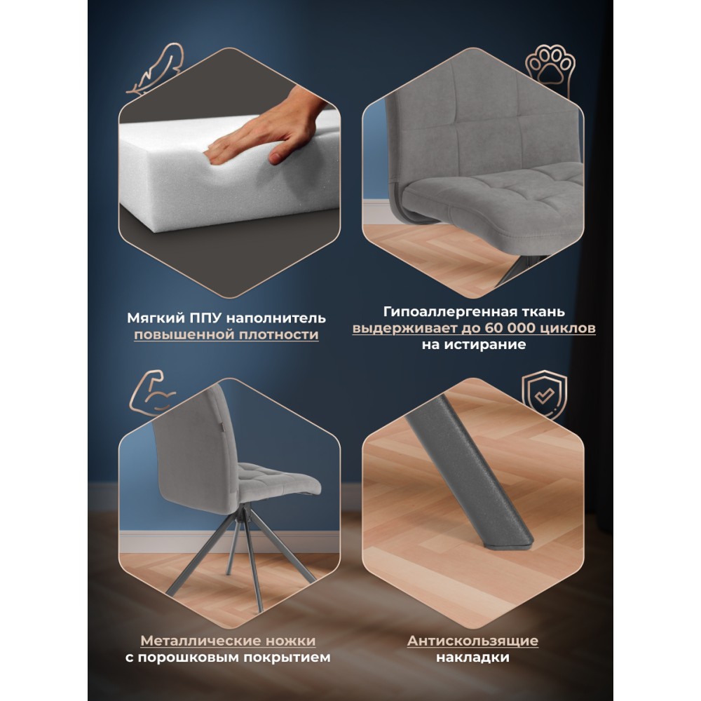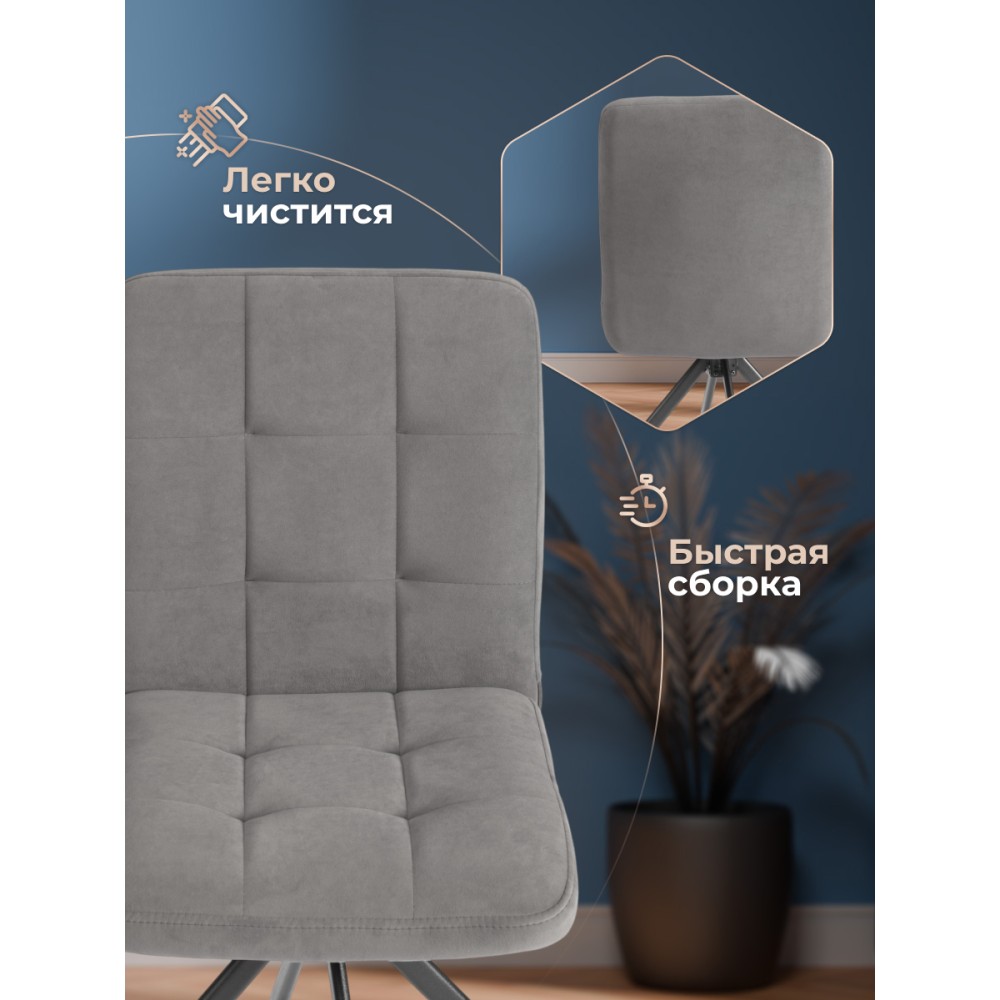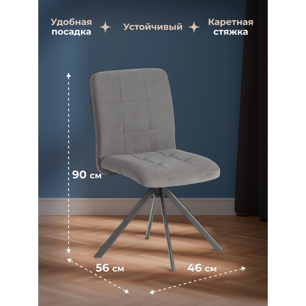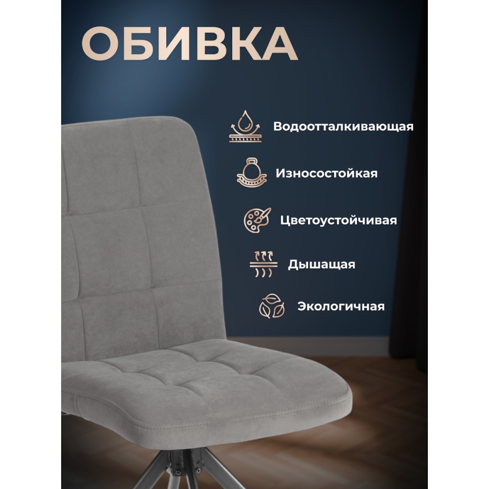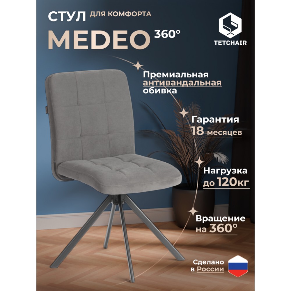 Стул Medeo станет отличным решением для любого помещения в доме или квартире, сочетая в себе функциональность, комфорт и привлекательный внешний вид. Особенностью уютного стула считается опора на 360 градусов. Модель с наполнителем из пенополиуретана (ППУ) плотностью 35-45 кг/м³ гарантирует высокий уровень удобства, что делает его подходящим для длительного использования. Основание сиденья выполнено из гнутоклееного шпона толщиной 10 мм. Металлический каркас спинки придает стулу прочность и основательность, обеспечивает оптимальную поддержку спины и поясницы. Металлические опоры долговечны и устойчивы к усиленной эксплуатации. Поворотный механизм в стульях — это инновационное решение, которое позволяет пользователям легко вращаться вокруг оси без необходимости передвигать сам стул. Модель обита износостойким велюром. Такой материал практичен, прост в уходе, приятен на ощупь. Стул Medeo обладает привлекательным внешним видом, способен украсить любое помещение, поможет создать в доме атмосферу уюта и комфорта. Модель поставляется в разобранном виде, необходима простая сборка по прилагаемой инструкции. Максимальная нагрузка 120 кг.