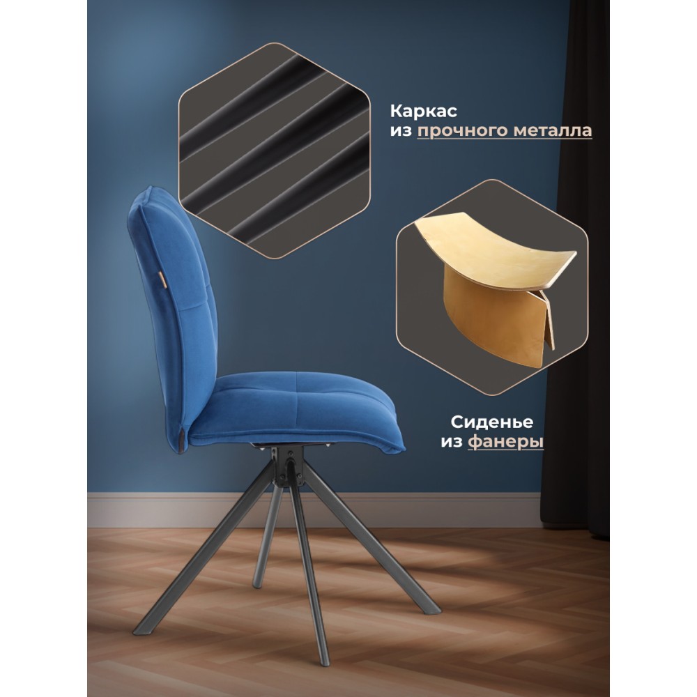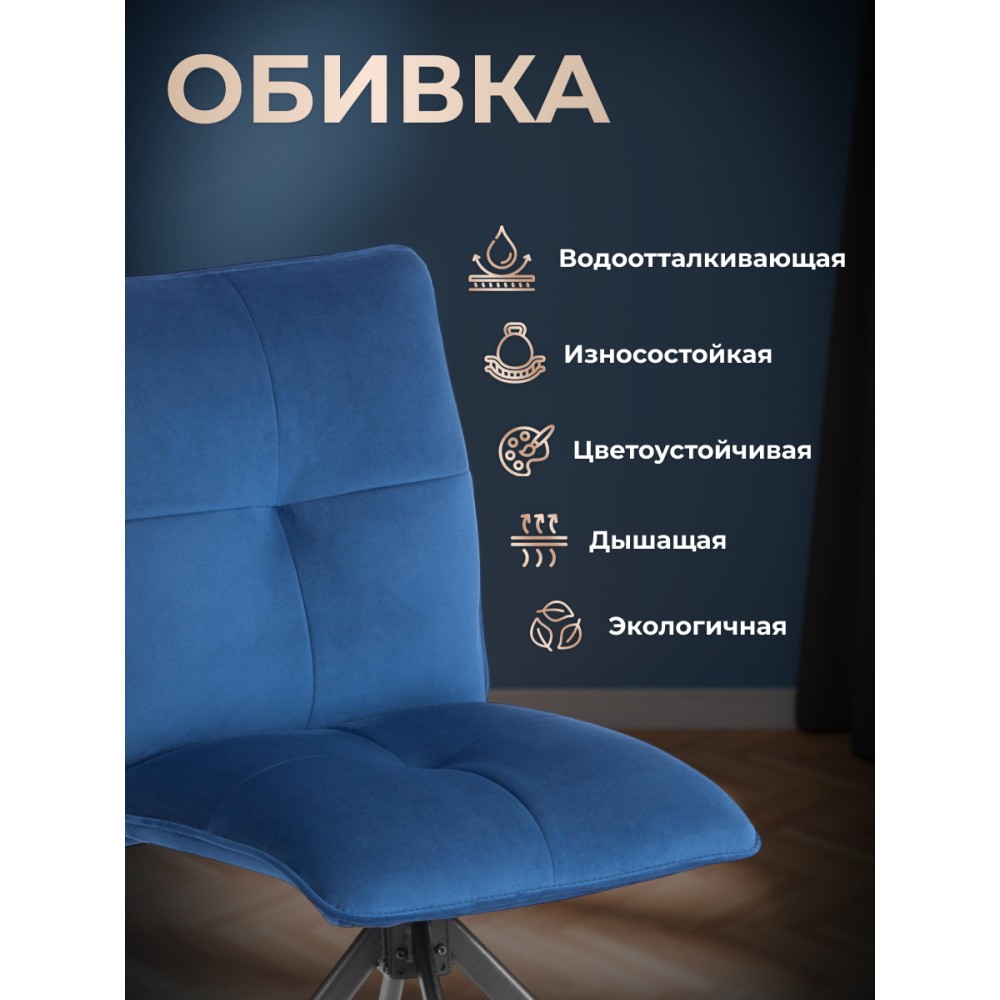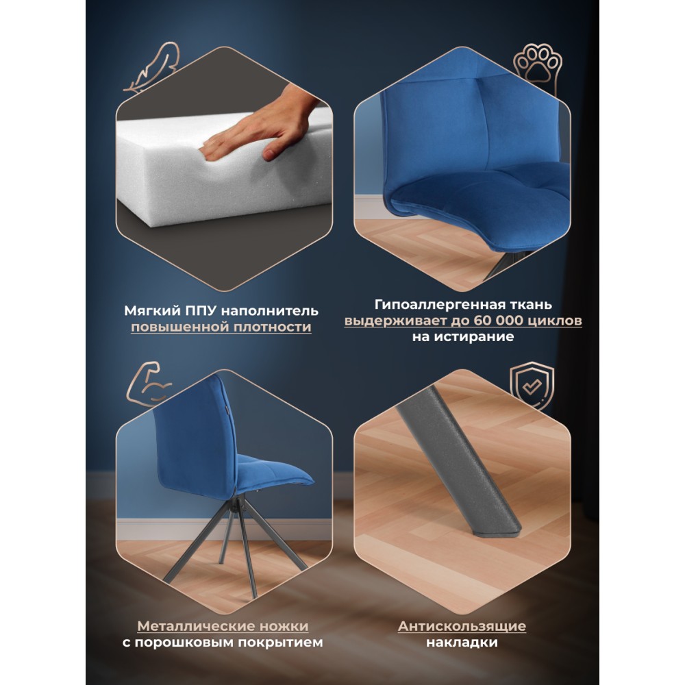 Стул Medeo станет отличным решением для любого помещения в доме или квартире, сочетая в себе функциональность, комфорт и привлекательный внешний вид. Особенностью уютного стула считается опора на 360 градусов. Модель с наполнителем из пенополиуретана (ППУ) плотностью 35-45 кг/м³ гарантирует высокий уровень удобства, что делает его подходящим для длительного использования. Основание сиденья выполнено из гнутоклееного шпона толщиной 10 мм. Металлический каркас спинки придает стулу прочность и основательность, обеспечивает оптимальную поддержку спины и поясницы. Металлические опоры долговечны и устойчивы к усиленной эксплуатации. Поворотный механизм в стульях — это инновационное решение, которое позволяет пользователям легко вращаться вокруг оси без необходимости передвигать сам стул. Модель обита износостойким велюром. Такой материал практичен, прост в уходе, приятен на ощупь. Стул Medeo обладает привлекательным внешним видом, способен украсить любое помещение, поможет создать в доме атмосферу уюта и комфорта. Модель поставляется в разобранном виде, необходима простая сборка по прилагаемой инструкции. Максимальная нагрузка 120 кг.
