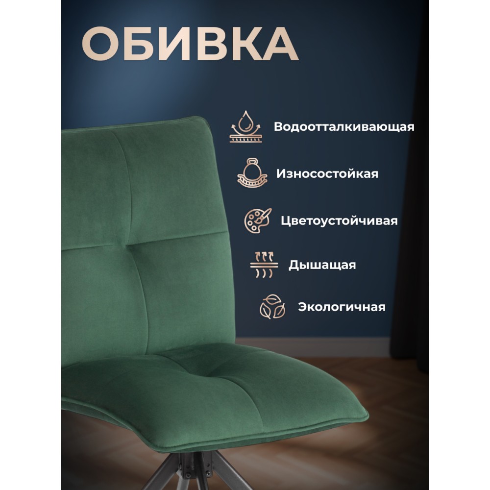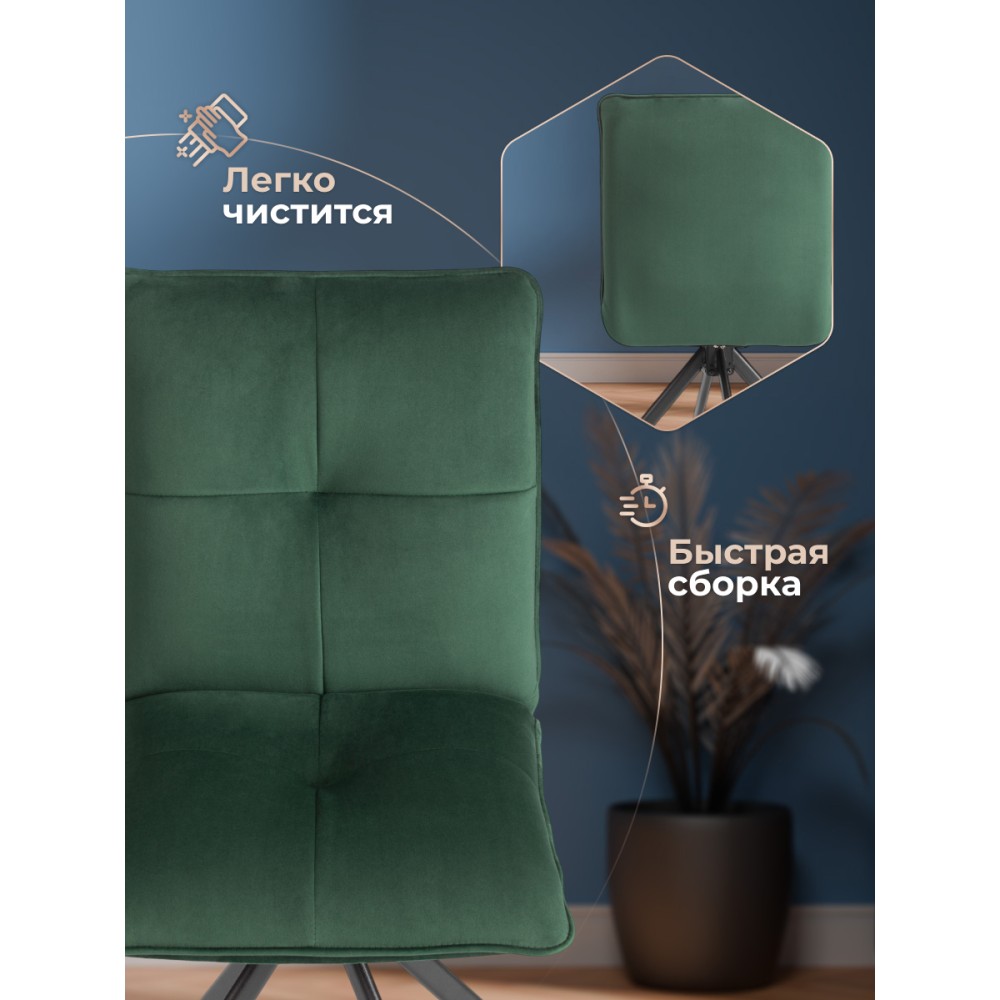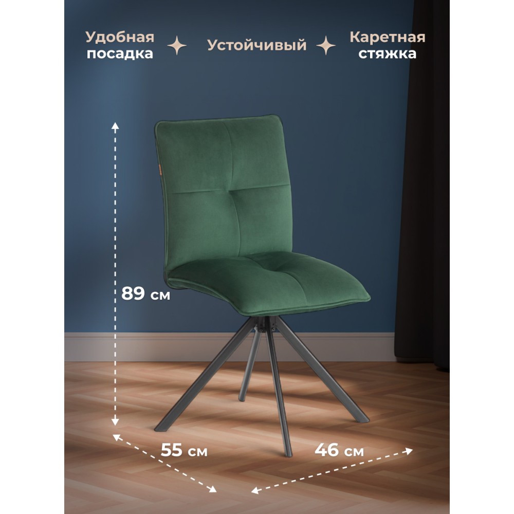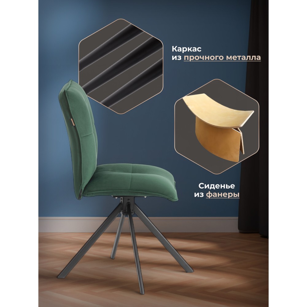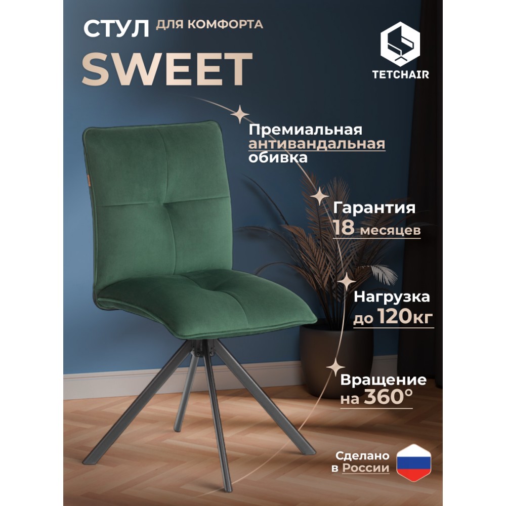Стул Sweet - отличная возможность разнообразить интерьер городской квартиры или загородного дома. Оригинальная модель отлично подойдет для кухни, спальни, гостиной, столовой или прихожей. Особенностью уютного стула считается опора на 360 градусов. Каркас и спинка: ОКРАШЕННЫЙ металлический профиль обеспечивает надежность и долговечность, а высокая, эргономичная спинка с эффектом "Гамака" обеспечивает комфорт во время сидения. Сиденье: гнутоклееный шпон толщиной 10 мм придаёт надежность и несет функцию несущей конструкции, не деформируются со временем, выдерживают любые виды нагрузок. Наполнитель из пенополиуретана (ППУ) высокой плотности (35 кг/м3) сохраняет свой форму на протяжении длительного времени, обеспечивая комфорт при сидении. Обивка из велюра не только приятна на ощупь, но и устойчива к износу, что делает этот стул идеальным для повседневного использования. Прочные металлические опоры надежны и устойчивы к усиленной эксплуатации. Поворотный механизм в стульях — это инновационное решение, которое позволяет пользователям легко вращаться вокруг оси без необходимости передвигать сам стул. Вместительное сиденье, удобная спинка, привлекательный дизайн – модель Sweet идеально впишется в любой современный интерьер и станет стильным акцентом в домашнем пространстве. Стул поставляется в разобранном виде, необходима простая сборка по прилагаемой инструкции. Стул рассчитан на статичную максимальную нагрузку до 120 кг.
