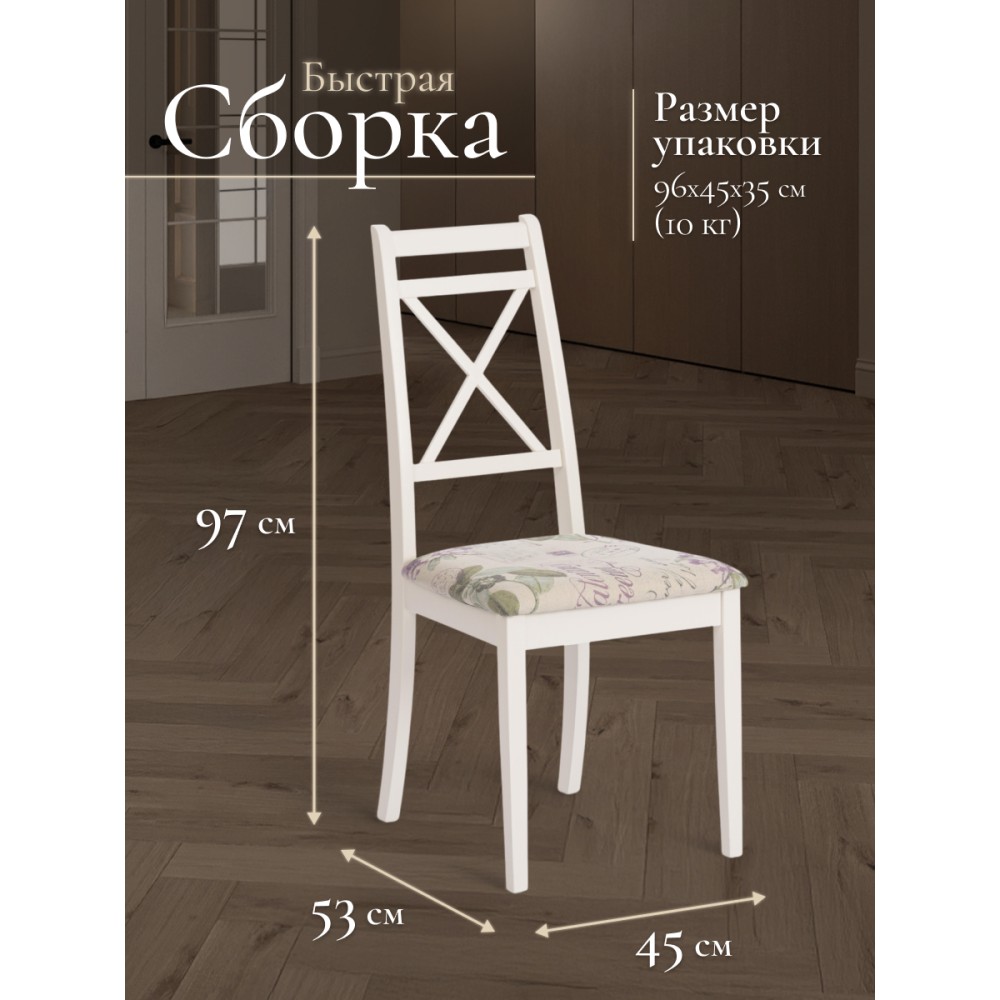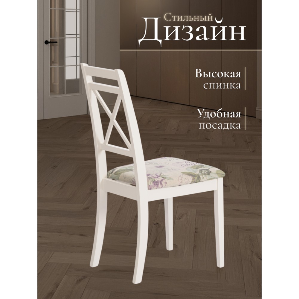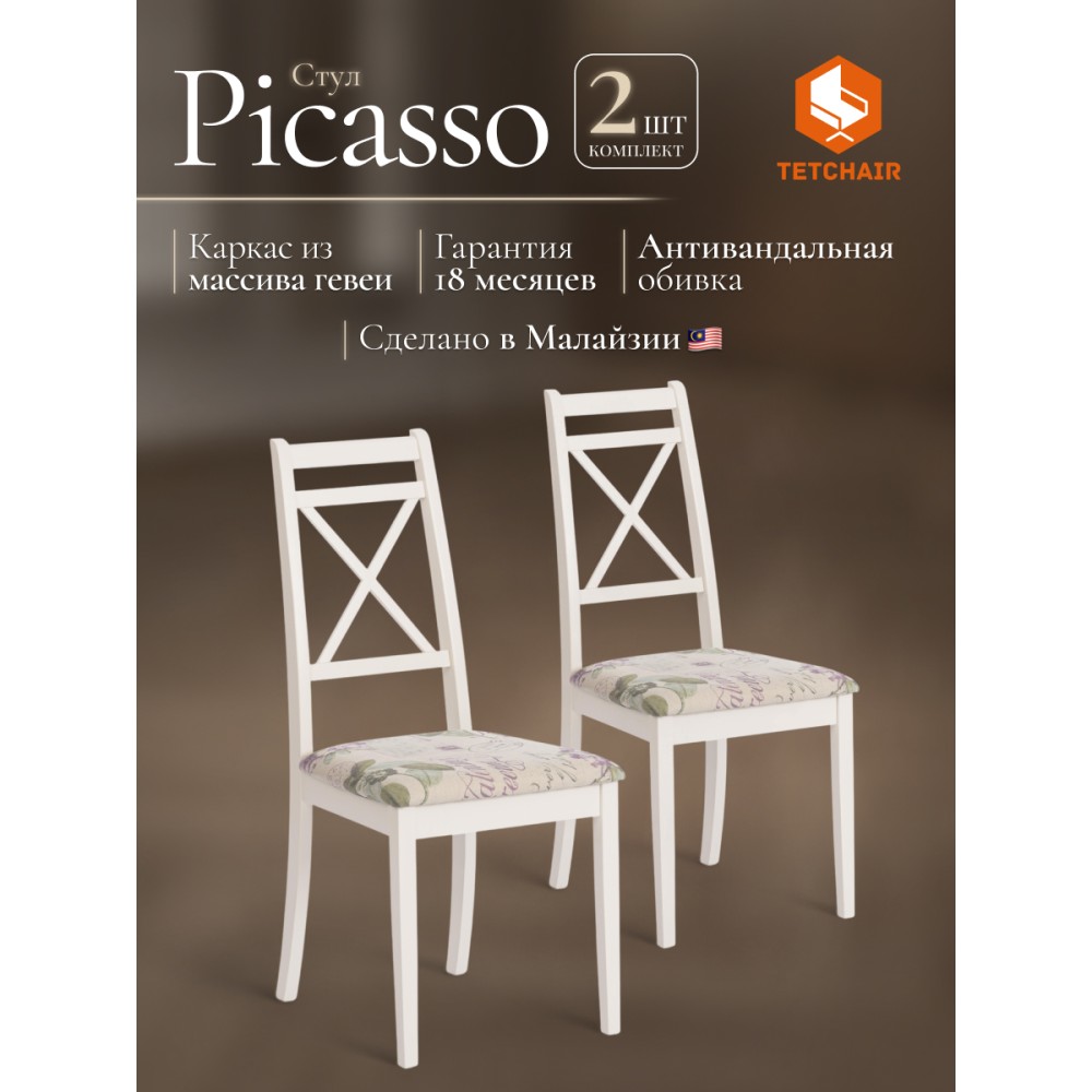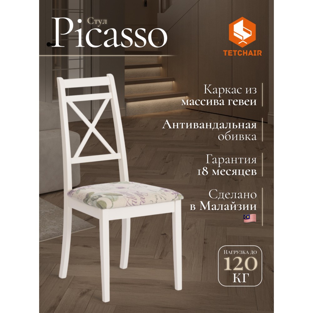 Классический деревянный стул Picasso из Миланской коллекции отлично дополнит интерьер гостиной, столовой или кухни. Устойчивый каркас модели изготовлен из массива гевеи - прочной и надежной древесины с красивым природным рисунком. Удобная спинка и мягкое сиденье позволят комфортно разместиться и расслабиться после тяжелого дня. Мягкое сиденье обито прочной обивочной тканью, которая не меняет форму со временем и не требует сложного ухода. Каркас модели цвета слоновой кости (Ivory white) отлично сочетается с универсальной обивкой с рисунком Прованс, что позволяет использовать стул в любом интерьере загородного дома, городской квартиры,кафе или ресторана. Классический стул Picasso из коллекции Миланской идеально подходит к обеденным столам Modena (Модена) и Solerno (Солерно). Модель поставляется в разобранном виде, необходима несложная сборка по прилагаемой инструкции.