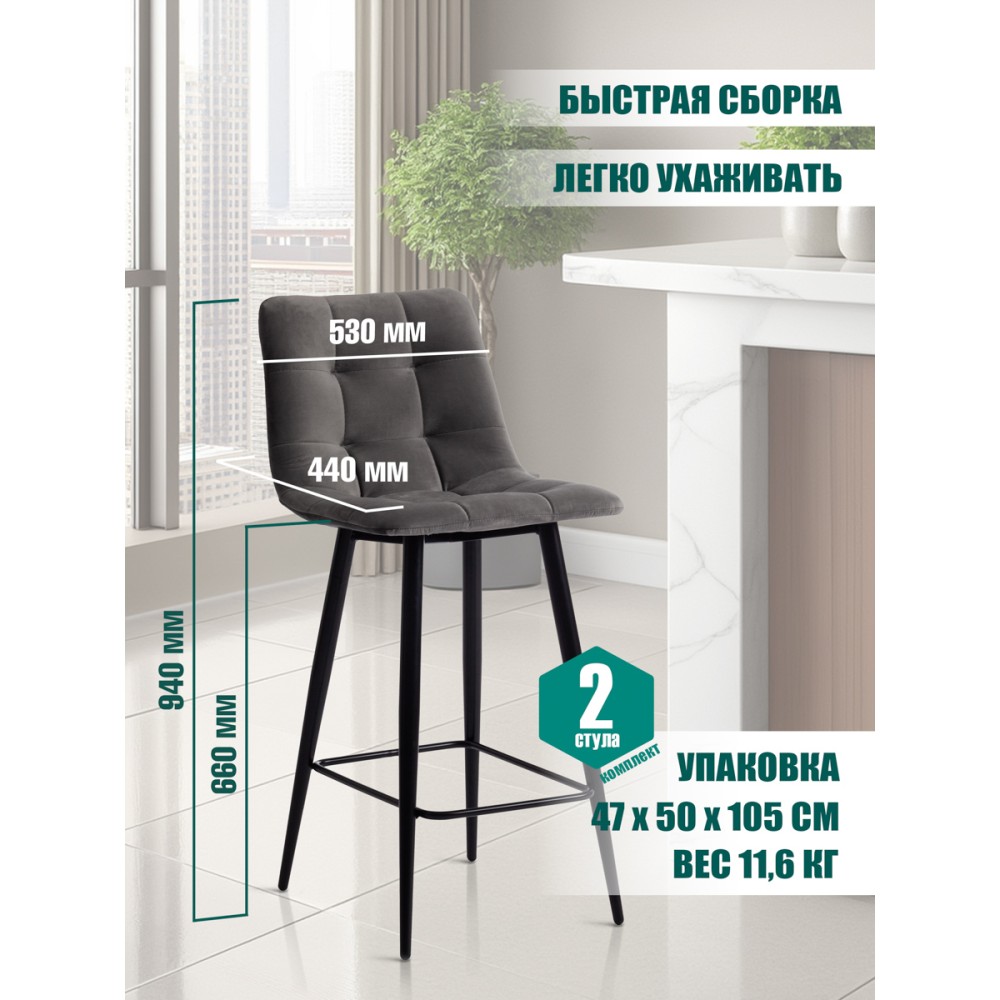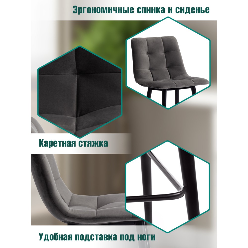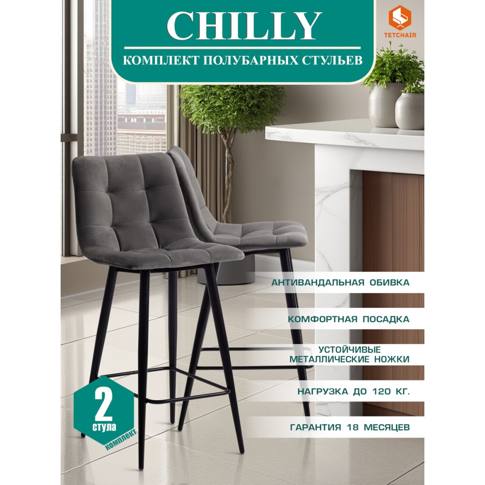 Стильный полубарный стул CHILLY из коллекции Modern станет ярким акцентом в любом интерьере подчеркнет изысканный вкус своего владельца. Данная модель способна стать не просто частью комнаты, но и задать тон вашему интерьеру. Модель будет хорошо смотреться в городской квартире, загородном доме,баре, кафе или ресторане. Мягкая и приятная на ощупь обивка благородного серого цвета в сочетании с удобными формами сиденья и подставкой для ног делают полубарный стул CHILLY настолько уютным и комфортным, что с него не хочется вставать. Благодаря широко поставленным металлическим ножкам, модель надежна и основательна. Бархатистая тканевая обивка смотрится дорого, стильно и элегантно. Она отличается устойчивостью к износу и долговечностью, благодаря чему стул не требует специального ухода и будет долгое время радовать вас своим первоначальным видом. Стул хорошо подойдет для гостиной, для кухни, для бара, для ресторана или для кафе. Стул очень прост в сборке, инструкция по сборке прилагается.