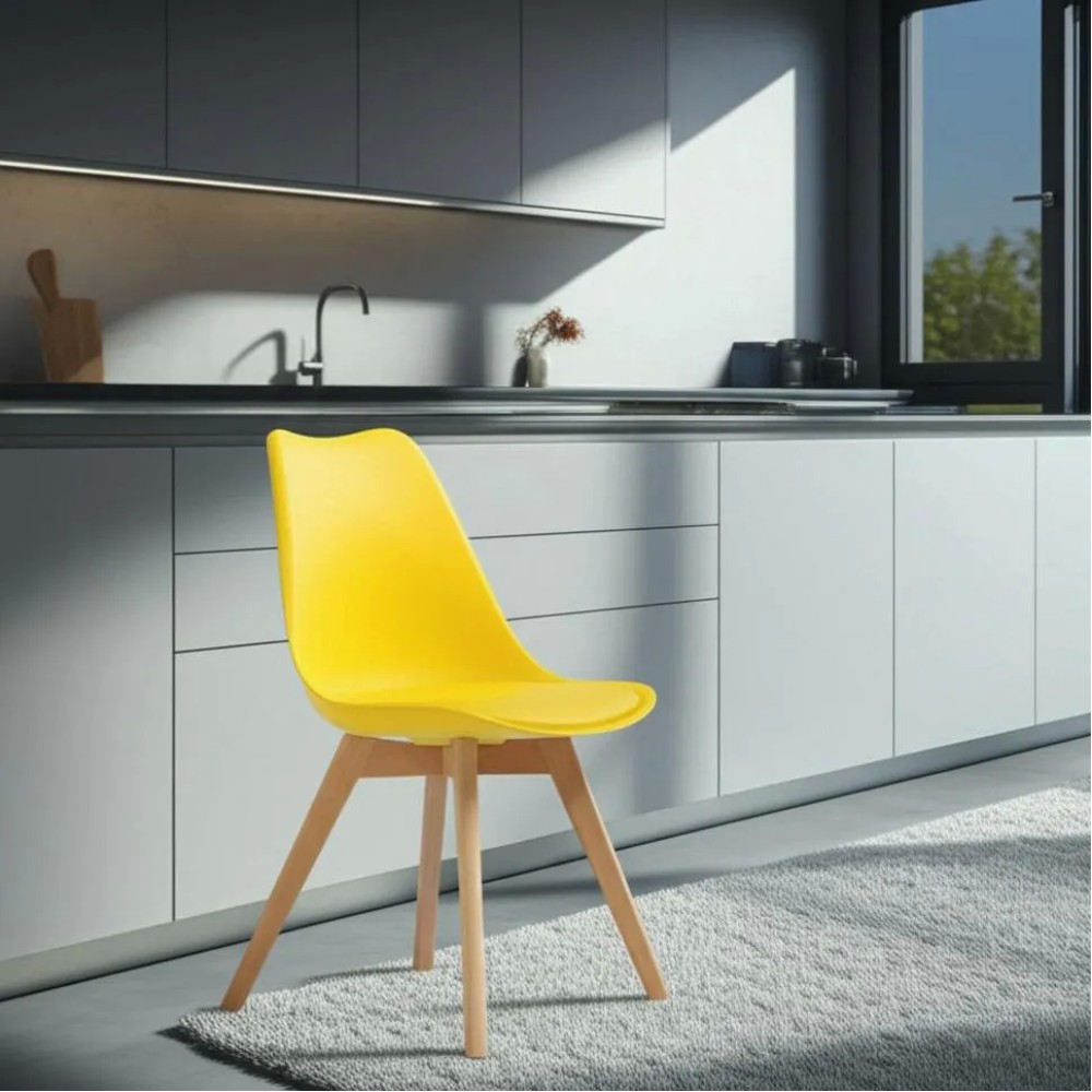 Великолепный стул TULIP из коллекции Modern выполнен в стиле известного стула Tulip, спроектированного американским архитектором Ээро Саариненом в 50-х годах двадцатого века. Стул подкупает своей универсальностью и комфортной посадкой, благодаря которым варианты его расположения в интерьере безграничны. Четыре деревянные ножки из массива бука делают модель надежной и устойчивой. Цельная спинка и сиденье из желтого пластика с мягкой накладкой из полиуретана обеспечат удобную посадку на протяжении длительного времени. Накладка из полиуретана – красивая, надежная, не требующая сложного ухода. Пластик и дерево – прочные и долговечные материалы, способные выдерживать большую нагрузку. Стул хорошо подойдет для гостиной, для кухни, для спальни, для ресторана или для кафе. Стул очень прост в сборке, инструкция по сборке прилагается.