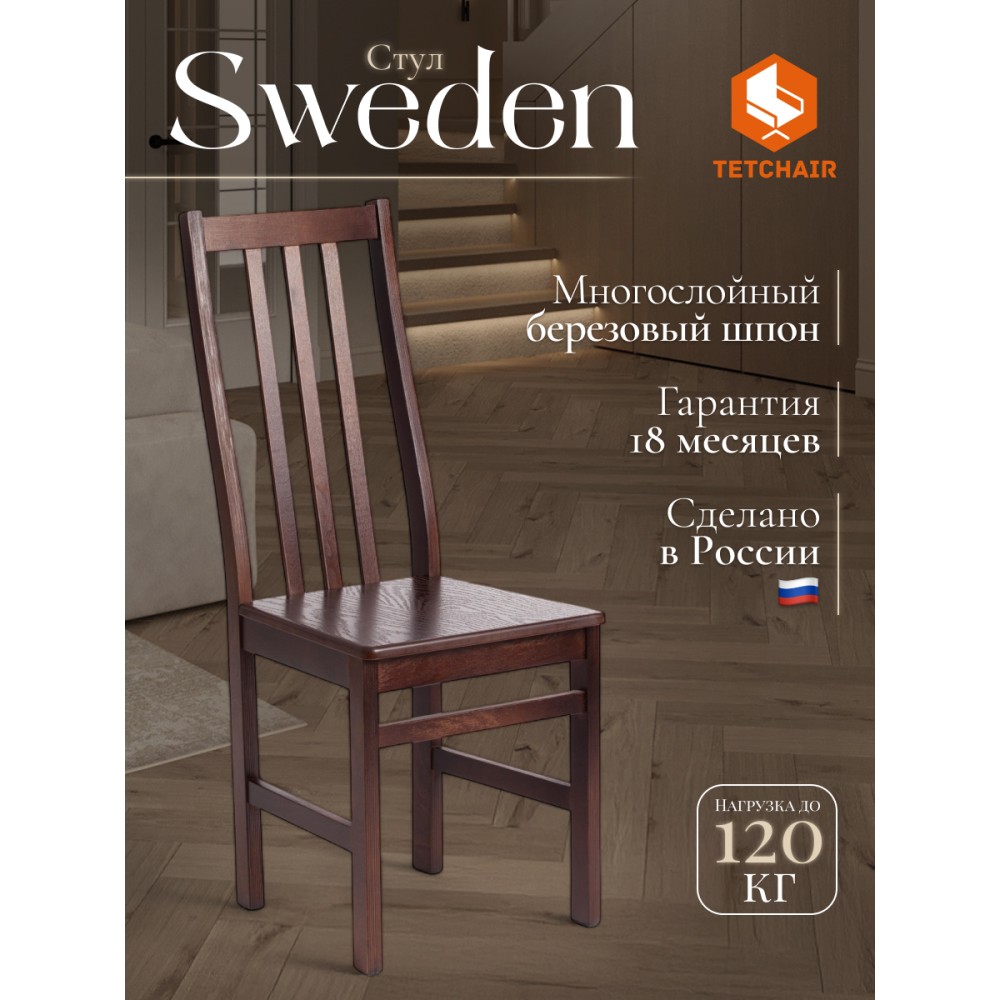 Классический деревянный стул SWEDEN из Дельфийской коллекции - незаменимый предмет мебели на кухне, в гостиной, в спальне или столовой. Высокая удобная спинка, тонкие устойчивые ножки и прочное сиденье помогут создать атмосферу комфорта и уюта в вашем доме. Экологически безопасный каркас стула изготовлен из многослойной фанеры. Он не требует сложного ухода, устойчив к механическому воздействию, что позволяет использовать стул на протяжении многих лет. Жесткое сиденье модели, выполненное из МДФ, устойчиво к воздействию влаги и повышенным температурам. Стул в цвете темный орех (Cappuchino) подойдет для загородного дома и городской квартиры, кухни, гостиной, ресторана или кафе, впишется в любой интерьер. Практичная и оригинальная модель SWEDEN обладает прекрасными эстетическими свойствами и долговечностью. Стул поставляется в разобранном виде, необходима несложная сборка по инструкции.