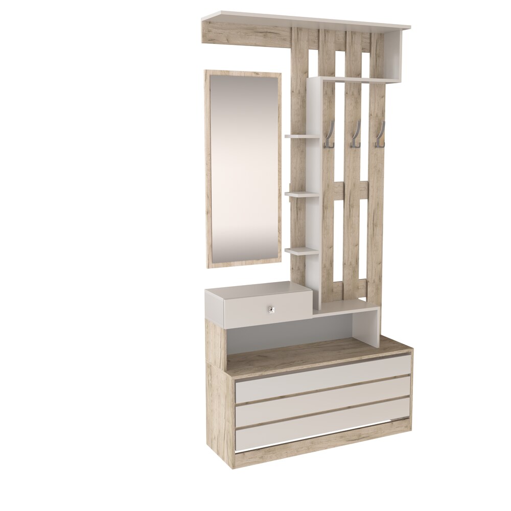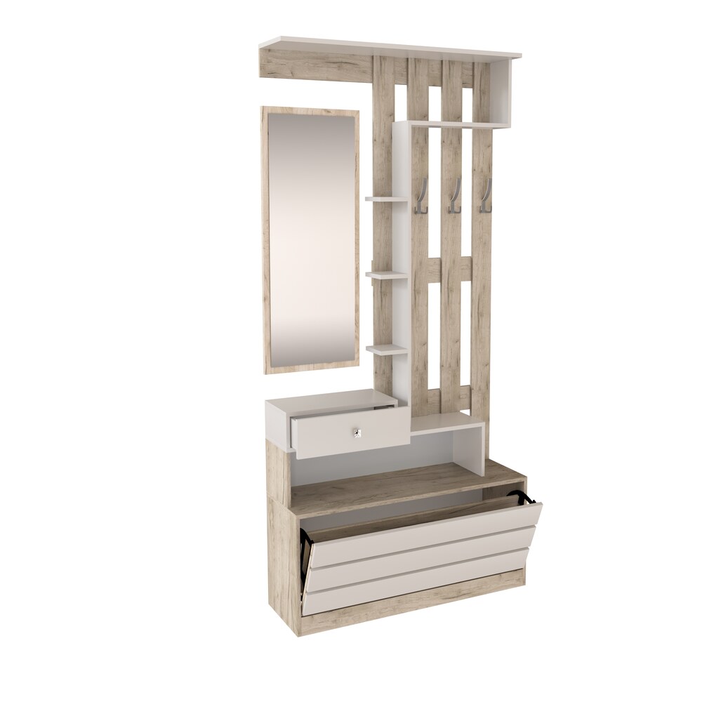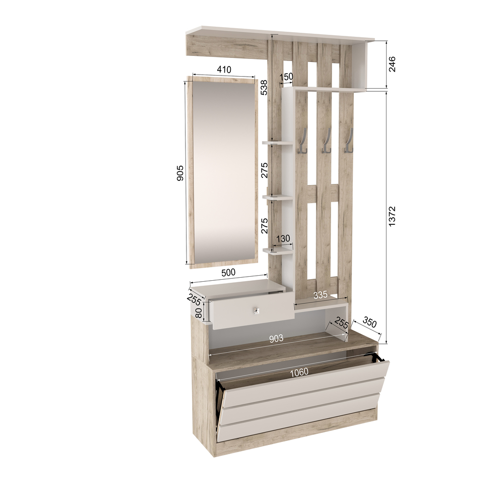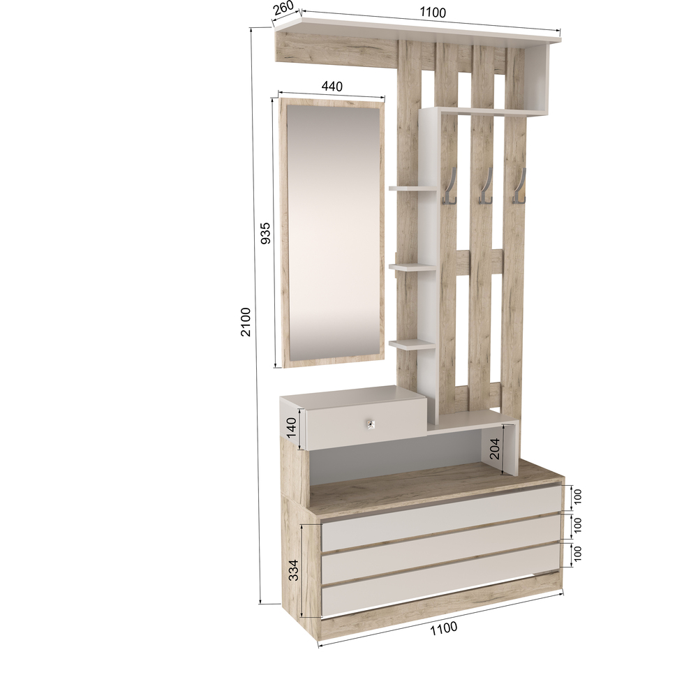 Если пространство Вашей прихожей не позволяет расположить много мебели, советуем обратить внимание на секцию из коллекции Ямайка. Модуль уникален по своей функциональности и содержит нишу для обуви с откидной дверцей, выдвижной ящик для мелочей, открытую вешалку с 3-мя крючками, полку-антресоль, набор открытых полок и зеркало. Ширина в 110 см позволит Вам расположить секцию даже в малогабаритной прихожей.