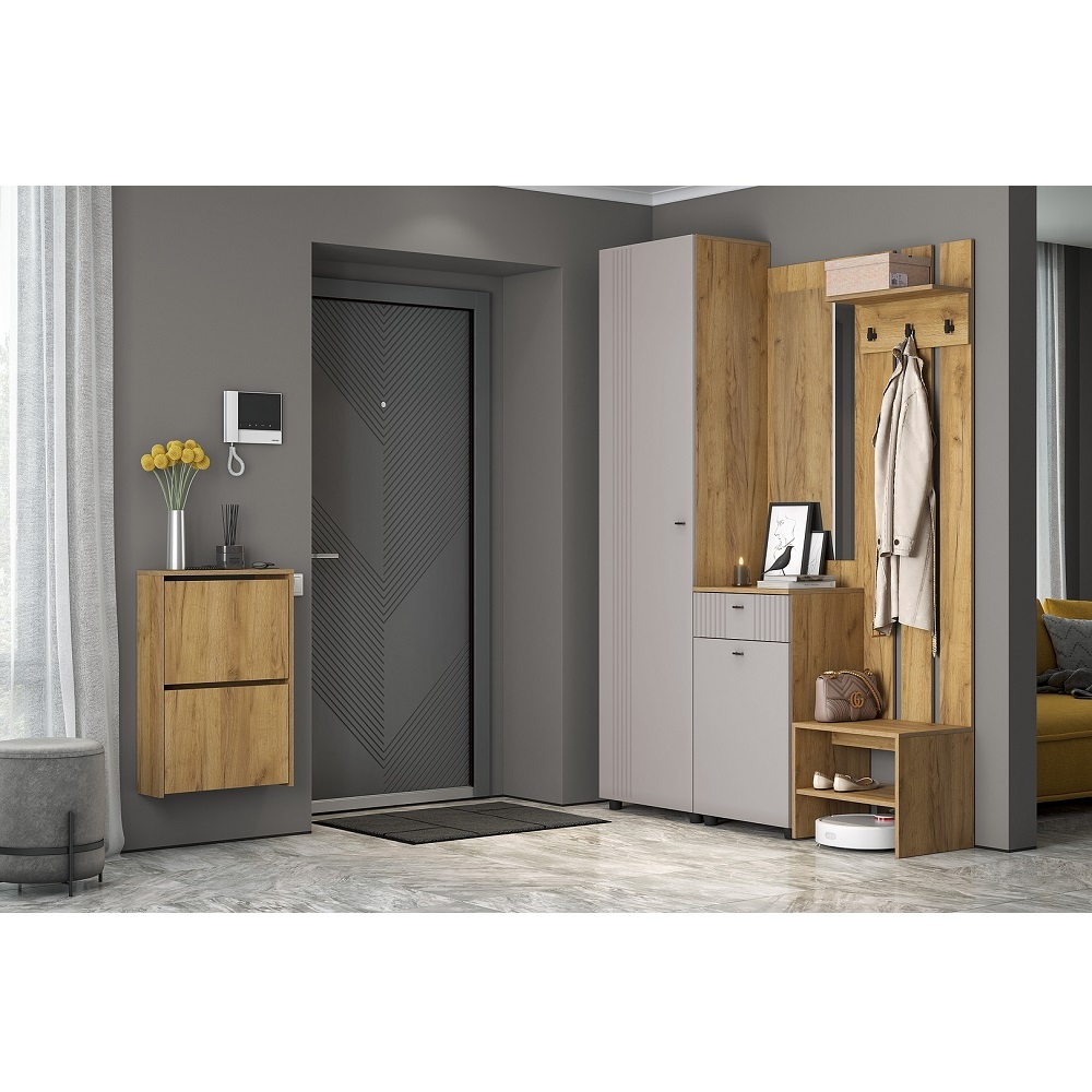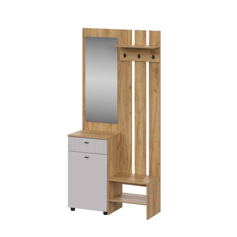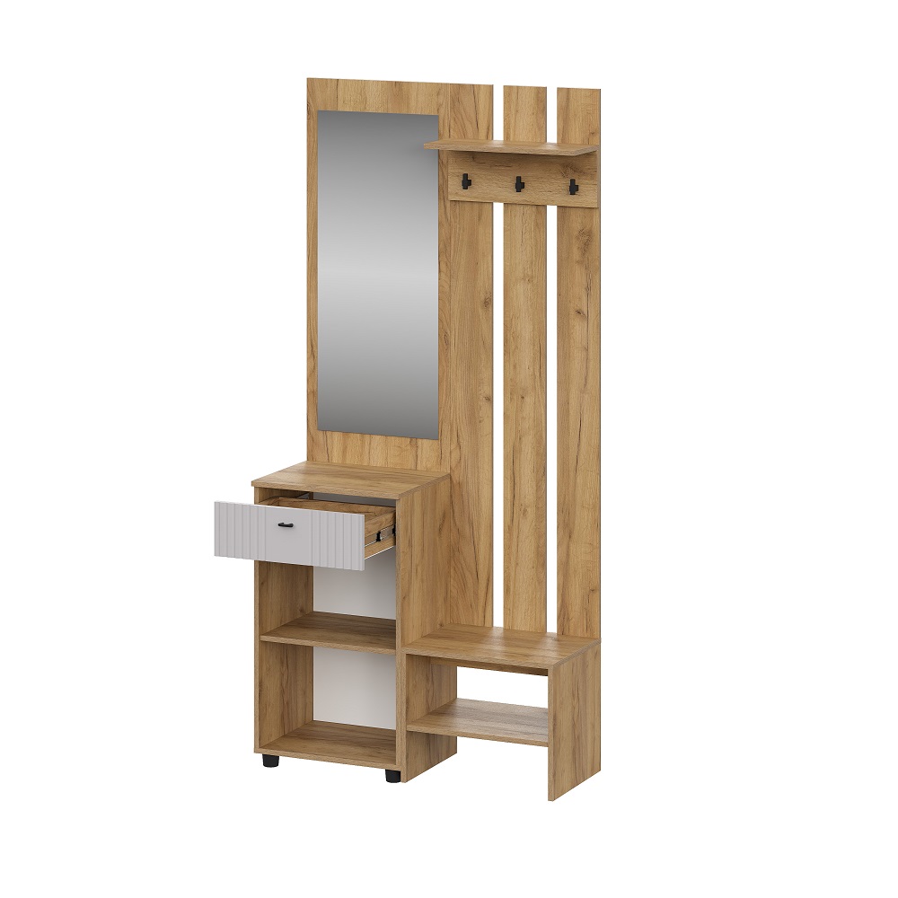 Мини-прихожая Тоскана в полном объеме поможет организовать место хранения вещей в малогабаритной прихожей или квартире-студии. Имеет крючки для одежды, обувницу с открытыми полками, выкатной ящик для сезонных аксессуаров и мелочей, закрытую секцию и зеркало.