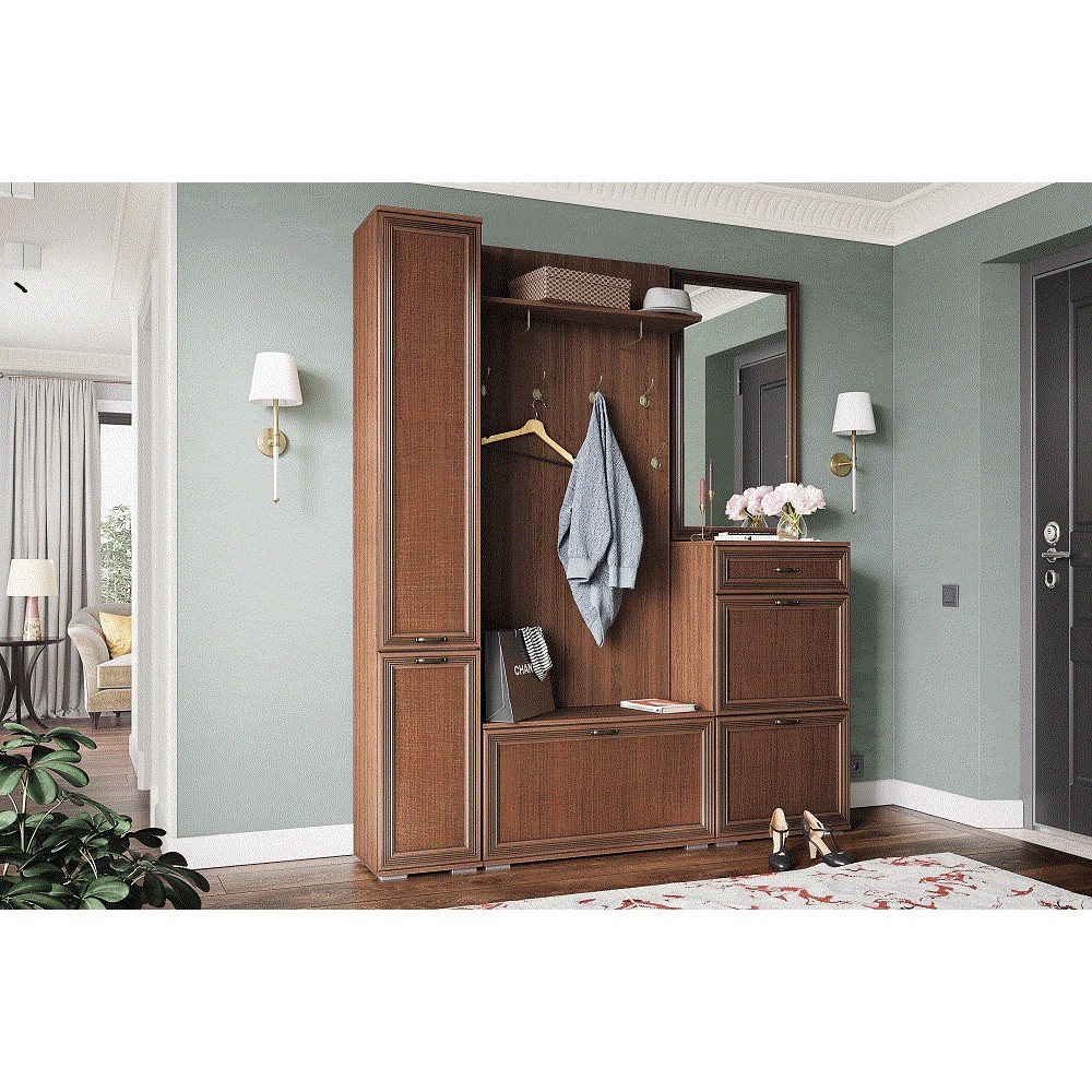 Прихожая Ливорно - классика в современном исполнении. Благодаря сдержанному цветовому решению (орех донской) и элегантному декору фасадов мебель из коллекции Ливорно станет украшением любой входной зоны. Шкаф-пенал позволит Вам разместить сезонные аксессуары. В тумбе Вы с легкостью спрячетеобувь повседневной носки, а во вместительной обувнице - всю остальную обувь. Вешалка с 5-ю крючками и полкой-антресолью станет отличным решением для расположения тех вещей, которыми Вы пользуетесь наиболее часто: верхней одежды, сумок, зонтов и т.д. Зеркало позволит держать Ваш внешний вид под контролем перед уходом из дома.