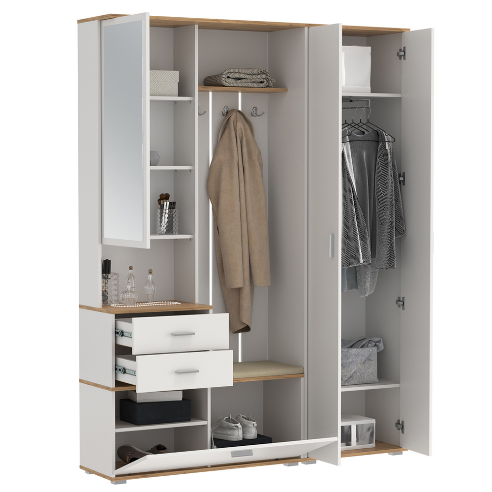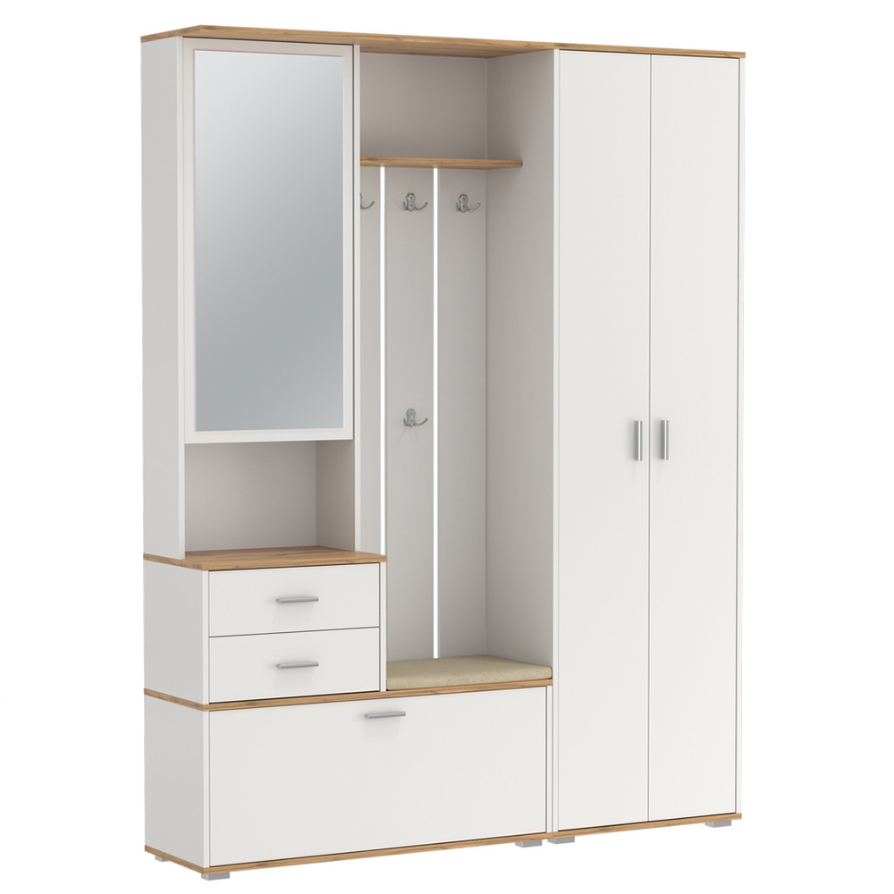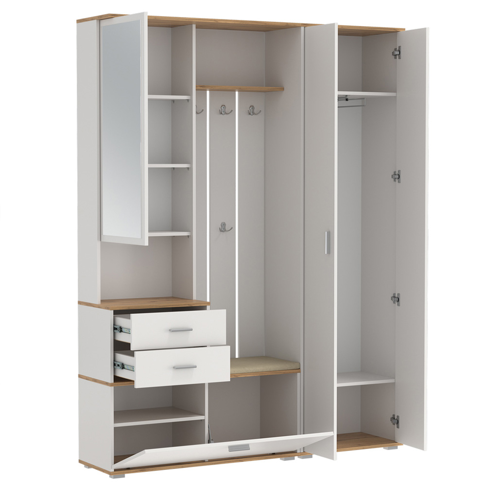 Прихожая Антре включает открытую вешалку с крючками для комфортного хранения одежды, два выдвижных ящика для мелких предметов и встроенную обувницу за откидной дверцей.