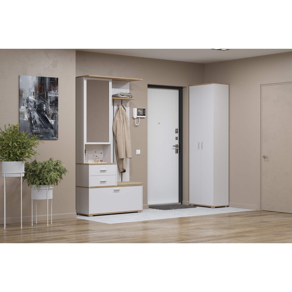 Зеркало на дверце не только позволяет проверить свой внешний вид перед выходом, но и визуально увеличивает пространство. Ниша под зеркалом добавляет дополнительное место для хранения аксессуаров или других необходимых вещей.