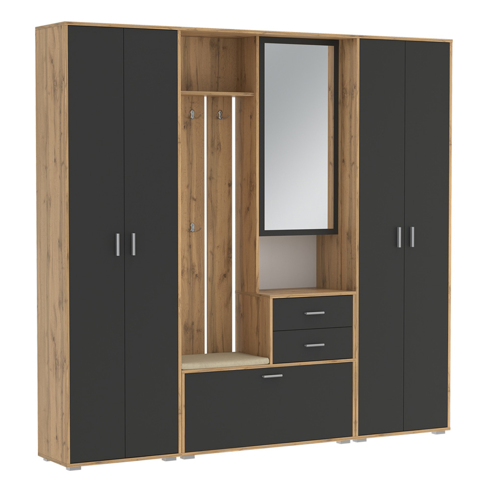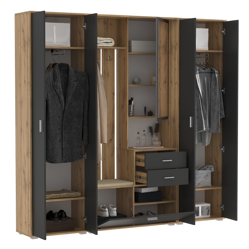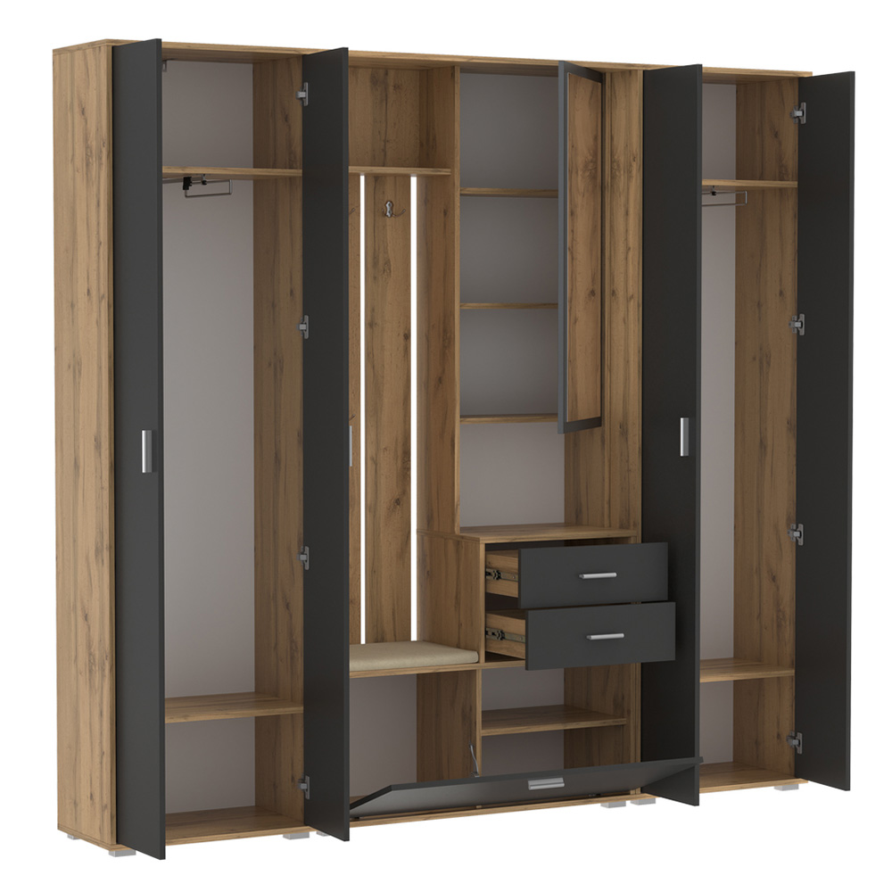 Прихожая Антре включает открытую вешалку с крючками для комфортного хранения одежды, два выдвижных ящика для мелких предметов и встроенную обувницу за откидной дверцей.