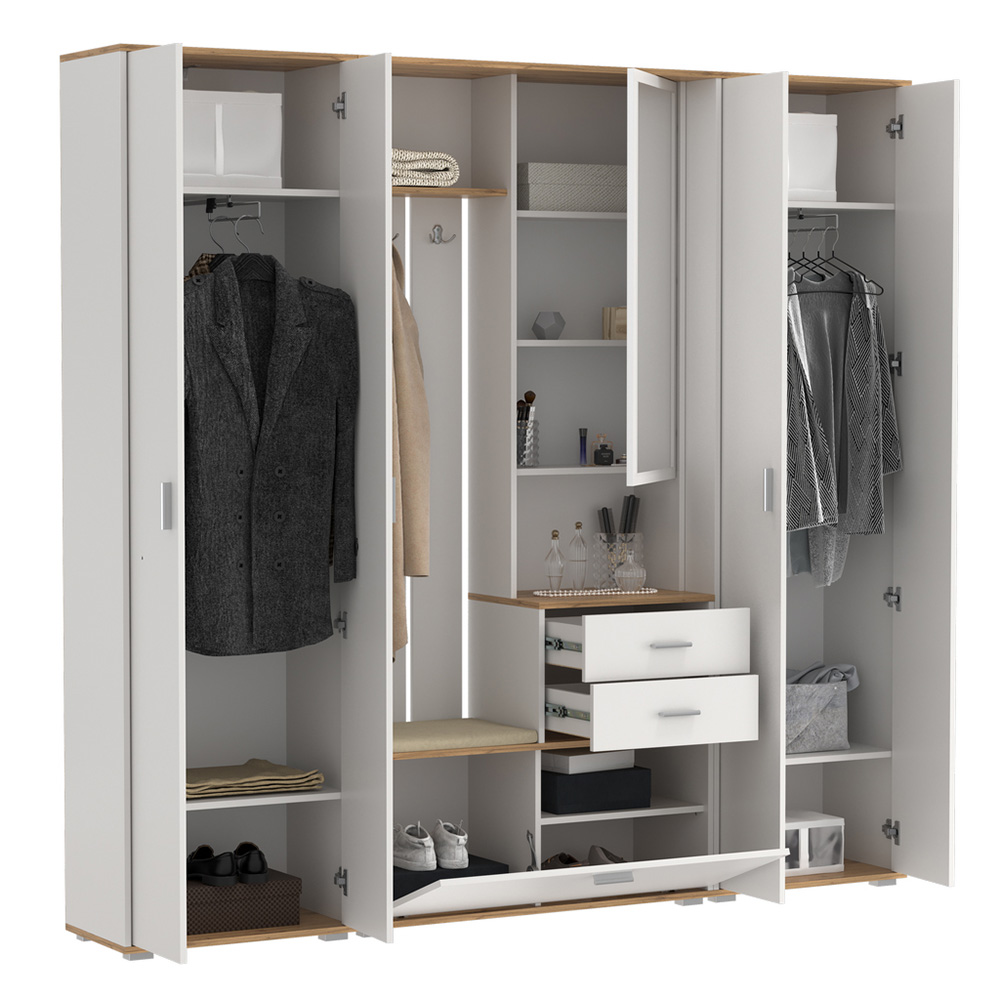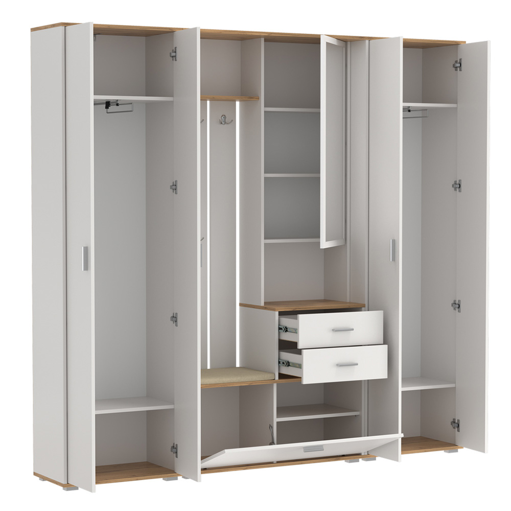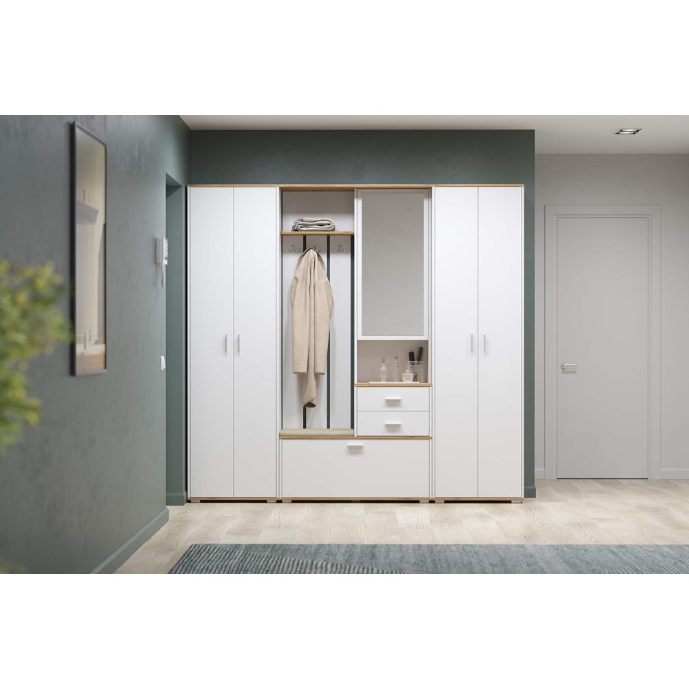Прихожая Антре включает открытую вешалку с крючками для комфортного хранения одежды, два выдвижных ящика для мелких предметов и встроенную обувницу за откидной дверцей.