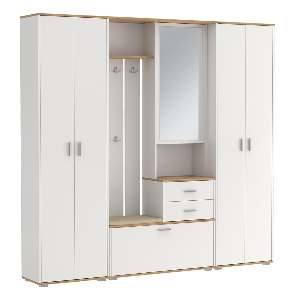 Под вешалкой расположена удобная банкетка, где можно отдохнуть, а вверху — вместительная антресольная полка. За зеркальной дверью скрыты две полки, предназначенные для головных уборов, шарфов и прочих мелочей, что помогает поддерживать порядок.