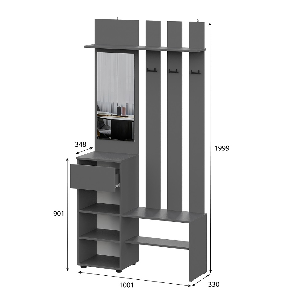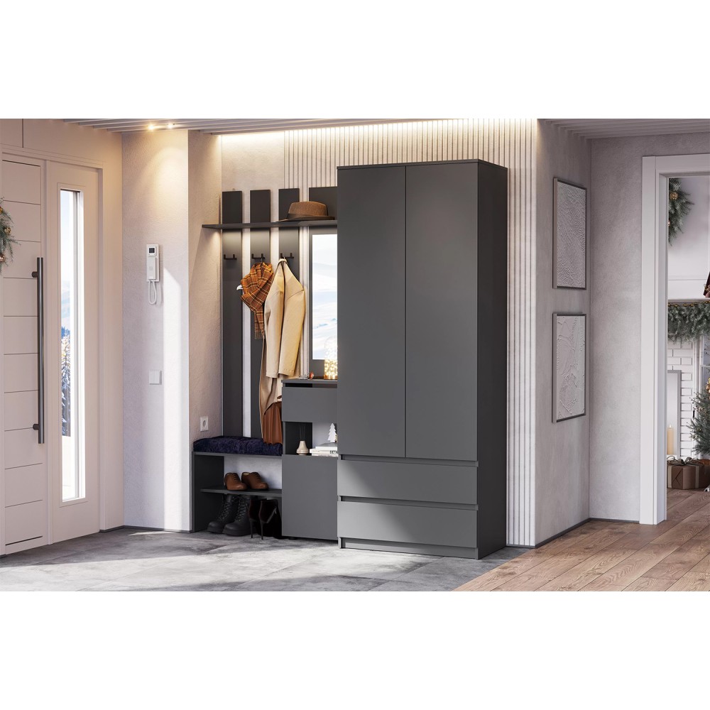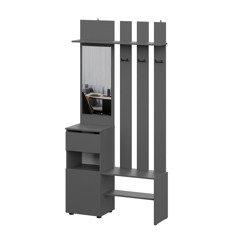 Прихожая Денвер в цвете графит поможет организовать систему хранения гардероба у вас дома. Для вашего удобства предусмотрены двухрожковые крючки для повседневной верхней одежды, широкая верхняя полка для головных уборов и шарфов, ниша для обуви, а также выдвижной ящик. За распашным фасадом находятся небольшие полки. Зеркало позволит оценить внешний вид перед выходом из дома. Вешалка легко крепится к стене, сборка универсальная. Прихожая оснащена шкафом, за распашными дверцами которого скрыты полки и штанга для одежды.