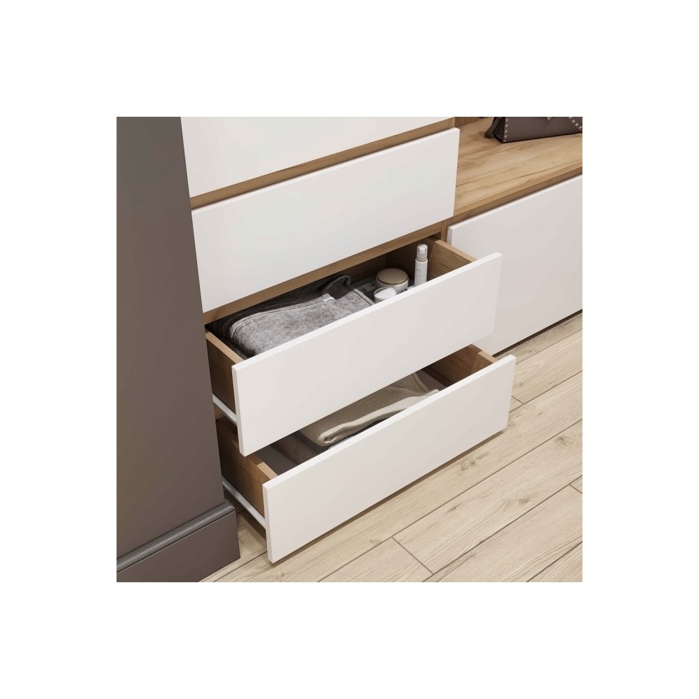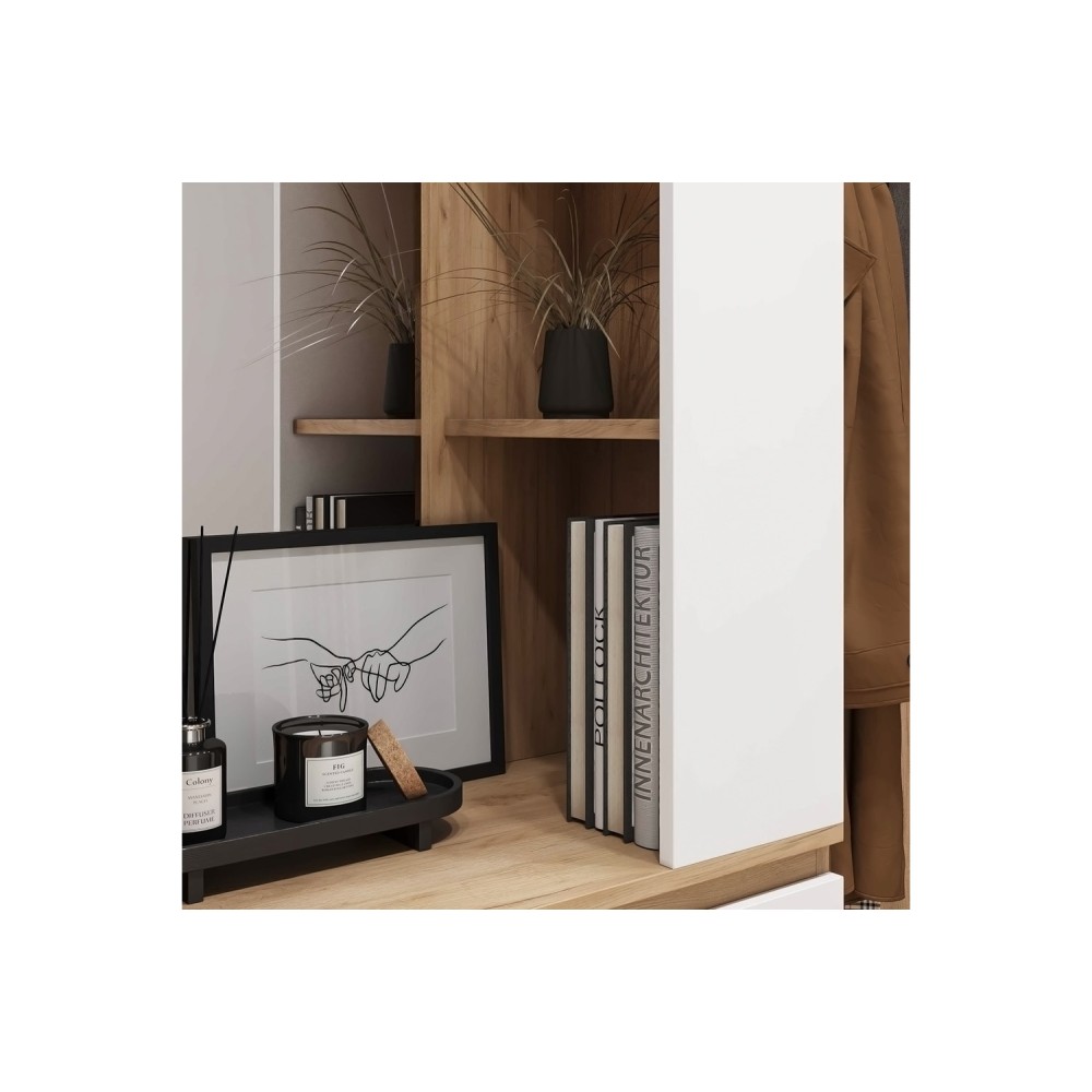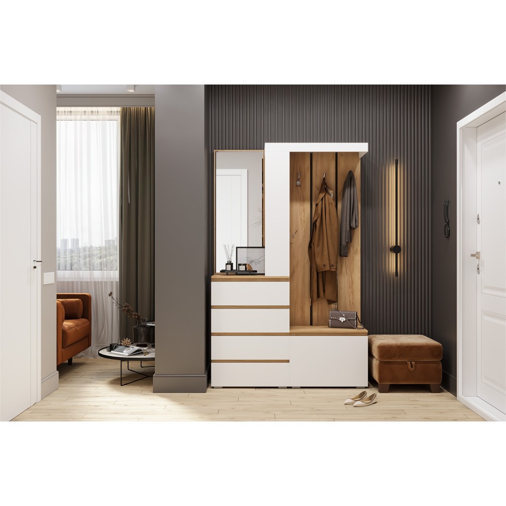 Прихожая Крона компактна и при этом вместительна. Она состоит из открытой части - отделение для верхней одежды с крепкими металлическими крючками, закрытой тумбы для обуви, выдвижных ящиков для бережного хранения одежды, головных уборов и сумок и зеркала.