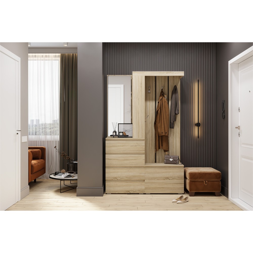 Прихожая Крона компактна и при этом вместительна. Она состоит из открытой части - отделение для верхней одежды с крепкими металлическими крючками, закрытой тумбы для обуви, выдвижных ящиков для бережного хранения одежды, головных уборов и сумок и зеркала.