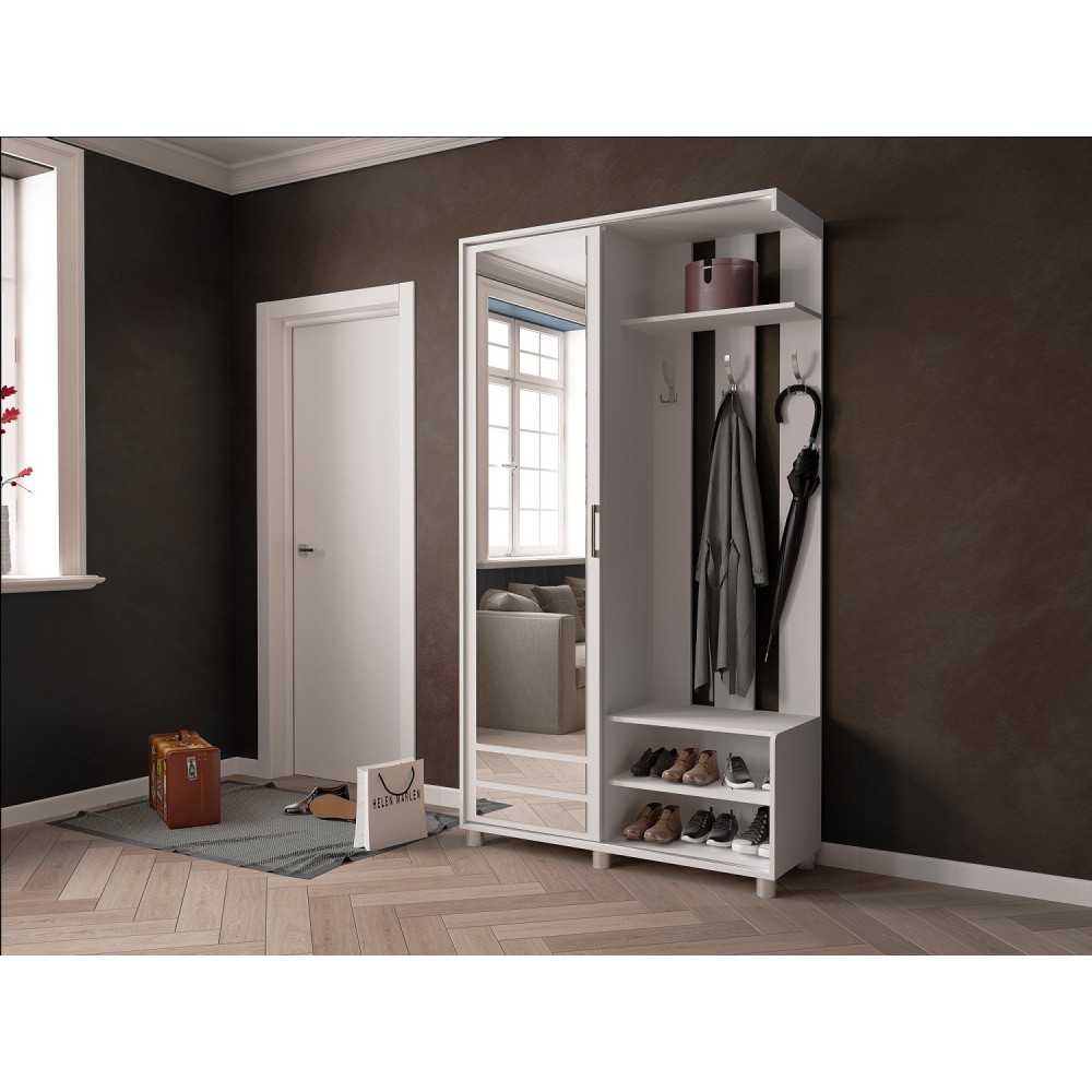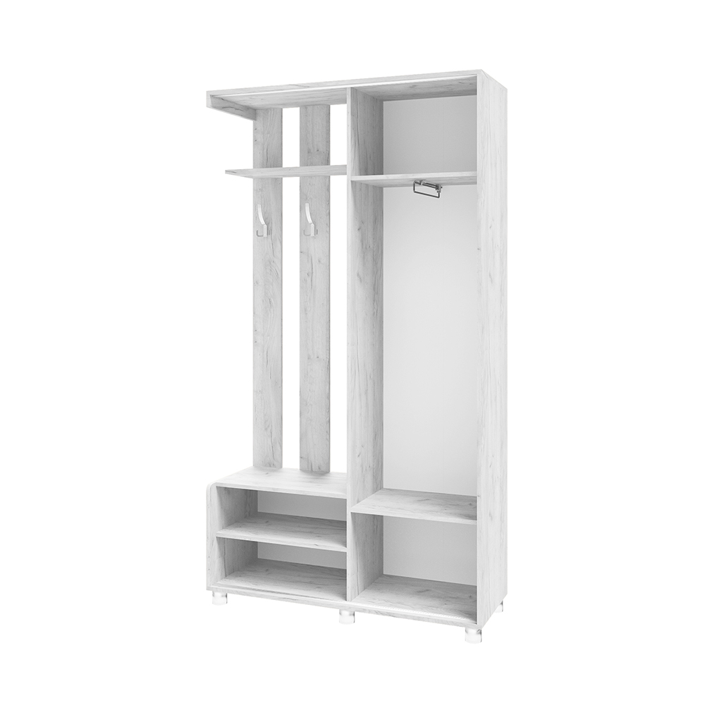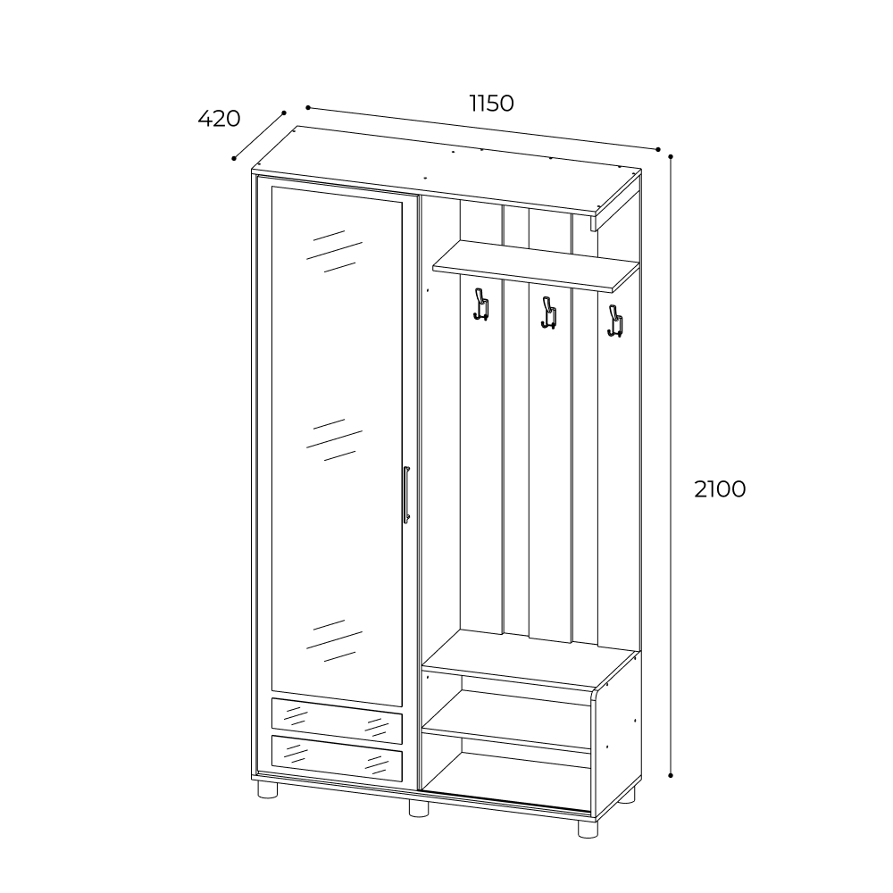 Готовое решение для прихожей Ларго-2 сочетает в себе универсальный дизайн, компактный размер и продуманное наполнение. Модуль оснащен евроштангой за зеркальной дверцей для верхней одежды на плечиках, 2-мя закрытыми полками, открытой тумбой под обувь, 3-мя надежными крючками и верхней полкой для аксессуаров. Это отличный вариант для организации храния в малогабаритной прихожей или узком коридоре.
