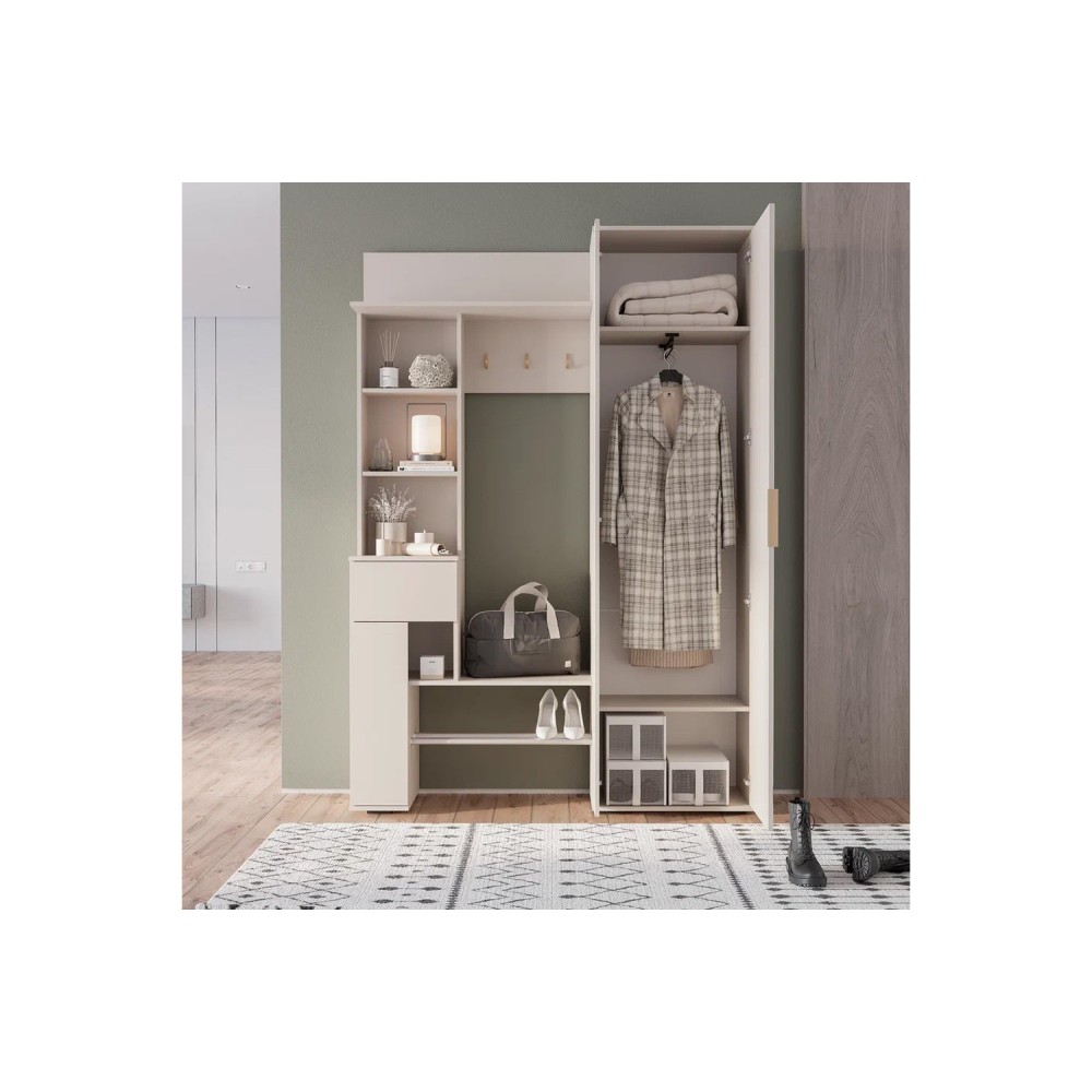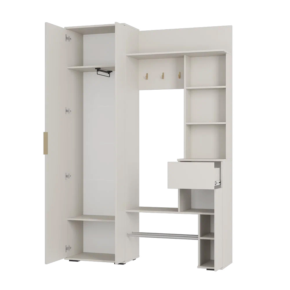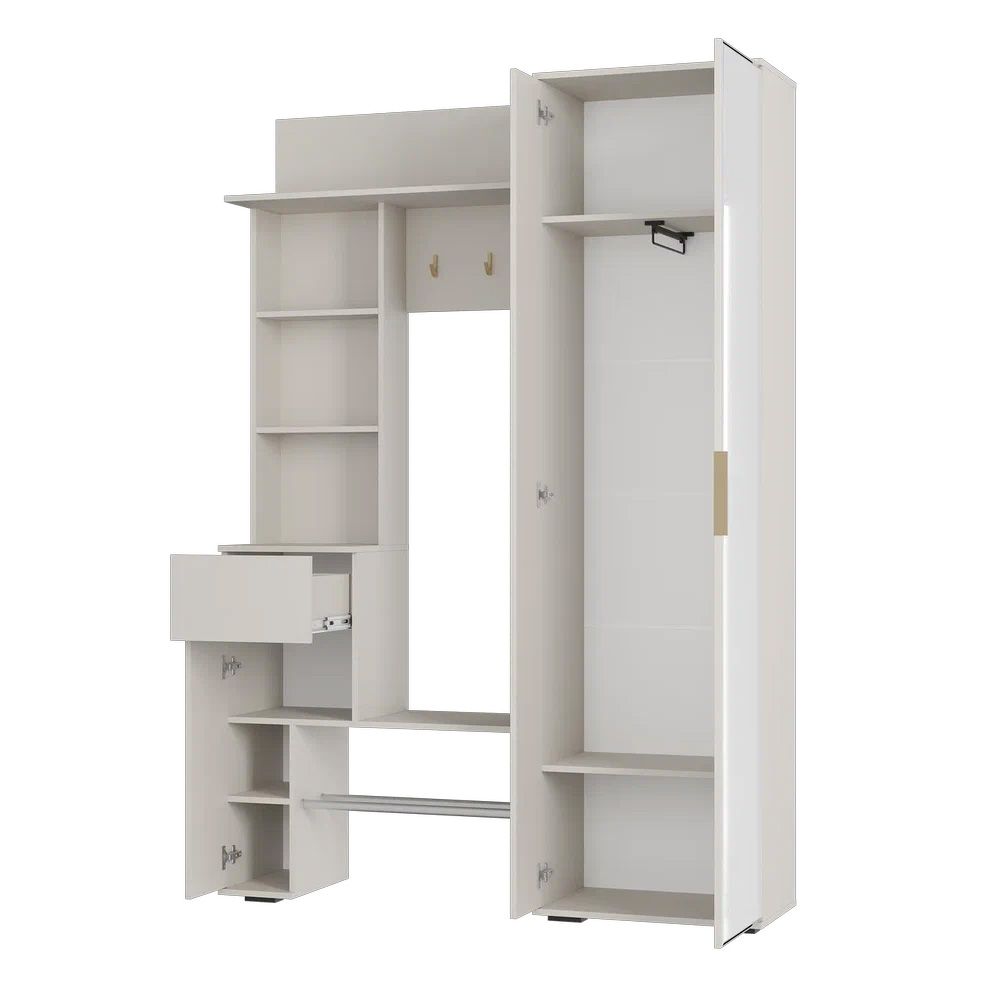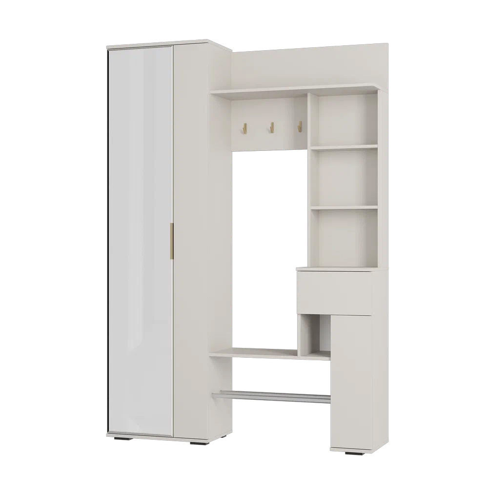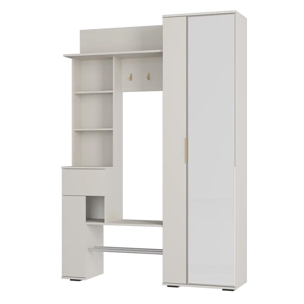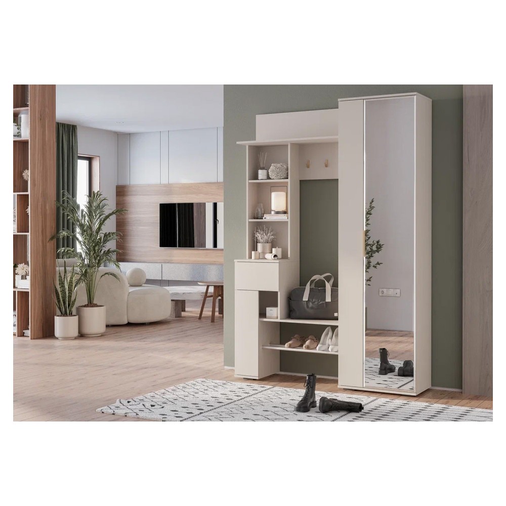 Прихожая "Ницца" выполнена в трендовом оттенке "кашемир". Модель включает в себя: большой шкаф для верхней одежды, полку под сумки и головные уборы, обувницу с металлическими рейками с защитой от промокания, множество полок для мелочей, компактный ящик с шариковыми направляющими полного выдвижения. яркий акцент на фасаде: стильная торцевая ручка и крючки в цвете "матовое золото", удобное зеркало в полный рост добавит пространству света.