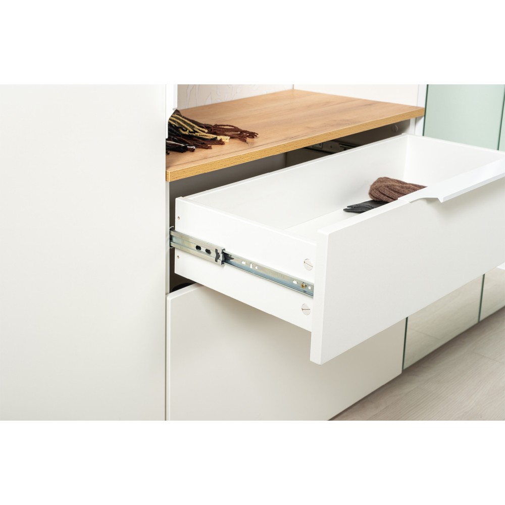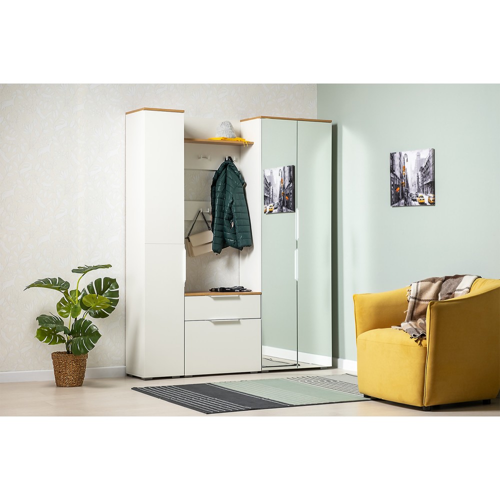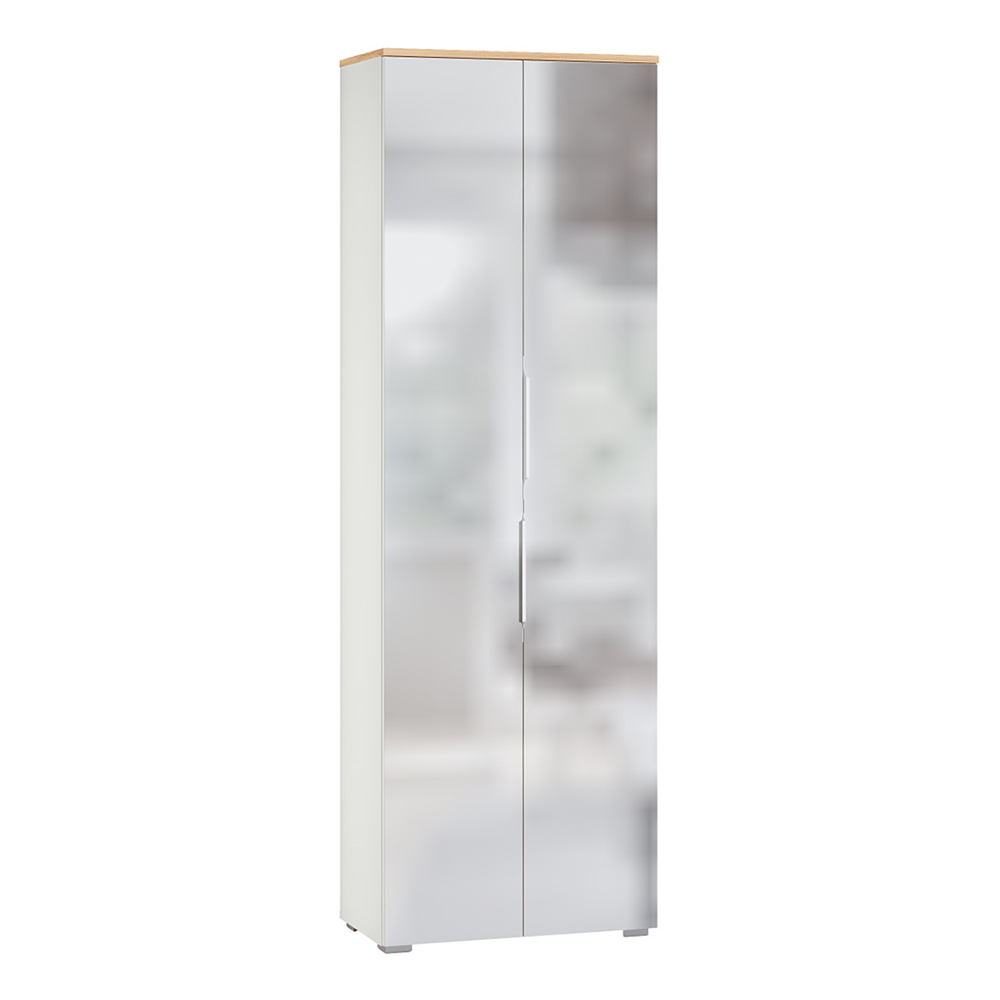 Зеркальные створки шкафа визуально расширяют пространство, а минималистичные алюминиевые ручки подчеркивают легкость и простоту линий.