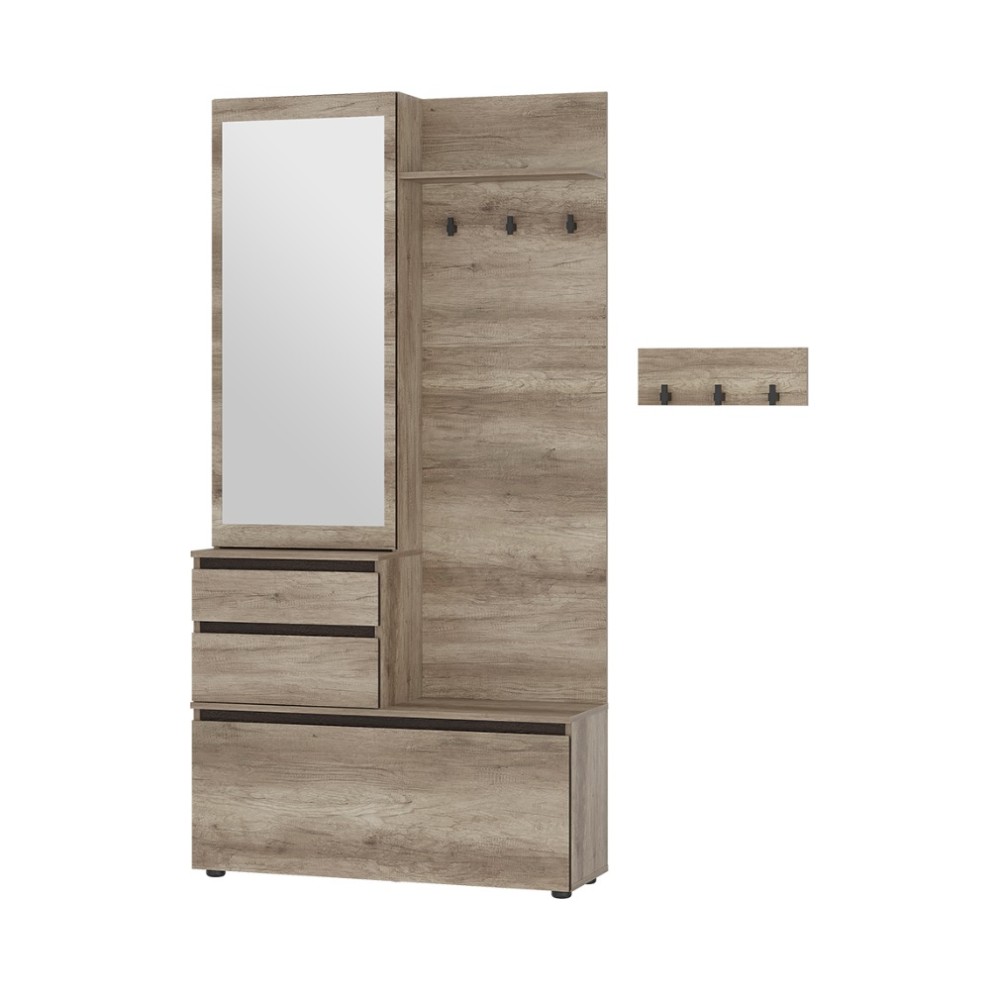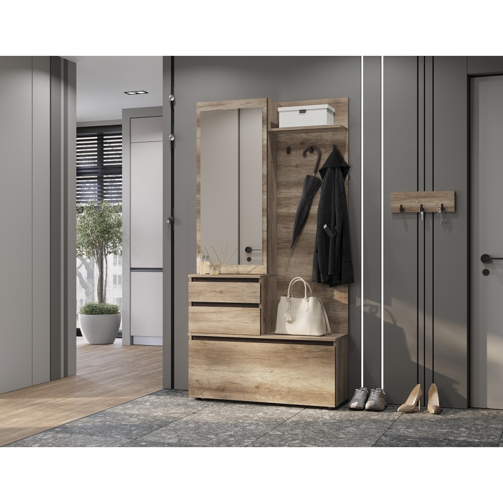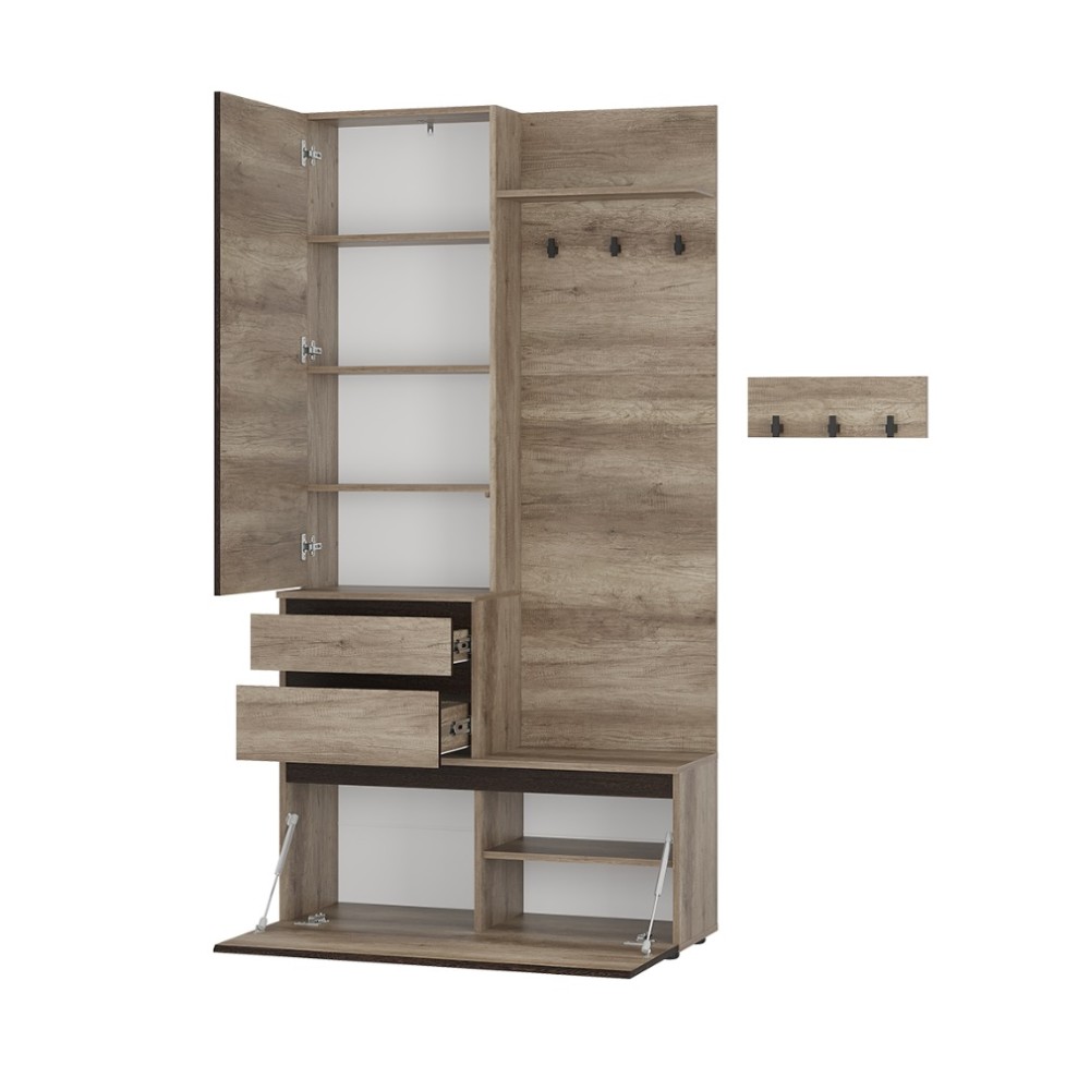 «Энигма» — лучший выбор для небольшой прихожей. Модель оснащена зеркалом, вместительными ящиками для мелочей и аксессуаров, а также просторным отсеком с дверцей для обуви. Верхнюю одежду можно разместить в отдельной зоне. Для головных уборов в прихожей также предусмотрена специальная полка. Ключница в комплекте.