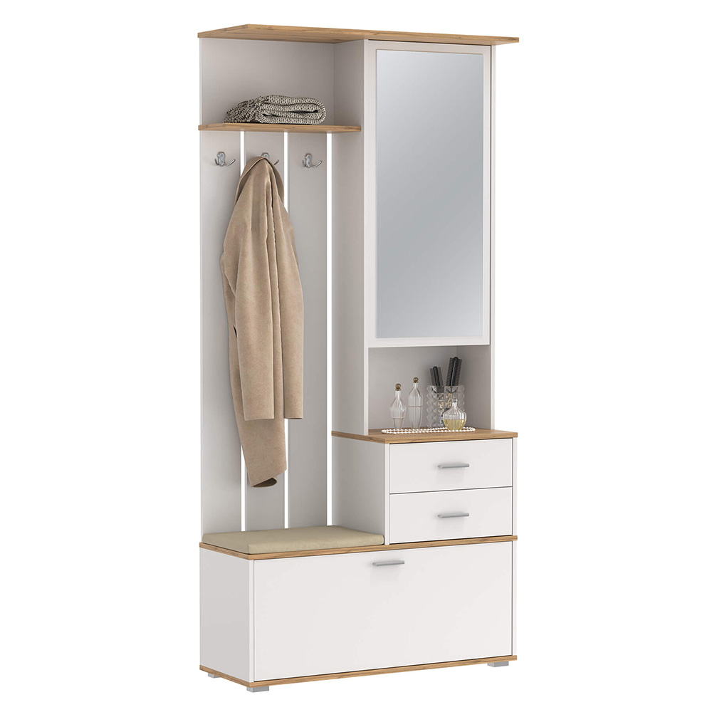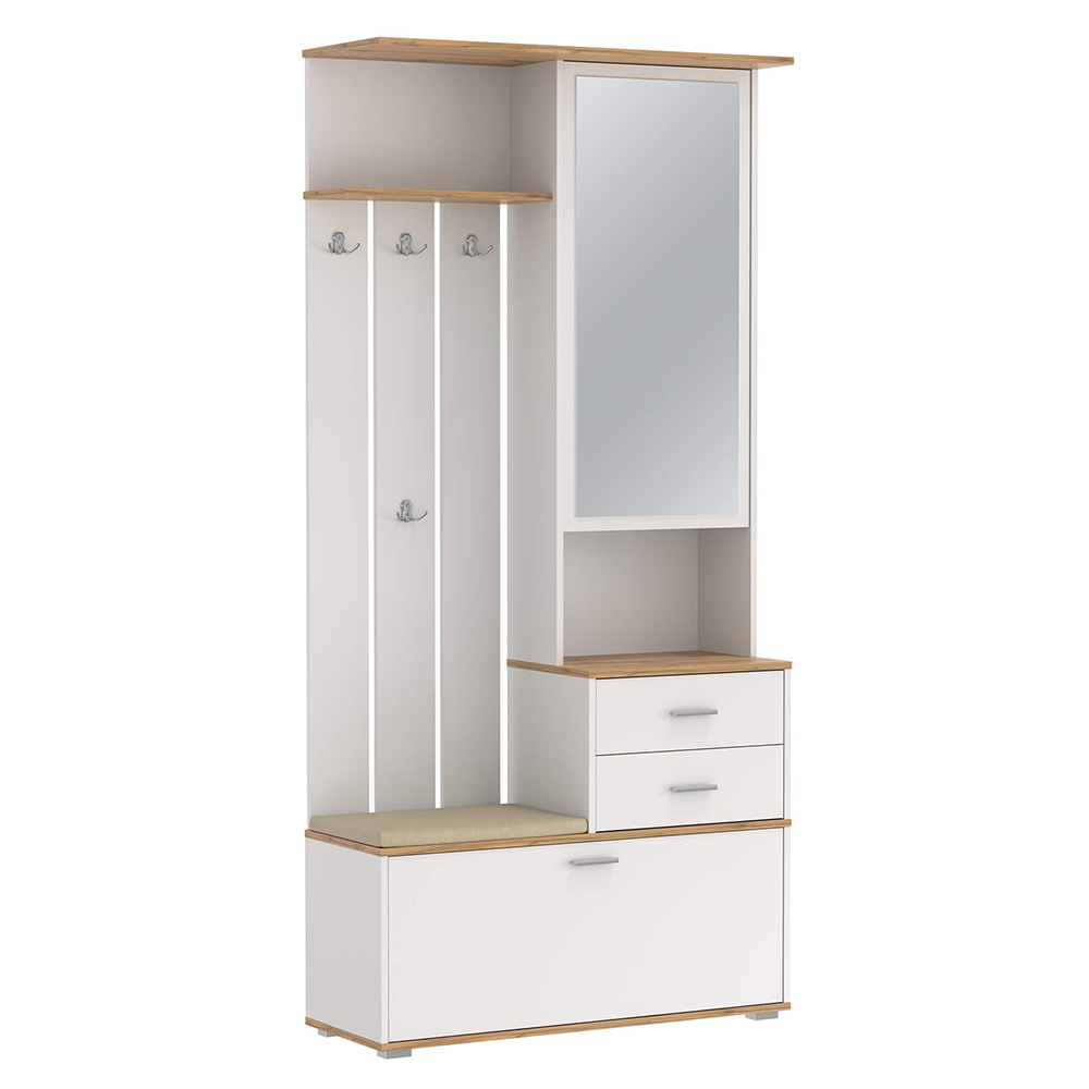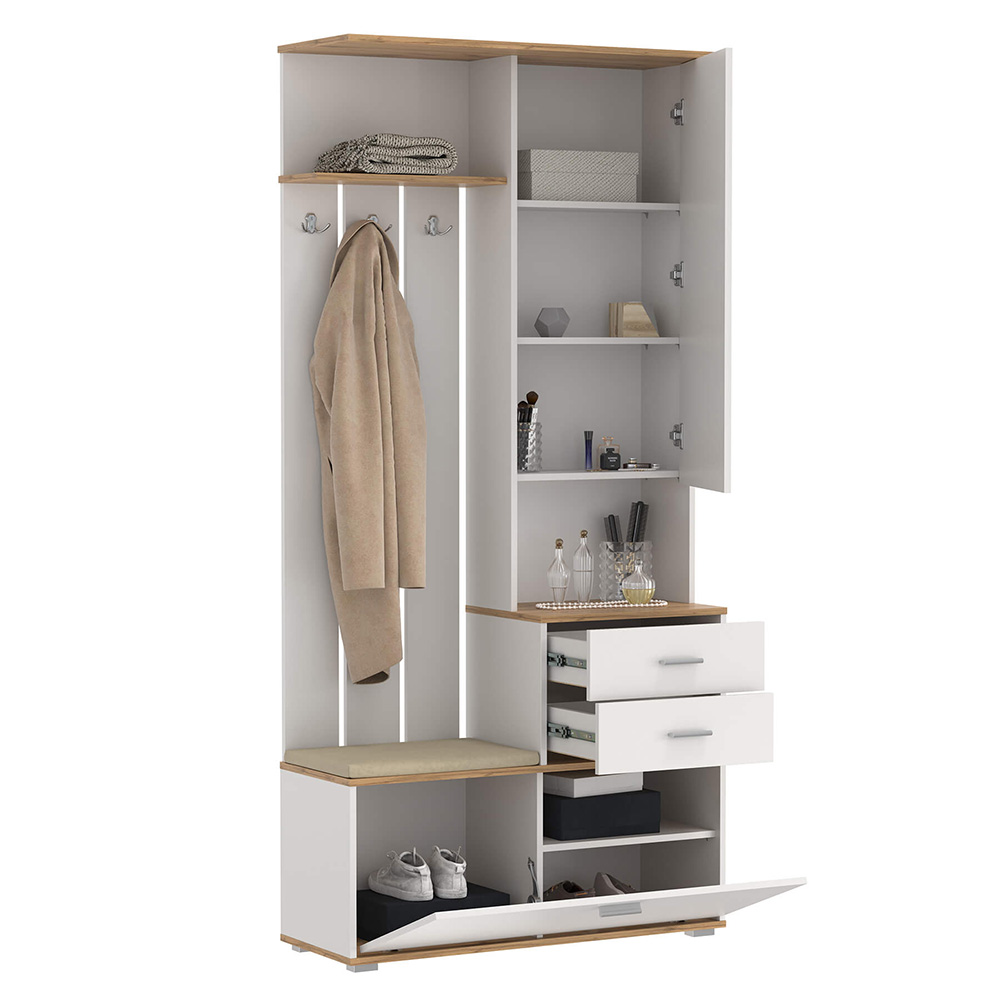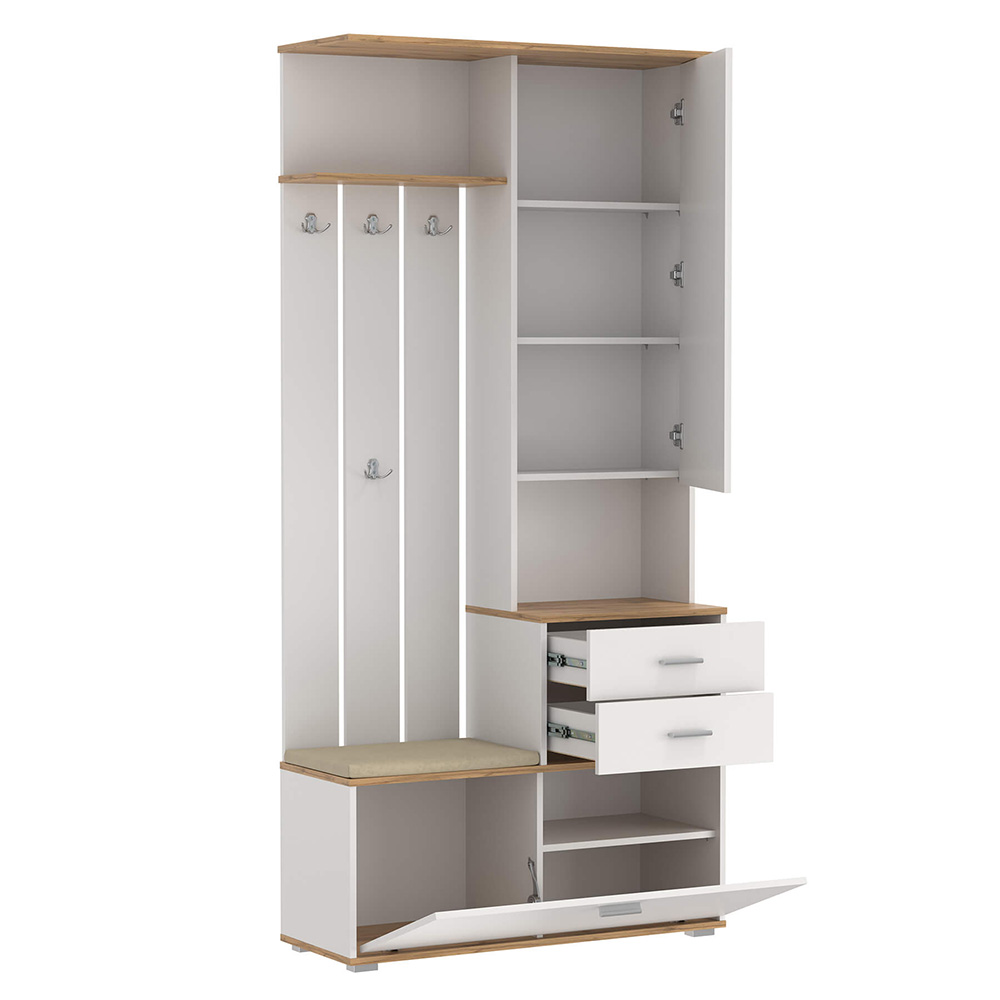 Модуль включает открытую вешалку с крючками для комфортного хранения одежды, два выдвижных ящика для мелких предметов и встроенную обувницу за откидной дверцей.