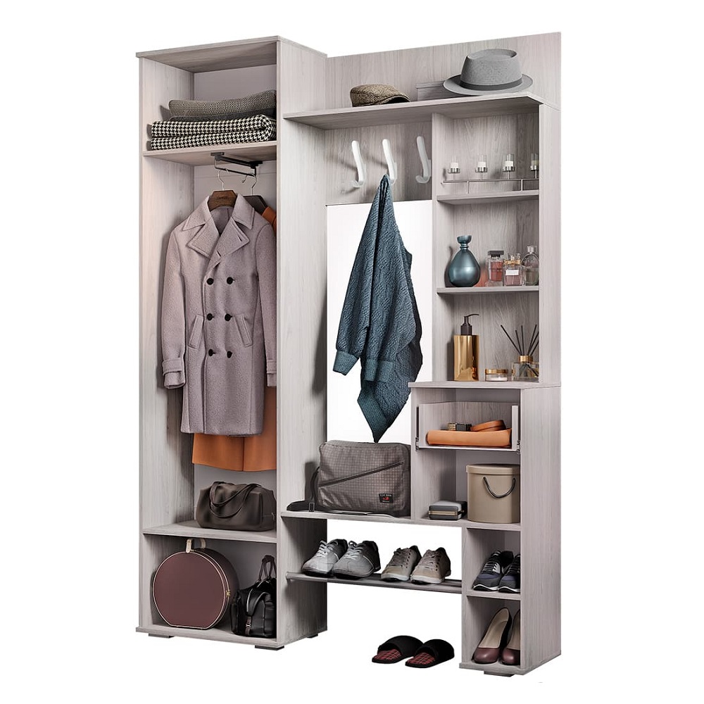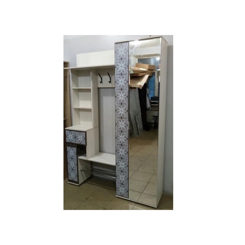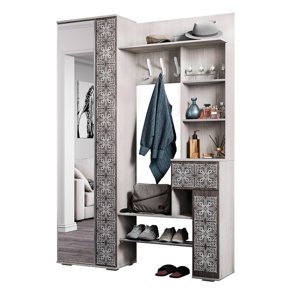 Прихожая Шанель станет украшением входной зоны. Модель представлена сочетанием двух оттенков ясеня и декорирована орнаментом на фасадах. В дверцу распашного шкафа встроено большое зеркало, которое позволит Вам держать внешний вид под контролем.
