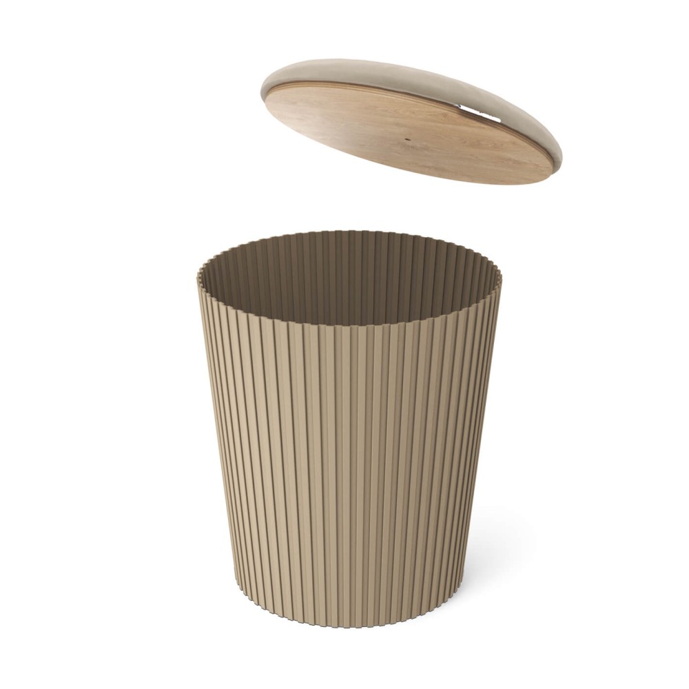 Верхняя часть пуфика открывается, образуя удобное внутреннее пространство для хранения. Внутрь можно убрать пледы, журналы, аксессуары или другие мелочи, поддерживая порядок и визуальную чистоту интерьера. Такое решение делает пуфик не только декоративным элементом, но и практичным помощником в повседневной жизни.