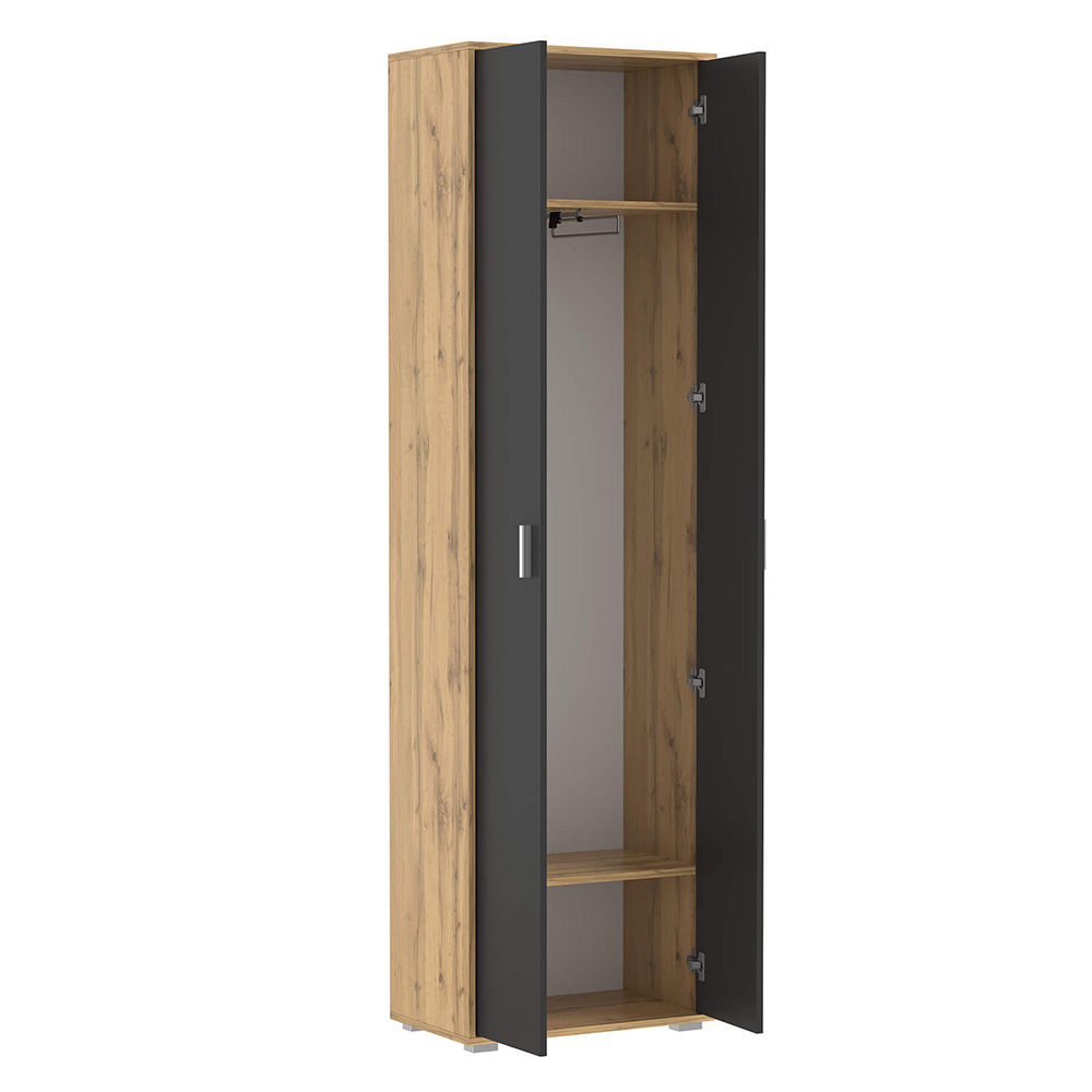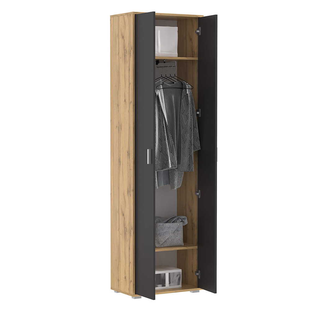 плечиках, обеспечивающая быстрый доступ и комфортное размещение вещей. Внизу шкафа предусмотрена полка, разделяющая пространство на секции для обуви или других предметов, что