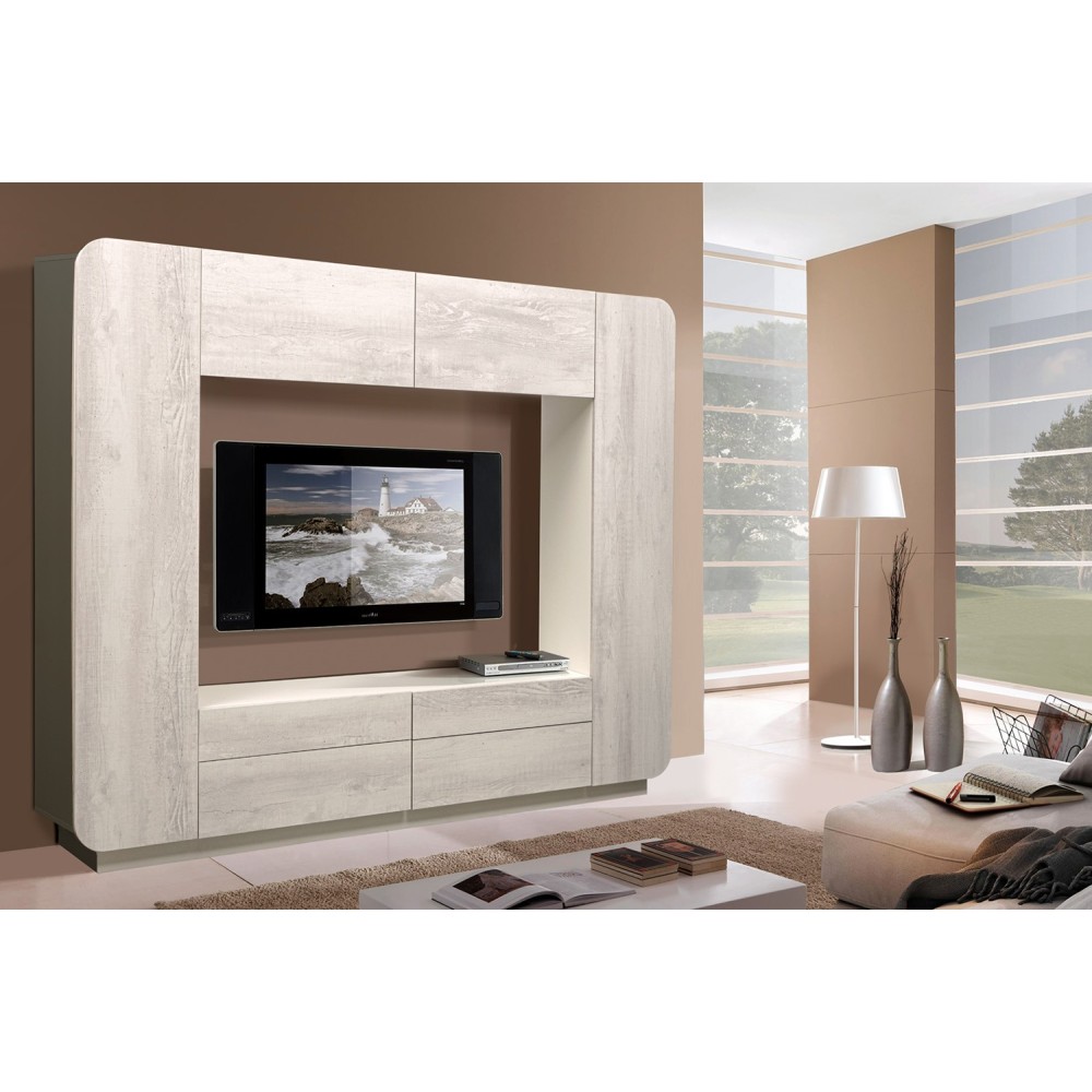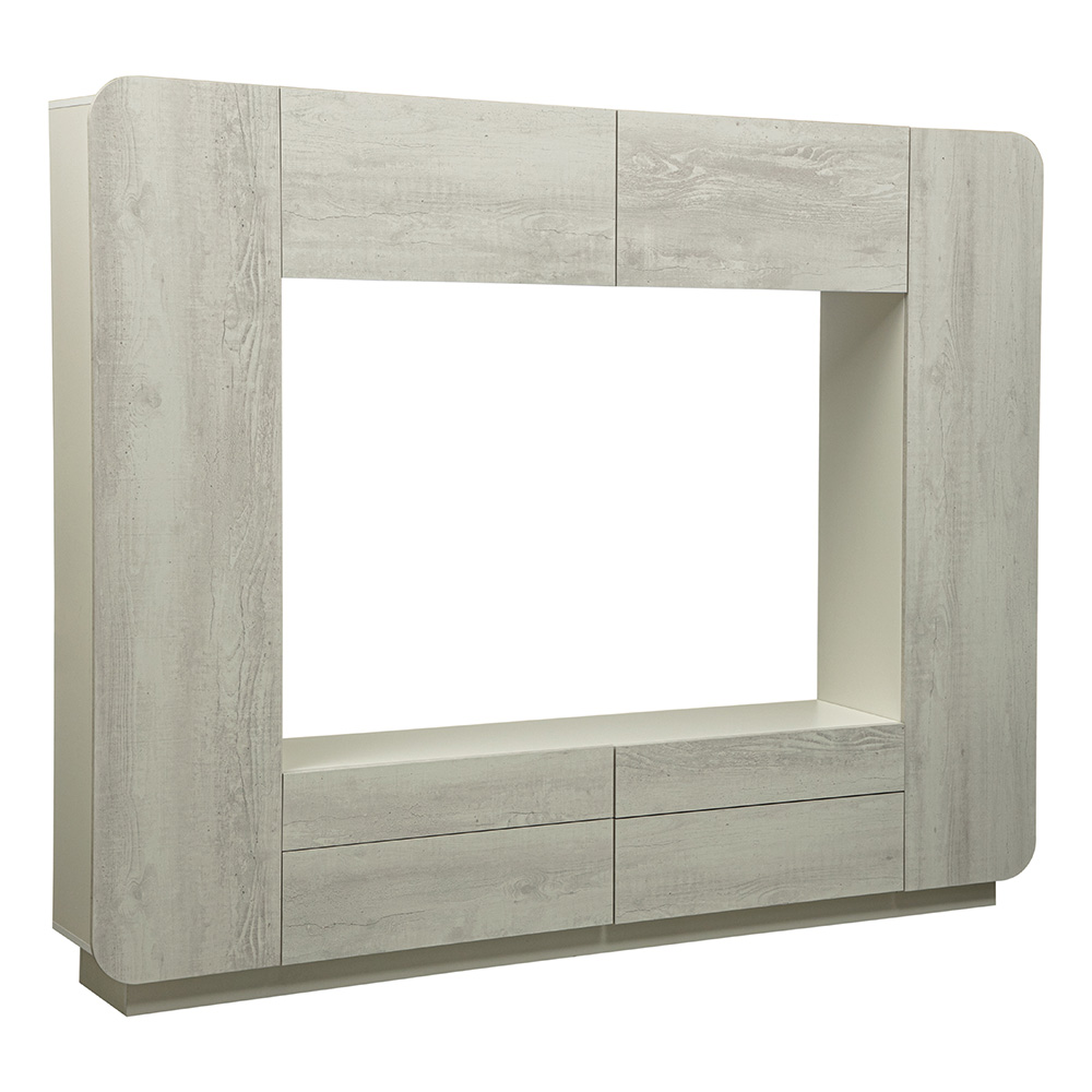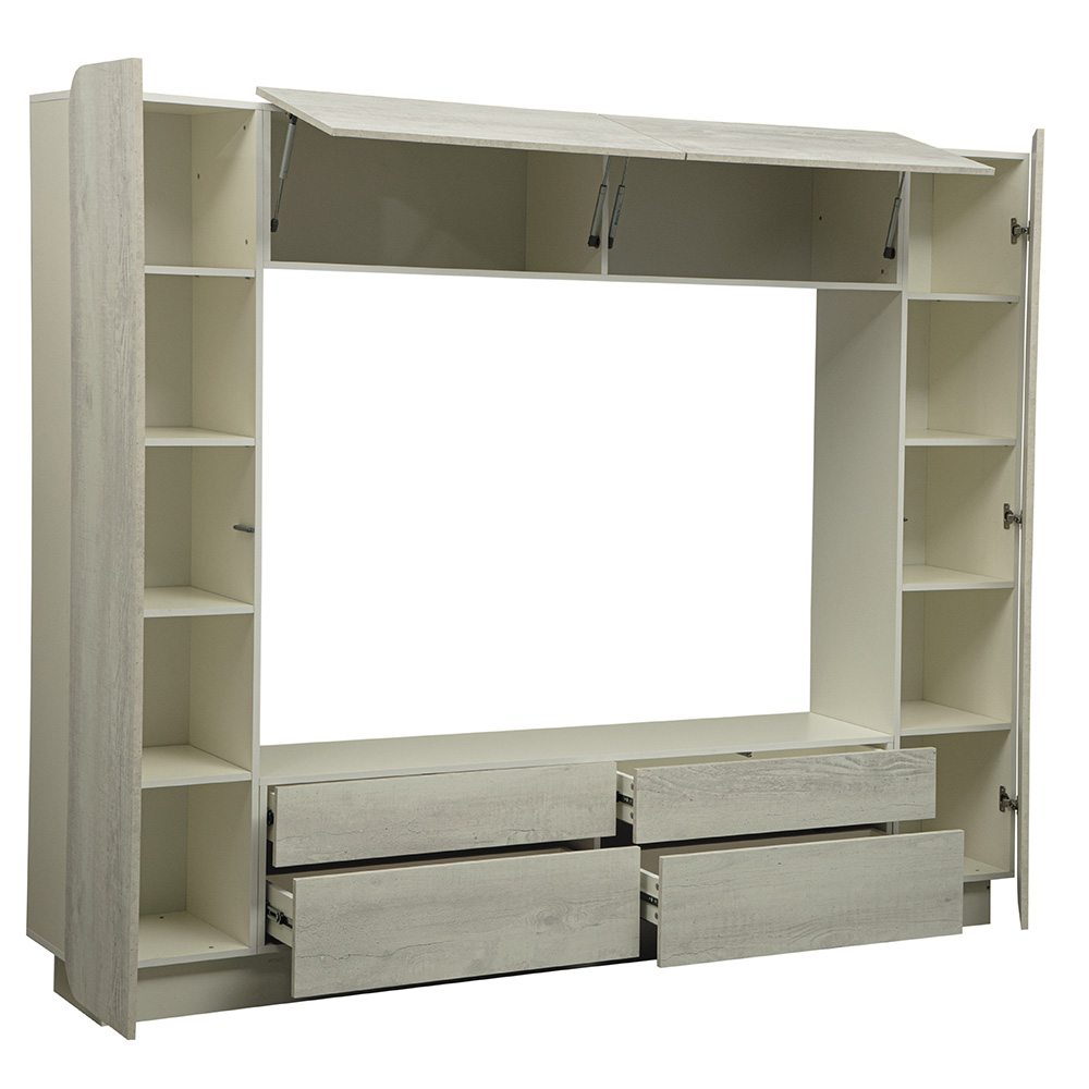 В его конструкцию входят: два шкафа-стеллажа со множеством полок, большие полки сверху, вместительные выдвижные ящики снизу и место для ТВ и аудио-техники.