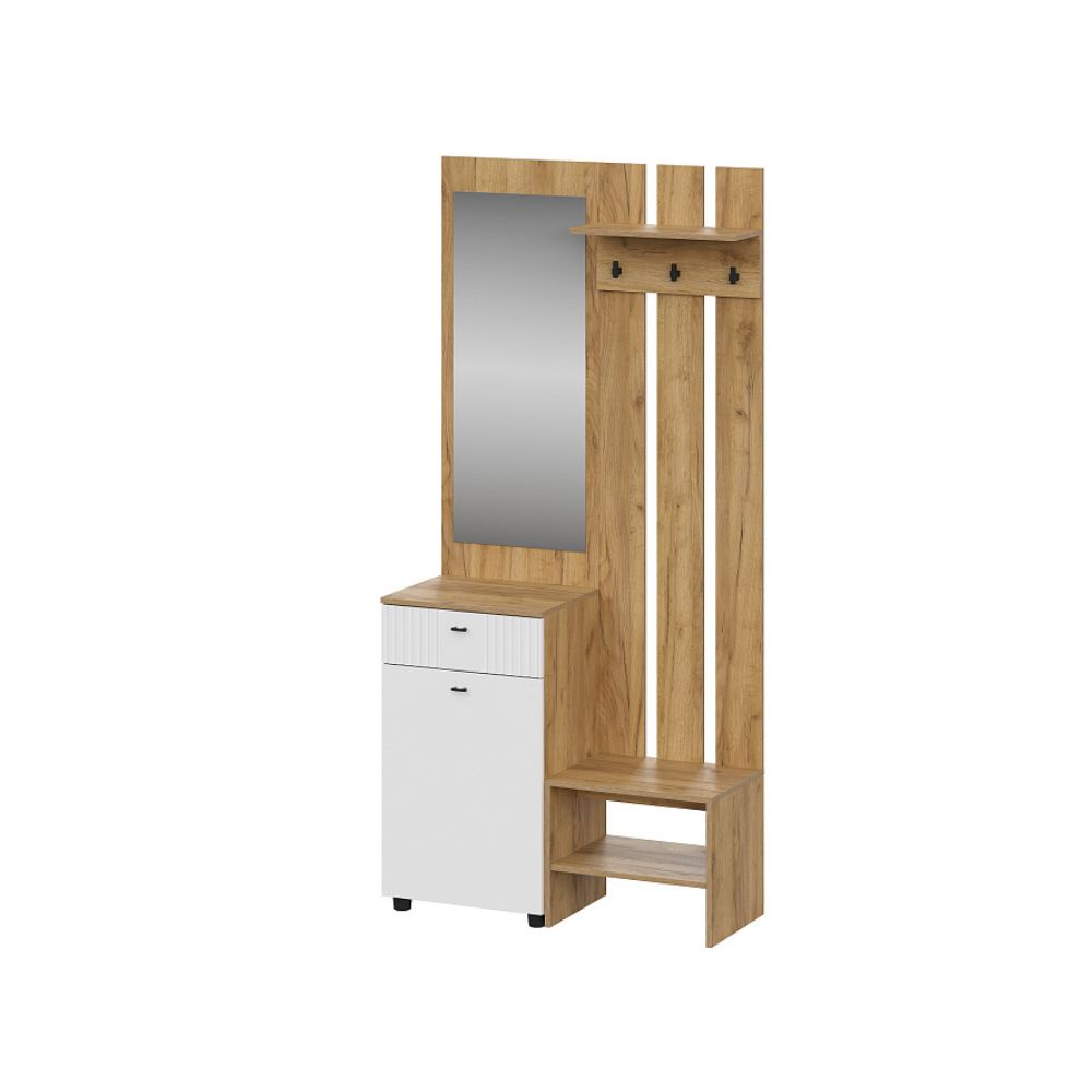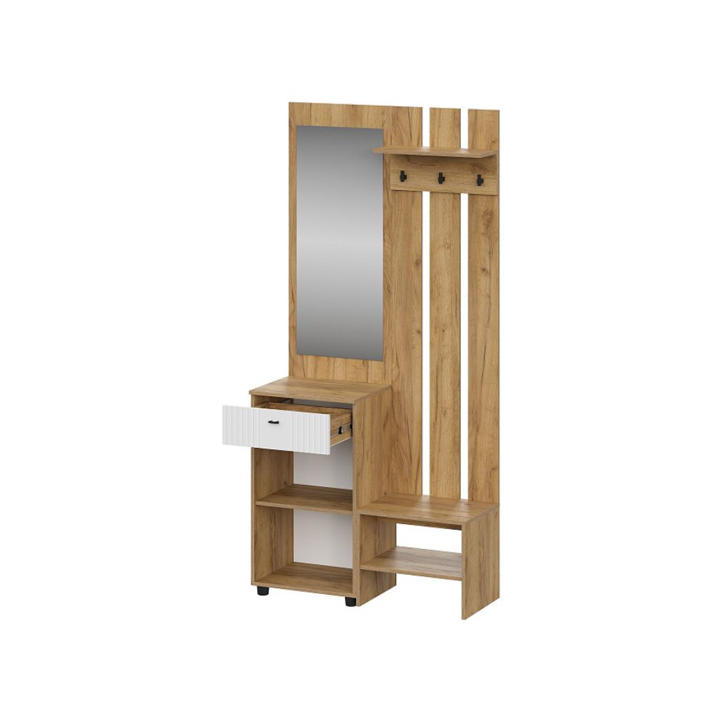 Вешалка Милан 1 в полной мере решит вопрос хранения в мини-прихожей. Имеет крючки для одежды, обувницу с открытыми полками, выкатной ящик для сезонных аксессуаров и мелочей, закрытую секцию и зеркало.
