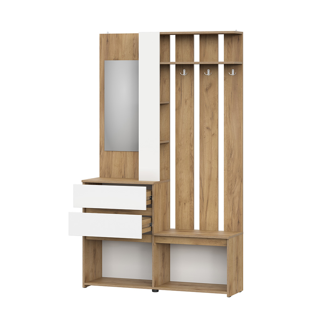 Вешалка Некст 1 поможет организовать систему хранения гардероба в современном интерьере. Для вашего удобства предусмотрены двухрожковые крючки для повседневной верхней одежды, широкая верхняя полка для головных уборов и шарфов, ниша для обуви, а также выдвижные ящики. За распашным фасадом находятся небольшие полки. Зеркало позволит оценить внешний вид перед выходом из дома.