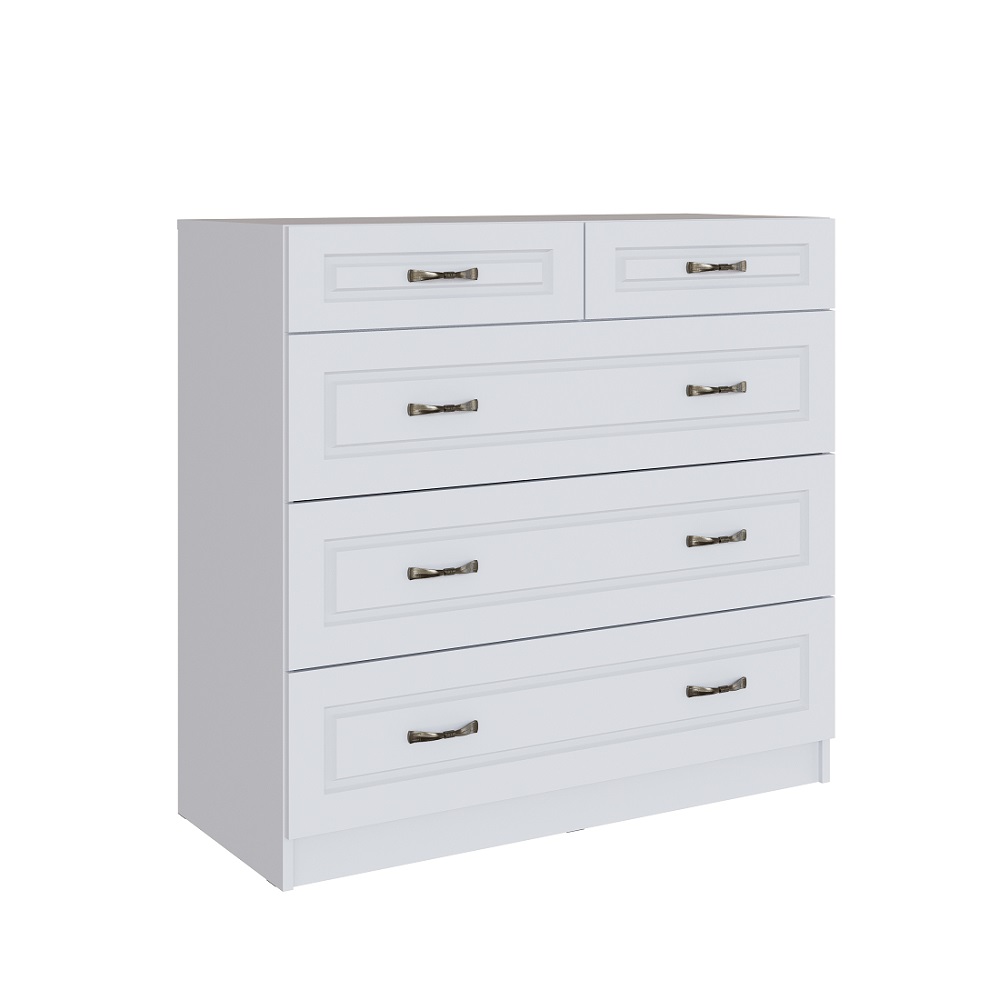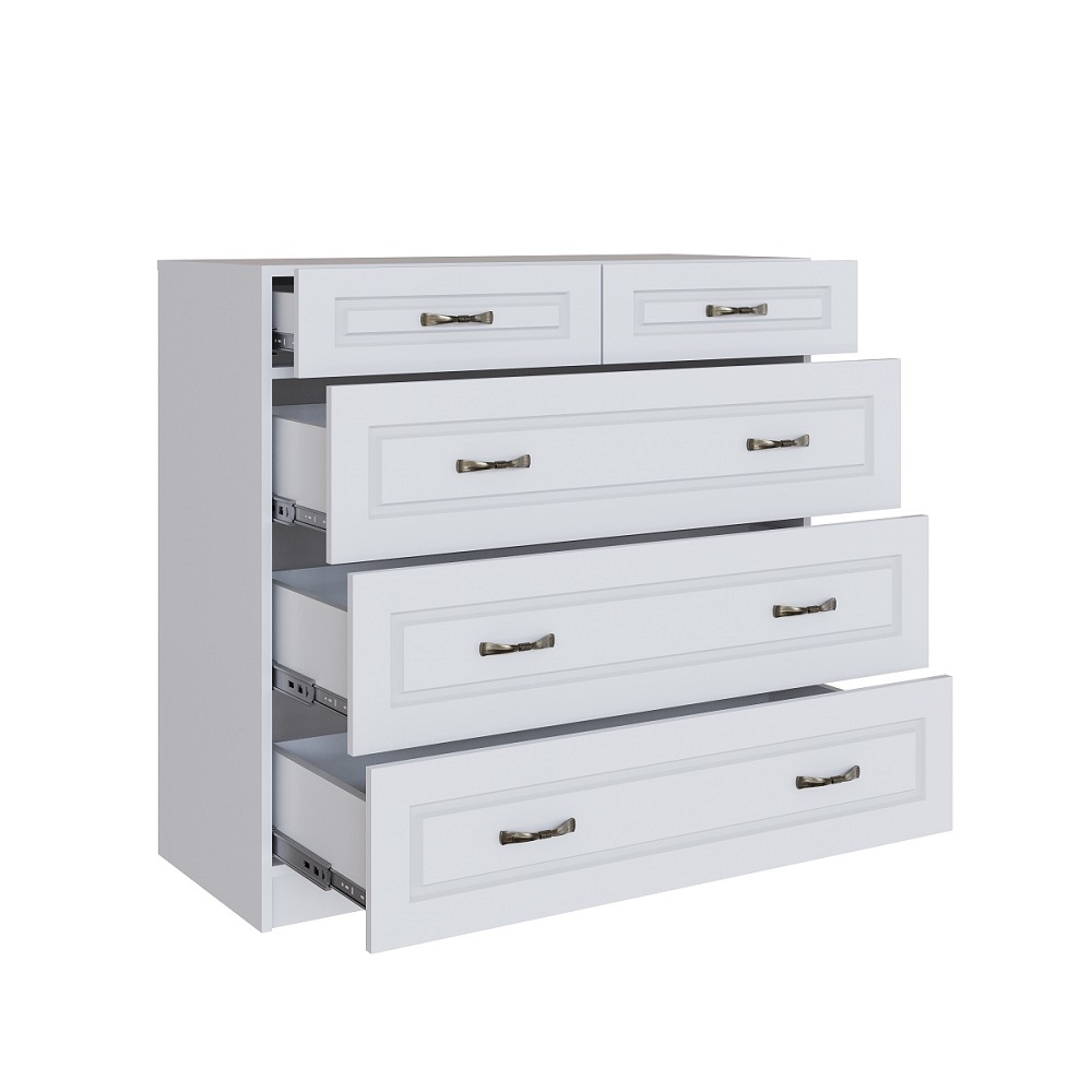 Комод Апполия выполнен в классическом стиле: сочетание белого цвета с тиснением с белым дубом, фрезерованные фасады, элегантные ручки. Ящики оснащены направляющими полного и плавного выдвижения.
