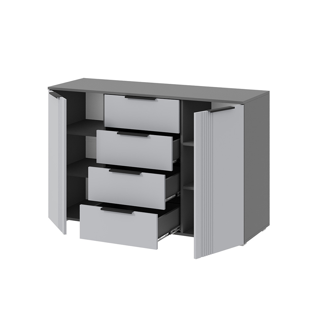 Комод из модульной серии Альмерия дополнит современный интерьер комнаты. Вместительные ящики и полки за распашными дверьми позволят организовать место хранения белья и одежды, аксессуаров и других нужных предметов.