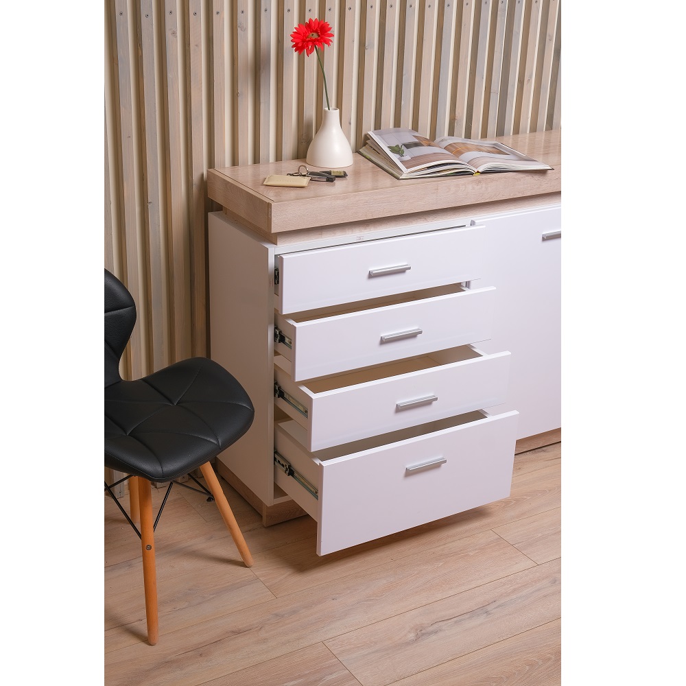 - Корпус ЛДСП 16 мм в декоре «Дуб Сакраменто» и фасад МДФ 16 мм в декоре «Белый снег глянец»