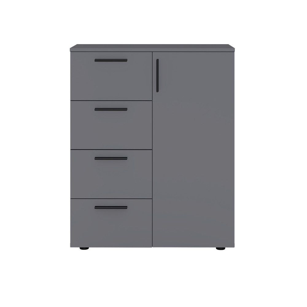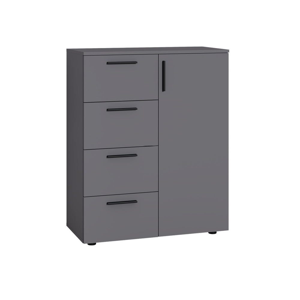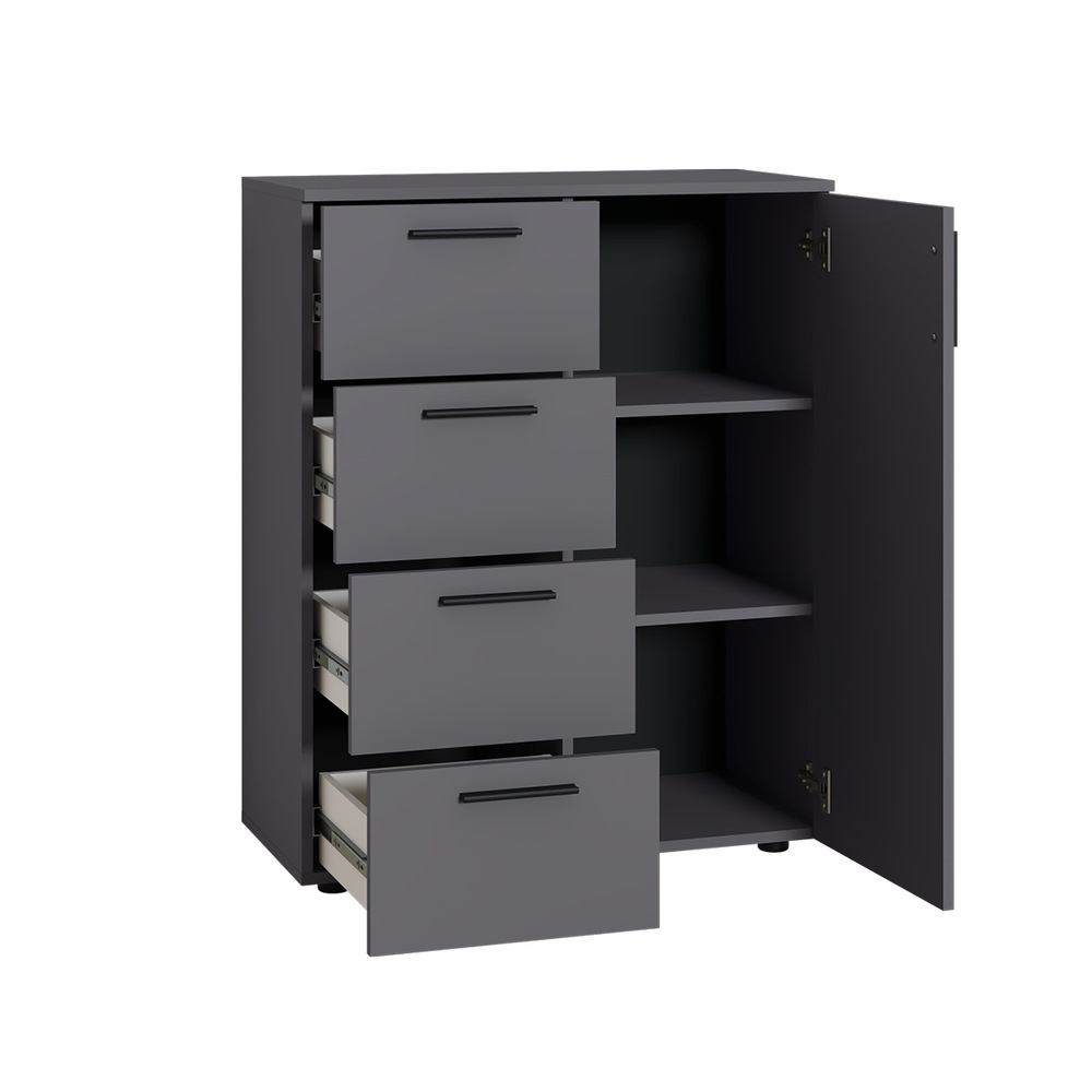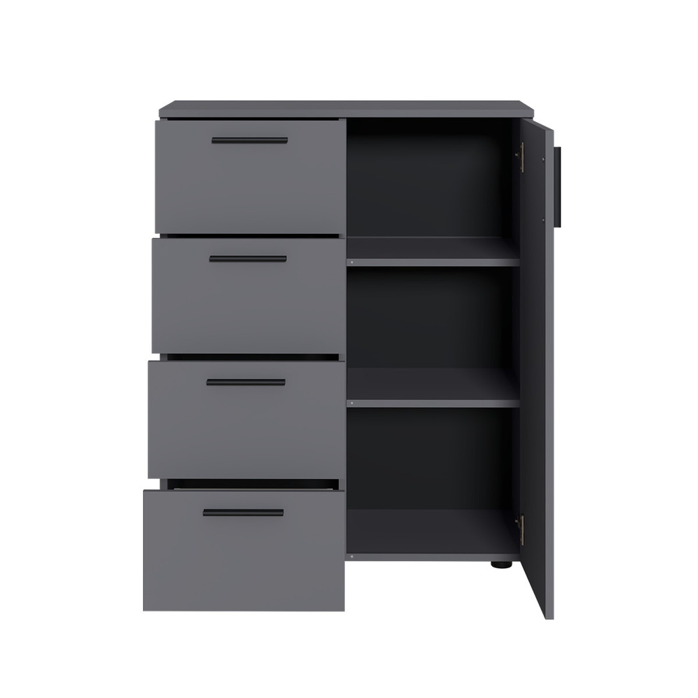 Комод с ящиками из модульной серии Эйр дополнит современный интерьер комнаты. Четыре вместительных ящика и полки за распашными дверьми позволят организовать место хранения белья и одежды, аксессуаров и других нужных предметов.