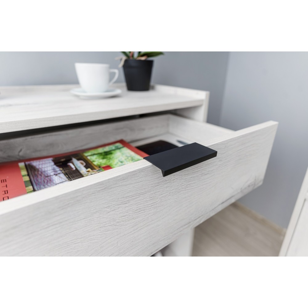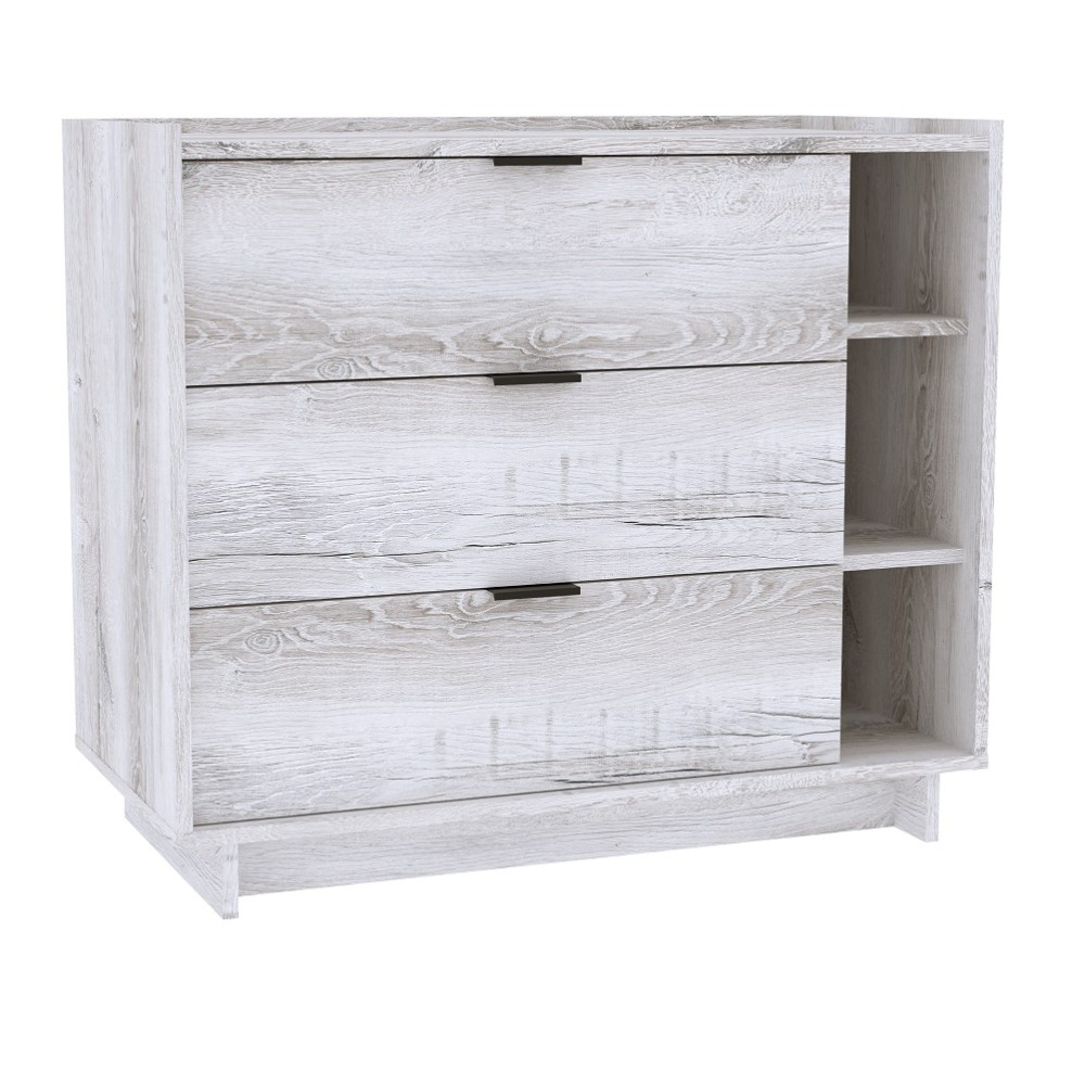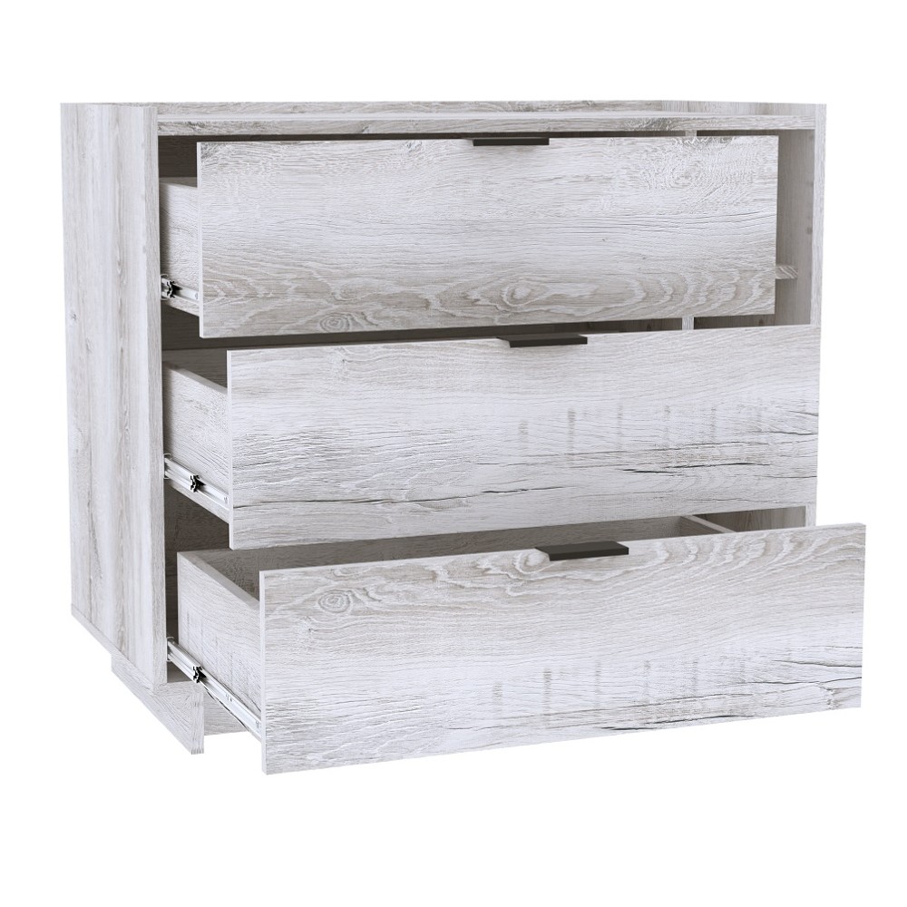 Комод с ящиками - ФЛЕКС 6 Комод - в светлом цвете Дуб Шавиниган выполнен из ЛДСП класса эмиссии Е1 толщиной 16 мм. Комоды - это удобная и стильная система хранения, предназначенная для небольшого помещения, поэтому комод ФЛЕКС 6 шириной 90 см отлично дополнит любую комнату: гостиную, спальню, прихожую или комнату подростка. Ящики оснащены шариковыми направляющими полного выдвижения, а столешница с бортиками идеально подходит, чтобы поставить принтер или телевизор. Бортики по краям защищают предметы от падения со столешницы. Навесьте над Комодом лаконичную ФЛЕКС 11 Полка навесная и получите современный интерьерный ансамбль с расширенным местом для хранения.