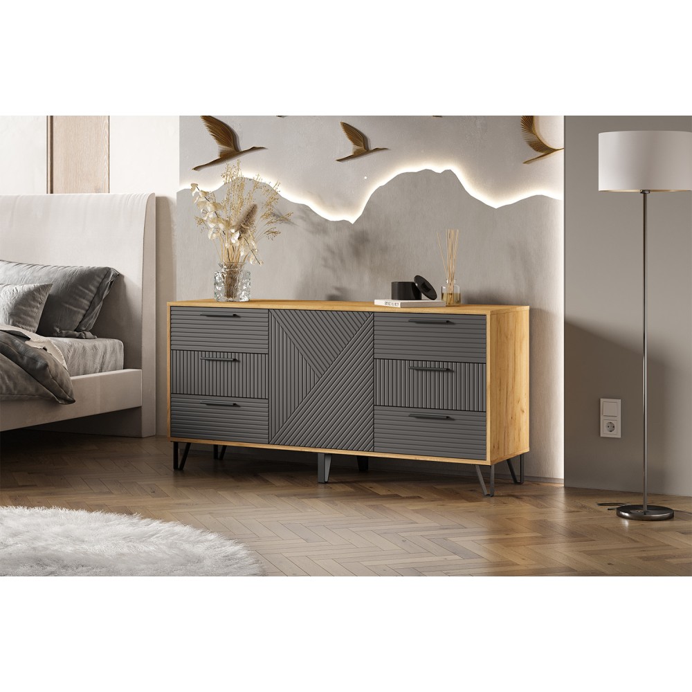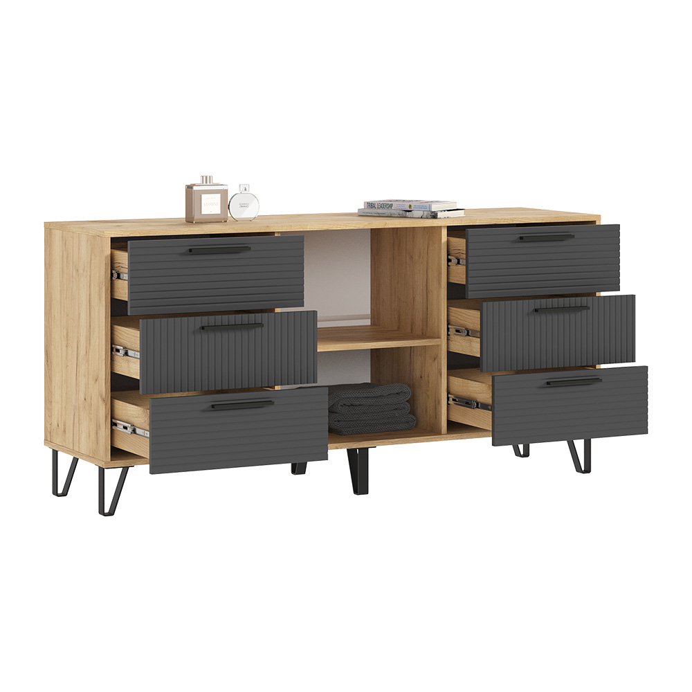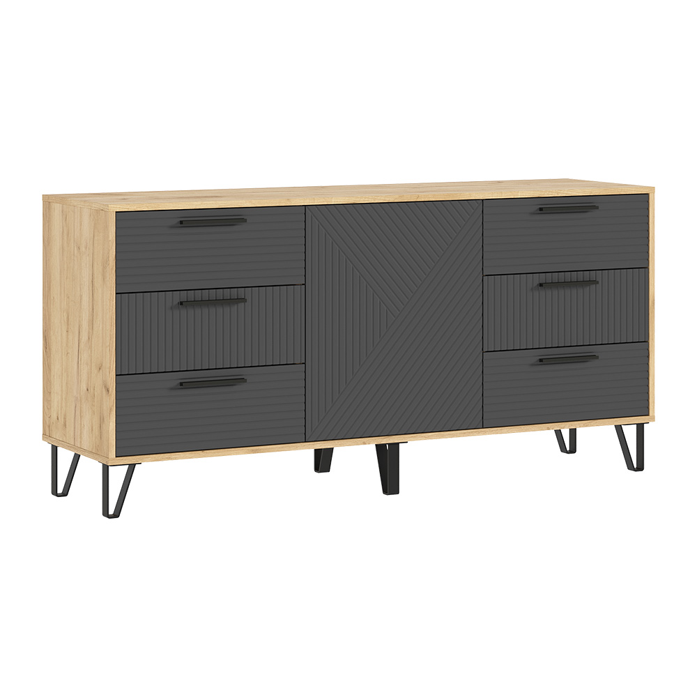 Комод с ящиками из модульной серии Флэш дополнит современный интерьер комнаты. Вместительные ящики и полки за распашными дверьми позволят организовать место хранения белья и одежды, аксессуаров и других нужных предметов.