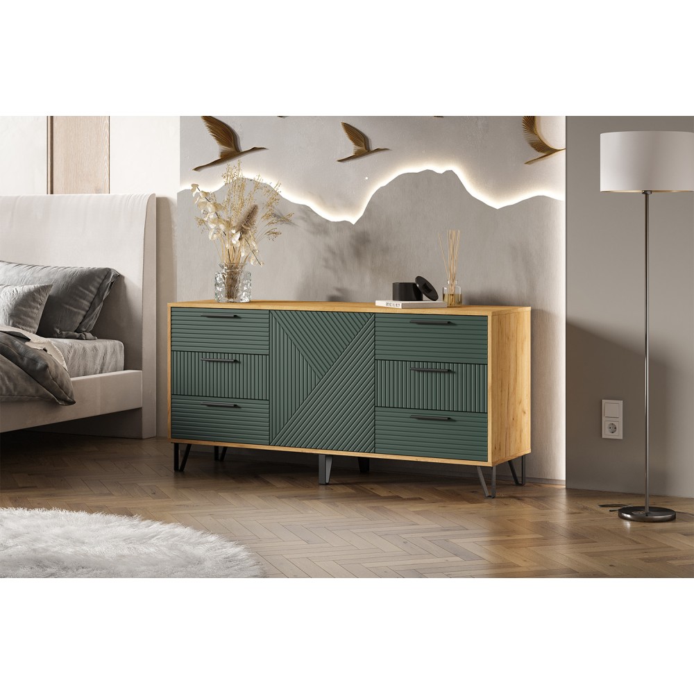 Комод с ящиками из модульной серии Флэш дополнит современный интерьер комнаты. Вместительные ящики и полки за распашными дверьми позволят организовать место хранения белья и одежды, аксессуаров и других нужных предметов.