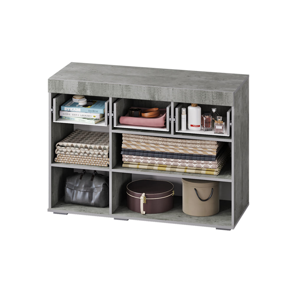 Комод состоит из трёх выдвижных ящиков и четырёх открытых полок, обеспечивая достаточно места для хранения различных предметов. Металлические ручки добавляют шарма и элегантности, а регулируемые опоры позволяют установить комод даже на неровной поверхности.