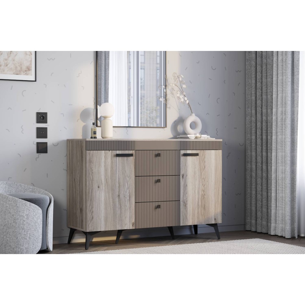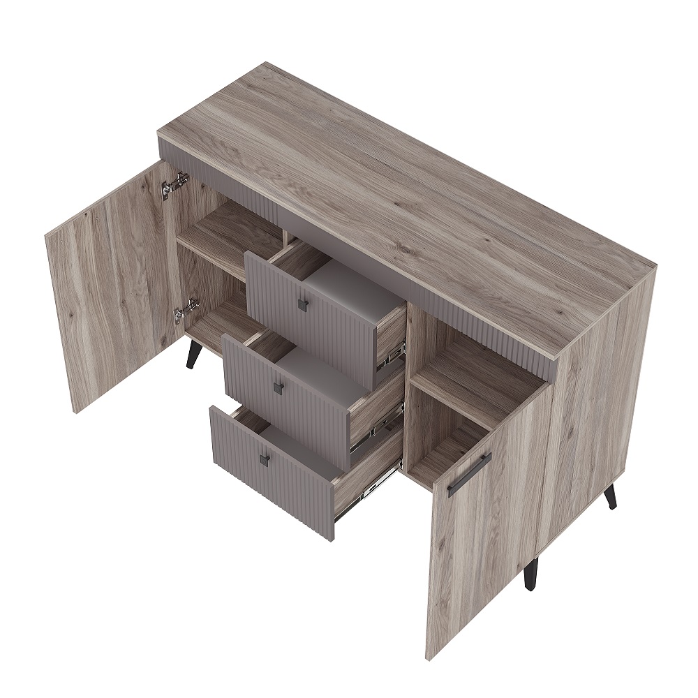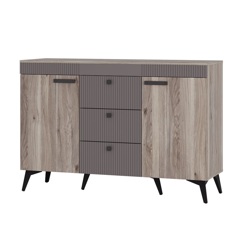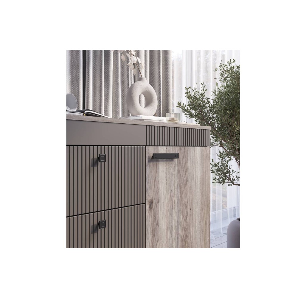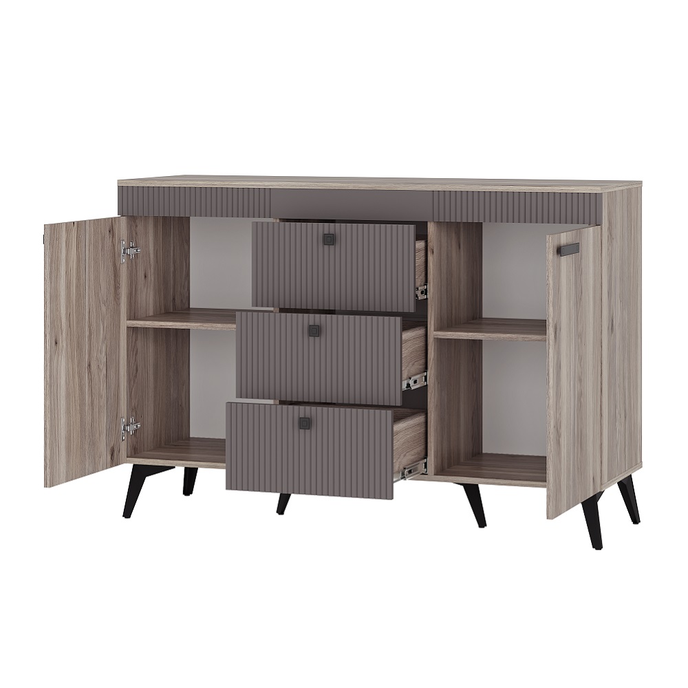 Комод «Кассандра» КМ-12 в цвете «дуб смоки» с фасадом MF14 — это стильный и функциональный предмет мебели для спальни или гостиной. Он состоит из трёх вместительных зон: двух боковых полок и центрального ящика.