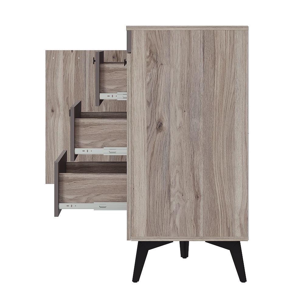 Комод Кассандра состоит из трёх вместительных зон: 2 боковые зоны с полками, а центральная состоит из трёх ящиков, в которых удобно хранить постельное бельё и мелочи.