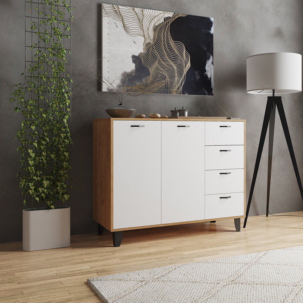 Комод Катрин-12 — это стильный и функциональный элемент интерьера, который станет отличным дополнением к вашей спальне или гостиной. Он выполнен в современном стиле и имеет комбинированную конструкцию, четыре выдвижных ящика и полки за распашными фасадами.