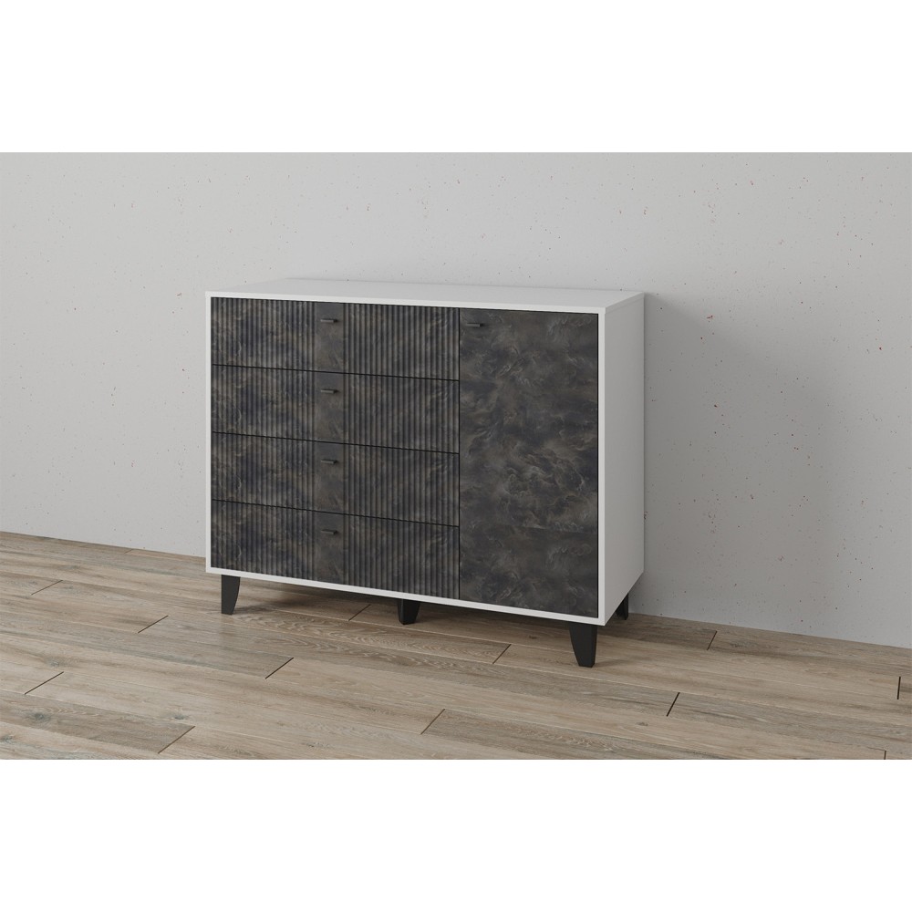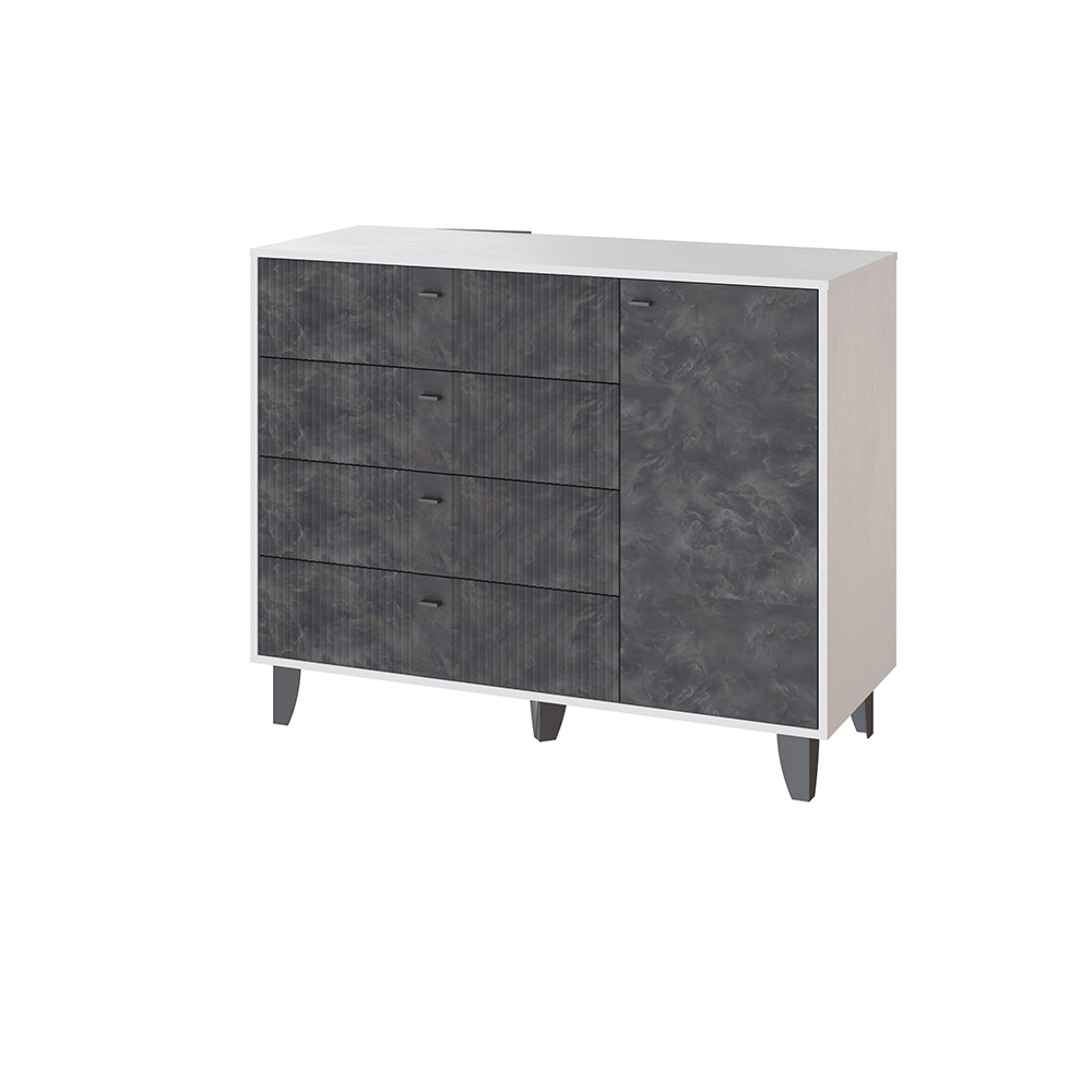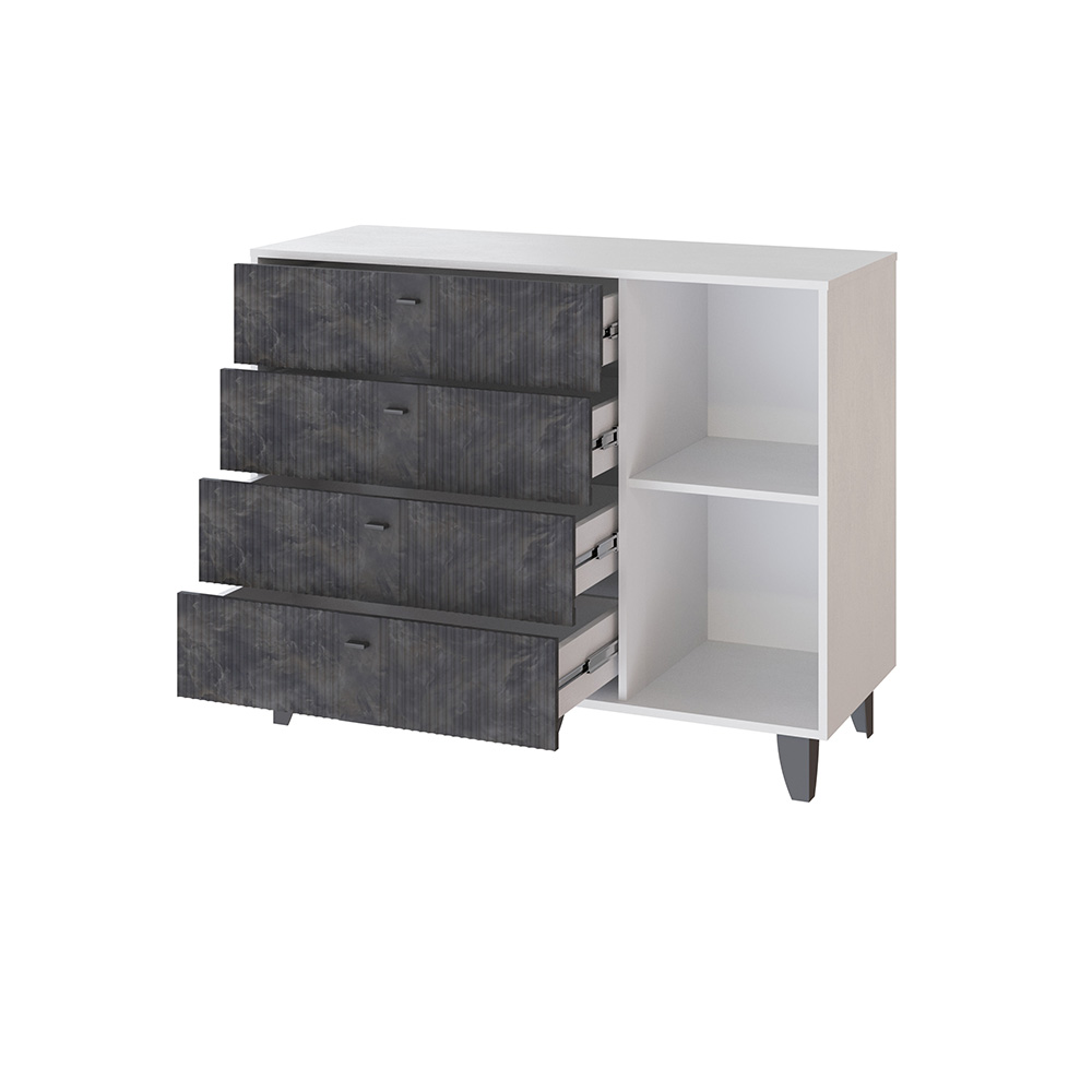 Комод Катрин-13 — это стильный и функциональный элемент интерьера, который станет отличным дополнением к вашей спальне или гостиной. Он выполнен в современном стиле и имеет комбинированную конструкцию, четыре выдвижных ящика и полки за распашными фасадами.